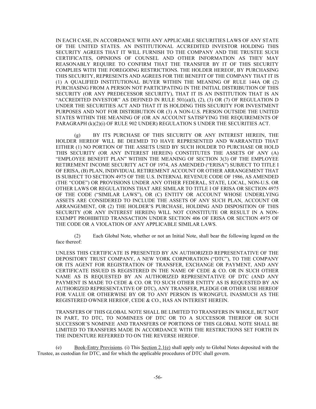 -56- IN EACH CASE, IN ACCORDANCE WITH ANY APPLICABLE SECURITIES LAWS OF ANY STATE OF THE UNITED STATES. AN INSTITUTIONAL ACCREDITED INVESTOR HOLDING THIS SECURITY AGREES THAT IT WILL FURNISH TO THE COMPANY AND THE TRUSTEE SUCH CERTIFICATES, OPINIONS OF COUNSEL AND OTHER INFORMATION AS THEY MAY REASONABLY REQUIRE TO CONFIRM THAT THE TRANSFER BY IT OF THIS SECURITY COMPLIES WITH THE FOREGOING RESTRICTIONS. THE HOLDER HEREOF, BY PURCHASING THIS SECURITY, REPRESENTS AND AGREES FOR THE BENEFIT OF THE COMPANY THAT IT IS (1) A QUALIFIED INSTITUTIONAL BUYER WITHIN THE MEANING OF RULE 144A OR (2) PURCHASING FROM A PERSON NOT PARTICIPATING IN THE INITIAL DISTRIBUTION OF THIS SECURITY (OR ANY PREDECESSOR SECURITY), THAT IT IS AN INSTITUTION THAT IS AN “ACCREDITED INVESTOR” AS DEFINED IN RULE 501(a)(l), (2), (3) OR (7) OF REGULATION D UNDER THE SECURITIES ACT AND THAT IT IS HOLDING THIS SECURITY FOR INVESTMENT PURPOSES AND NOT FOR DISTRIBUTION OR (3) A NON-U.S. PERSON OUTSIDE THE UNITED STATES WITHIN THE MEANING OF (OR AN ACCOUNT SATISFYING THE REQUIREMENTS OF PARAGRAPH (k)(2)(i) OF RULE 902 UNDER) REGULATION S UNDER THE SECURITIES ACT. (g) BY ITS PURCHASE OF THIS SECURITY OR ANY INTEREST HEREIN, THE HOLDER HEREOF WILL BE DEEMED TO HAVE REPRESENTED AND WARRANTED THAT EITHER (1) NO PORTION OF THE ASSETS USED BY SUCH HOLDER TO PURCHASE OR HOLD THIS SECURITY (OR ANY INTEREST HEREIN) CONSTITUTES THE ASSETS OF ANY (A) “EMPLOYEE BENEFIT PLAN” WITHIN THE MEANING OF SECTION 3(3) OF THE EMPLOYEE RETIREMENT INCOME SECURITY ACT OF 1974, AS AMENDED (“ERISA”) SUBJECT TO TITLE I OF ERISA, (B) PLAN, INDIVIDUAL RETIREMENT ACCOUNT OR OTHER ARRANGEMENT THAT IS SUBJECT TO SECTION 4975 OF THE U.S. INTERNAL REVENUE CODE OF 1986, AS AMENDED (THE “CODE”) OR PROVISIONS UNDER ANY OTHER FEDERAL, STATE, LOCAL, NON-U.S. OR OTHER LAWS OR REGULATIONS THAT ARE SIMILAR TO TITLE I OF ERISA OR SECTION 4975 OF THE CODE (“SIMILAR LAWS”), OR (C) ENTITY OR ACCOUNT WHOSE UNDERLYING ASSETS ARE CONSIDERED TO INCLUDE THE ASSETS OF ANY SUCH PLAN, ACCOUNT OR ARRANGEMENT, OR (2) THE HOLDER’S PURCHASE, HOLDING AND DISPOSITION OF THIS SECURITY (OR ANY INTEREST HEREIN) WILL NOT CONSTITUTE OR RESULT IN A NON- EXEMPT PROHIBITED TRANSACTION UNDER SECTION 406 OF ERISA OR SECTION 4975 OF THE CODE OR A VIOLATION OF ANY APPLICABLE SIMILAR LAWS. (2) Each Global Note, whether or not an Initial Note, shall bear the following legend on the face thereof: UNLESS THIS CERTIFICATE IS PRESENTED BY AN AUTHORIZED REPRESENTATIVE OF THE DEPOSITORY TRUST COMPANY, A NEW YORK CORPORATION (“DTC”), TO THE COMPANY OR ITS AGENT FOR REGISTRATION OF TRANSFER, EXCHANGE OR PAYMENT, AND ANY CERTIFICATE ISSUED IS REGISTERED IN THE NAME OF CEDE & CO. OR IN SUCH OTHER NAME AS IS REQUESTED BY AN AUTHORIZED REPRESENTATIVE OF DTC (AND ANY PAYMENT IS MADE TO CEDE & CO. OR TO SUCH OTHER ENTITY AS IS REQUESTED BY AN AUTHORIZED REPRESENTATIVE OF DTC), ANY TRANSFER, PLEDGE OR OTHER USE HEREOF FOR VALUE OR OTHERWISE BY OR TO ANY PERSON IS WRONGFUL INASMUCH AS THE REGISTERED OWNER HEREOF, CEDE & CO., HAS AN INTEREST HEREIN. TRANSFERS OF THIS GLOBAL NOTE SHALL BE LIMITED TO TRANSFERS IN WHOLE, BUT NOT IN PART, TO DTC, TO NOMINEES OF DTC OR TO A SUCCESSOR THEREOF OR SUCH SUCCESSOR’S NOMINEE AND TRANSFERS OF PORTIONS OF THIS GLOBAL NOTE SHALL BE LIMITED TO TRANSFERS MADE IN ACCORDANCE WITH THE RESTRICTIONS SET FORTH IN THE INDENTURE REFERRED TO ON THE REVERSE HEREOF. (e) Book-Entry Provisions. (i) This Section 2.1(e) shall apply only to Global Notes deposited with the Trustee, as custodian for DTC, and for which the applicable procedures of DTC shall govern.
