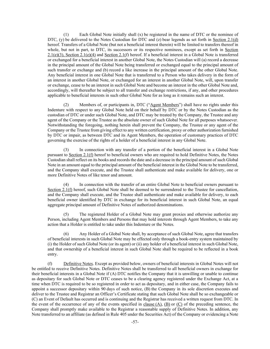 -57- (1) Each Global Note initially shall (x) be registered in the name of DTC or the nominee of DTC, (y) be delivered to the Notes Custodian for DTC and (z) bear legends as set forth in Section 2.1(d) hereof. Transfers of a Global Note (but not a beneficial interest therein) will be limited to transfers thereof in whole, but not in part, to DTC, its successors or its respective nominees, except as set forth in Section 2.1(e)(3), Section 2.1(e)(4) and Section 2.1(f) hereof. If a beneficial interest in a Global Note is transferred or exchanged for a beneficial interest in another Global Note, the Notes Custodian will (a) record a decrease in the principal amount of the Global Note being transferred or exchanged equal to the principal amount of such transfer or exchange and (b) record a like increase in the principal amount of the other Global Note. Any beneficial interest in one Global Note that is transferred to a Person who takes delivery in the form of an interest in another Global Note, or exchanged for an interest in another Global Note, will, upon transfer or exchange, cease to be an interest in such Global Note and become an interest in the other Global Note and, accordingly, will thereafter be subject to all transfer and exchange restrictions, if any, and other procedures applicable to beneficial interests in such other Global Note for as long as it remains such an interest. (2) Members of, or participants in, DTC (“Agent Members”) shall have no rights under this Indenture with respect to any Global Note held on their behalf by DTC or by the Notes Custodian as the custodian of DTC or under such Global Note, and DTC may be treated by the Company, the Trustee and any agent of the Company or the Trustee as the absolute owner of such Global Note for all purposes whatsoever. Notwithstanding the foregoing, nothing herein shall prevent the Company, the Trustee or any agent of the Company or the Trustee from giving effect to any written certification, proxy or other authorization furnished by DTC or impair, as between DTC and its Agent Members, the operation of customary practices of DTC governing the exercise of the rights of a holder of a beneficial interest in any Global Note. (3) In connection with any transfer of a portion of the beneficial interest in a Global Note pursuant to Section 2.1(f) hereof to beneficial owners who are required to hold Definitive Notes, the Notes Custodian shall reflect on its books and records the date and a decrease in the principal amount of such Global Note in an amount equal to the principal amount of the beneficial interest in the Global Note to be transferred, and the Company shall execute, and the Trustee shall authenticate and make available for delivery, one or more Definitive Notes of like tenor and amount. (4) In connection with the transfer of an entire Global Note to beneficial owners pursuant to Section 2.1(f) hereof, such Global Note shall be deemed to be surrendered to the Trustee for cancellation, and the Company shall execute, and the Trustee shall authenticate and make available for delivery, to each beneficial owner identified by DTC in exchange for its beneficial interest in such Global Note, an equal aggregate principal amount of Definitive Notes of authorized denominations. (5) The registered Holder of a Global Note may grant proxies and otherwise authorize any Person, including Agent Members and Persons that may hold interests through Agent Members, to take any action that a Holder is entitled to take under this Indenture or the Notes. (6) Any Holder of a Global Note shall, by acceptance of such Global Note, agree that transfers of beneficial interests in such Global Note may be effected only through a book-entry system maintained by (i) the Holder of such Global Note (or its agent) or (ii) any holder of a beneficial interest in such Global Note, and that ownership of a beneficial interest in such Global Note shall be required to be reflected in a book entry. (f) Definitive Notes. Except as provided below, owners of beneficial interests in Global Notes will not be entitled to receive Definitive Notes. Definitive Notes shall be transferred to all beneficial owners in exchange for their beneficial interests in a Global Note if (A) DTC notifies the Company that it is unwilling or unable to continue as depositary for such Global Note or DTC ceases to be a clearing agency registered under the Exchange Act, at a time when DTC is required to be so registered in order to act as depositary, and in either case, the Company fails to appoint a successor depositary within 90 days of such notice, (B) the Company in its sole discretion executes and deliver to the Trustee and Registrar an Officer’s Certificate stating that such Global Note shall be so exchangeable or (C) an Event of Default has occurred and is continuing and the Registrar has received a written request from DTC. In the event of the occurrence of any of the events specified in clause (A), (B) or (C) of the preceding sentence, the Company shall promptly make available to the Registrar a reasonable supply of Definitive Notes. In addition, any Note transferred to an affiliate (as defined in Rule 405 under the Securities Act) of the Company or evidencing a Note