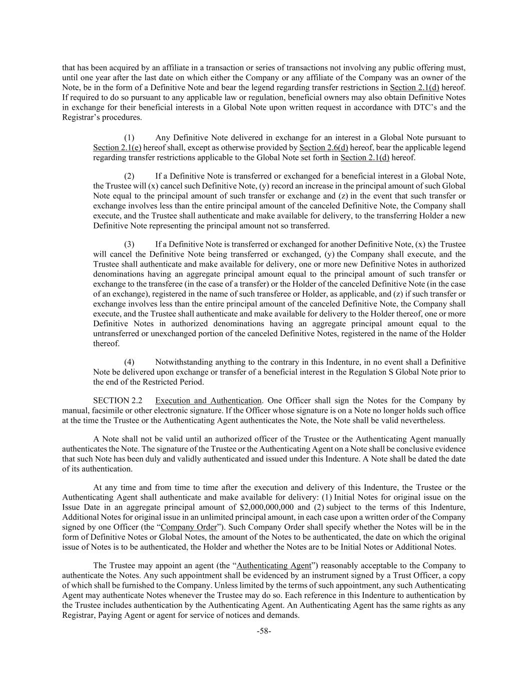 -58- that has been acquired by an affiliate in a transaction or series of transactions not involving any public offering must, until one year after the last date on which either the Company or any affiliate of the Company was an owner of the Note, be in the form of a Definitive Note and bear the legend regarding transfer restrictions in Section 2.1(d) hereof. If required to do so pursuant to any applicable law or regulation, beneficial owners may also obtain Definitive Notes in exchange for their beneficial interests in a Global Note upon written request in accordance with DTC’s and the Registrar’s procedures. (1) Any Definitive Note delivered in exchange for an interest in a Global Note pursuant to Section 2.1(e) hereof shall, except as otherwise provided by Section 2.6(d) hereof, bear the applicable legend regarding transfer restrictions applicable to the Global Note set forth in Section 2.1(d) hereof. (2) If a Definitive Note is transferred or exchanged for a beneficial interest in a Global Note, the Trustee will (x) cancel such Definitive Note, (y) record an increase in the principal amount of such Global Note equal to the principal amount of such transfer or exchange and (z) in the event that such transfer or exchange involves less than the entire principal amount of the canceled Definitive Note, the Company shall execute, and the Trustee shall authenticate and make available for delivery, to the transferring Holder a new Definitive Note representing the principal amount not so transferred. (3) If a Definitive Note is transferred or exchanged for another Definitive Note, (x) the Trustee will cancel the Definitive Note being transferred or exchanged, (y) the Company shall execute, and the Trustee shall authenticate and make available for delivery, one or more new Definitive Notes in authorized denominations having an aggregate principal amount equal to the principal amount of such transfer or exchange to the transferee (in the case of a transfer) or the Holder of the canceled Definitive Note (in the case of an exchange), registered in the name of such transferee or Holder, as applicable, and (z) if such transfer or exchange involves less than the entire principal amount of the canceled Definitive Note, the Company shall execute, and the Trustee shall authenticate and make available for delivery to the Holder thereof, one or more Definitive Notes in authorized denominations having an aggregate principal amount equal to the untransferred or unexchanged portion of the canceled Definitive Notes, registered in the name of the Holder thereof. (4) Notwithstanding anything to the contrary in this Indenture, in no event shall a Definitive Note be delivered upon exchange or transfer of a beneficial interest in the Regulation S Global Note prior to the end of the Restricted Period. SECTION 2.2 Execution and Authentication. One Officer shall sign the Notes for the Company by manual, facsimile or other electronic signature. If the Officer whose signature is on a Note no longer holds such office at the time the Trustee or the Authenticating Agent authenticates the Note, the Note shall be valid nevertheless. A Note shall not be valid until an authorized officer of the Trustee or the Authenticating Agent manually authenticates the Note. The signature of the Trustee or the Authenticating Agent on a Note shall be conclusive evidence that such Note has been duly and validly authenticated and issued under this Indenture. A Note shall be dated the date of its authentication. At any time and from time to time after the execution and delivery of this Indenture, the Trustee or the Authenticating Agent shall authenticate and make available for delivery: (1) Initial Notes for original issue on the Issue Date in an aggregate principal amount of $2,000,000,000 and (2) subject to the terms of this Indenture, Additional Notes for original issue in an unlimited principal amount, in each case upon a written order of the Company signed by one Officer (the “Company Order”). Such Company Order shall specify whether the Notes will be in the form of Definitive Notes or Global Notes, the amount of the Notes to be authenticated, the date on which the original issue of Notes is to be authenticated, the Holder and whether the Notes are to be Initial Notes or Additional Notes. The Trustee may appoint an agent (the “Authenticating Agent”) reasonably acceptable to the Company to authenticate the Notes. Any such appointment shall be evidenced by an instrument signed by a Trust Officer, a copy of which shall be furnished to the Company. Unless limited by the terms of such appointment, any such Authenticating Agent may authenticate Notes whenever the Trustee may do so. Each reference in this Indenture to authentication by the Trustee includes authentication by the Authenticating Agent. An Authenticating Agent has the same rights as any Registrar, Paying Agent or agent for service of notices and demands.