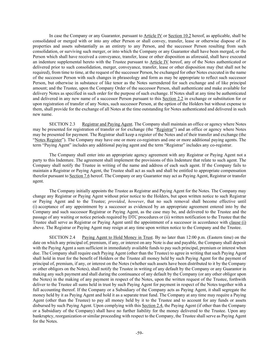-59- In case the Company or any Guarantor, pursuant to Article IV or Section 10.2 hereof, as applicable, shall be consolidated or merged with or into any other Person or shall convey, transfer, lease or otherwise dispose of its properties and assets substantially as an entirety to any Person, and the successor Person resulting from such consolidation, or surviving such merger, or into which the Company or any Guarantor shall have been merged, or the Person which shall have received a conveyance, transfer, lease or other disposition as aforesaid, shall have executed an indenture supplemental hereto with the Trustee pursuant to Article IV hereof, any of the Notes authenticated or delivered prior to such consolidation, merger, conveyance, transfer, lease or other disposition may (but shall not be required), from time to time, at the request of the successor Person, be exchanged for other Notes executed in the name of the successor Person with such changes in phraseology and form as may be appropriate to reflect such successor Person, but otherwise in substance of like tenor as the Notes surrendered for such exchange and of like principal amount; and the Trustee, upon the Company Order of the successor Person, shall authenticate and make available for delivery Notes as specified in such order for the purpose of such exchange. If Notes shall at any time be authenticated and delivered in any new name of a successor Person pursuant to this Section 2.2 in exchange or substitution for or upon registration of transfer of any Notes, such successor Person, at the option of the Holders but without expense to them, shall provide for the exchange of all Notes at the time outstanding for Notes authenticated and delivered in such new name. SECTION 2.3 Registrar and Paying Agent. The Company shall maintain an office or agency where Notes may be presented for registration of transfer or for exchange (the “Registrar”) and an office or agency where Notes may be presented for payment. The Registrar shall keep a register of the Notes and of their transfer and exchange (the “Notes Register”). The Company may have one or more co-registrars and one or more additional paying agents. The term “Paying Agent” includes any additional paying agent and the term “Registrar” includes any co-registrar. The Company shall enter into an appropriate agency agreement with any Registrar or Paying Agent not a party to this Indenture. The agreement shall implement the provisions of this Indenture that relate to such agent. The Company shall notify the Trustee in writing of the name and address of each such agent. If the Company fails to maintain a Registrar or Paying Agent, the Trustee shall act as such and shall be entitled to appropriate compensation therefor pursuant to Section 7.6 hereof. The Company or any Guarantor may act as Paying Agent, Registrar or transfer agent. The Company initially appoints the Trustee as Registrar and Paying Agent for the Notes. The Company may change any Registrar or Paying Agent without prior notice to the Holders, but upon written notice to such Registrar or Paying Agent and to the Trustee; provided, however, that no such removal shall become effective until (i) acceptance of any appointment by a successor as evidenced by an appropriate agreement entered into by the Company and such successor Registrar or Paying Agent, as the case may be, and delivered to the Trustee and the passage of any waiting or notice periods required by DTC procedures or (ii) written notification to the Trustee that the Trustee shall serve as Registrar or Paying Agent until the appointment of a successor in accordance with clause (i) above. The Registrar or Paying Agent may resign at any time upon written notice to the Company and the Trustee. SECTION 2.4 Paying Agent to Hold Money in Trust. By no later than 12:00 p.m. (Eastern time) on the date on which any principal of, premium, if any, or interest on any Note is due and payable, the Company shall deposit with the Paying Agent a sum sufficient in immediately available funds to pay such principal, premium or interest when due. The Company shall require each Paying Agent (other than the Trustee) to agree in writing that such Paying Agent shall hold in trust for the benefit of Holders or the Trustee all money held by such Paying Agent for the payment of principal of, premium, if any, or interest on the Notes (whether such assets have been distributed to it by the Company or other obligors on the Notes), shall notify the Trustee in writing of any default by the Company or any Guarantor in making any such payment and shall during the continuance of any default by the Company (or any other obligor upon the Notes) in the making of any payment in respect of the Notes, upon the written request of the Trustee, forthwith deliver to the Trustee all sums held in trust by such Paying Agent for payment in respect of the Notes together with a full accounting thereof. If the Company or a Subsidiary of the Company acts as Paying Agent, it shall segregate the money held by it as Paying Agent and hold it as a separate trust fund. The Company at any time may require a Paying Agent (other than the Trustee) to pay all money held by it to the Trustee and to account for any funds or assets disbursed by such Paying Agent. Upon complying with this Section 2.4, the Paying Agent (if other than the Company or a Subsidiary of the Company) shall have no further liability for the money delivered to the Trustee. Upon any bankruptcy, reorganization or similar proceeding with respect to the Company, the Trustee shall serve as Paying Agent for the Notes.