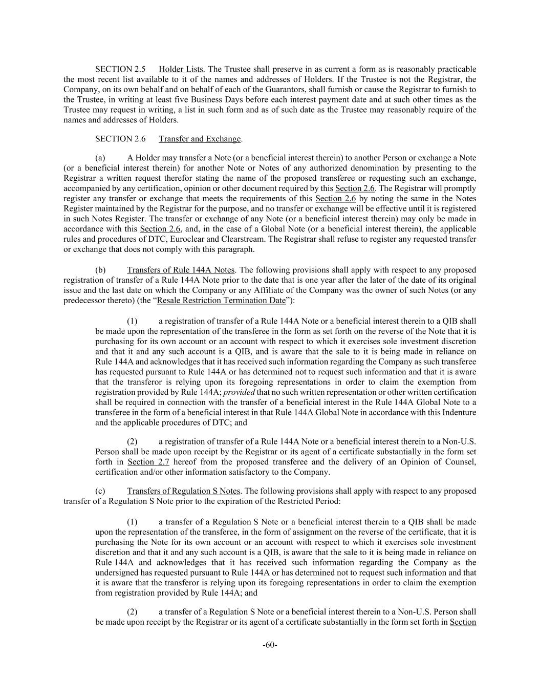 -60- SECTION 2.5 Holder Lists. The Trustee shall preserve in as current a form as is reasonably practicable the most recent list available to it of the names and addresses of Holders. If the Trustee is not the Registrar, the Company, on its own behalf and on behalf of each of the Guarantors, shall furnish or cause the Registrar to furnish to the Trustee, in writing at least five Business Days before each interest payment date and at such other times as the Trustee may request in writing, a list in such form and as of such date as the Trustee may reasonably require of the names and addresses of Holders. SECTION 2.6 Transfer and Exchange. (a) A Holder may transfer a Note (or a beneficial interest therein) to another Person or exchange a Note (or a beneficial interest therein) for another Note or Notes of any authorized denomination by presenting to the Registrar a written request therefor stating the name of the proposed transferee or requesting such an exchange, accompanied by any certification, opinion or other document required by this Section 2.6. The Registrar will promptly register any transfer or exchange that meets the requirements of this Section 2.6 by noting the same in the Notes Register maintained by the Registrar for the purpose, and no transfer or exchange will be effective until it is registered in such Notes Register. The transfer or exchange of any Note (or a beneficial interest therein) may only be made in accordance with this Section 2.6, and, in the case of a Global Note (or a beneficial interest therein), the applicable rules and procedures of DTC, Euroclear and Clearstream. The Registrar shall refuse to register any requested transfer or exchange that does not comply with this paragraph. (b) Transfers of Rule 144A Notes. The following provisions shall apply with respect to any proposed registration of transfer of a Rule 144A Note prior to the date that is one year after the later of the date of its original issue and the last date on which the Company or any Affiliate of the Company was the owner of such Notes (or any predecessor thereto) (the “Resale Restriction Termination Date”): (1) a registration of transfer of a Rule 144A Note or a beneficial interest therein to a QIB shall be made upon the representation of the transferee in the form as set forth on the reverse of the Note that it is purchasing for its own account or an account with respect to which it exercises sole investment discretion and that it and any such account is a QIB, and is aware that the sale to it is being made in reliance on Rule 144A and acknowledges that it has received such information regarding the Company as such transferee has requested pursuant to Rule 144A or has determined not to request such information and that it is aware that the transferor is relying upon its foregoing representations in order to claim the exemption from registration provided by Rule 144A; provided that no such written representation or other written certification shall be required in connection with the transfer of a beneficial interest in the Rule 144A Global Note to a transferee in the form of a beneficial interest in that Rule 144A Global Note in accordance with this Indenture and the applicable procedures of DTC; and (2) a registration of transfer of a Rule 144A Note or a beneficial interest therein to a Non-U.S. Person shall be made upon receipt by the Registrar or its agent of a certificate substantially in the form set forth in Section 2.7 hereof from the proposed transferee and the delivery of an Opinion of Counsel, certification and/or other information satisfactory to the Company. (c) Transfers of Regulation S Notes. The following provisions shall apply with respect to any proposed transfer of a Regulation S Note prior to the expiration of the Restricted Period: (1) a transfer of a Regulation S Note or a beneficial interest therein to a QIB shall be made upon the representation of the transferee, in the form of assignment on the reverse of the certificate, that it is purchasing the Note for its own account or an account with respect to which it exercises sole investment discretion and that it and any such account is a QIB, is aware that the sale to it is being made in reliance on Rule 144A and acknowledges that it has received such information regarding the Company as the undersigned has requested pursuant to Rule 144A or has determined not to request such information and that it is aware that the transferor is relying upon its foregoing representations in order to claim the exemption from registration provided by Rule 144A; and (2) a transfer of a Regulation S Note or a beneficial interest therein to a Non-U.S. Person shall be made upon receipt by the Registrar or its agent of a certificate substantially in the form set forth in Section
