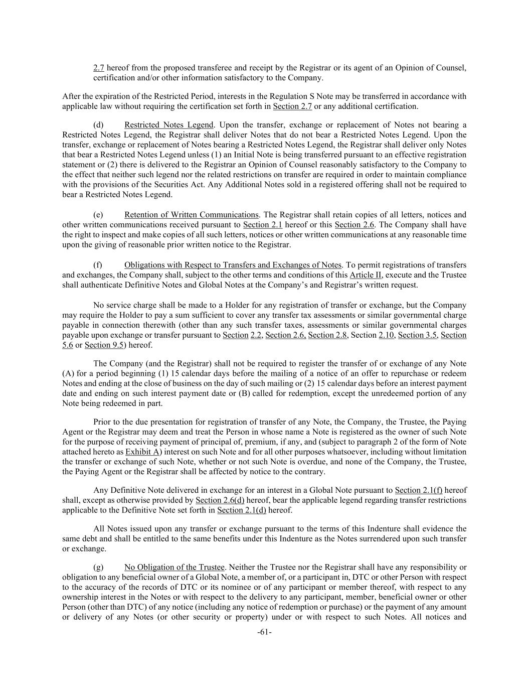 -61- 2.7 hereof from the proposed transferee and receipt by the Registrar or its agent of an Opinion of Counsel, certification and/or other information satisfactory to the Company. After the expiration of the Restricted Period, interests in the Regulation S Note may be transferred in accordance with applicable law without requiring the certification set forth in Section 2.7 or any additional certification. (d) Restricted Notes Legend. Upon the transfer, exchange or replacement of Notes not bearing a Restricted Notes Legend, the Registrar shall deliver Notes that do not bear a Restricted Notes Legend. Upon the transfer, exchange or replacement of Notes bearing a Restricted Notes Legend, the Registrar shall deliver only Notes that bear a Restricted Notes Legend unless (1) an Initial Note is being transferred pursuant to an effective registration statement or (2) there is delivered to the Registrar an Opinion of Counsel reasonably satisfactory to the Company to the effect that neither such legend nor the related restrictions on transfer are required in order to maintain compliance with the provisions of the Securities Act. Any Additional Notes sold in a registered offering shall not be required to bear a Restricted Notes Legend. (e) Retention of Written Communications. The Registrar shall retain copies of all letters, notices and other written communications received pursuant to Section 2.1 hereof or this Section 2.6. The Company shall have the right to inspect and make copies of all such letters, notices or other written communications at any reasonable time upon the giving of reasonable prior written notice to the Registrar. (f) Obligations with Respect to Transfers and Exchanges of Notes. To permit registrations of transfers and exchanges, the Company shall, subject to the other terms and conditions of this Article II, execute and the Trustee shall authenticate Definitive Notes and Global Notes at the Company’s and Registrar’s written request. No service charge shall be made to a Holder for any registration of transfer or exchange, but the Company may require the Holder to pay a sum sufficient to cover any transfer tax assessments or similar governmental charge payable in connection therewith (other than any such transfer taxes, assessments or similar governmental charges payable upon exchange or transfer pursuant to Section 2.2, Section 2.6, Section 2.8, Section 2.10, Section 3.5, Section 5.6 or Section 9.5) hereof. The Company (and the Registrar) shall not be required to register the transfer of or exchange of any Note (A) for a period beginning (1) 15 calendar days before the mailing of a notice of an offer to repurchase or redeem Notes and ending at the close of business on the day of such mailing or (2) 15 calendar days before an interest payment date and ending on such interest payment date or (B) called for redemption, except the unredeemed portion of any Note being redeemed in part. Prior to the due presentation for registration of transfer of any Note, the Company, the Trustee, the Paying Agent or the Registrar may deem and treat the Person in whose name a Note is registered as the owner of such Note for the purpose of receiving payment of principal of, premium, if any, and (subject to paragraph 2 of the form of Note attached hereto as Exhibit A) interest on such Note and for all other purposes whatsoever, including without limitation the transfer or exchange of such Note, whether or not such Note is overdue, and none of the Company, the Trustee, the Paying Agent or the Registrar shall be affected by notice to the contrary. Any Definitive Note delivered in exchange for an interest in a Global Note pursuant to Section 2.1(f) hereof shall, except as otherwise provided by Section 2.6(d) hereof, bear the applicable legend regarding transfer restrictions applicable to the Definitive Note set forth in Section 2.1(d) hereof. All Notes issued upon any transfer or exchange pursuant to the terms of this Indenture shall evidence the same debt and shall be entitled to the same benefits under this Indenture as the Notes surrendered upon such transfer or exchange. (g) No Obligation of the Trustee. Neither the Trustee nor the Registrar shall have any responsibility or obligation to any beneficial owner of a Global Note, a member of, or a participant in, DTC or other Person with respect to the accuracy of the records of DTC or its nominee or of any participant or member thereof, with respect to any ownership interest in the Notes or with respect to the delivery to any participant, member, beneficial owner or other Person (other than DTC) of any notice (including any notice of redemption or purchase) or the payment of any amount or delivery of any Notes (or other security or property) under or with respect to such Notes. All notices and