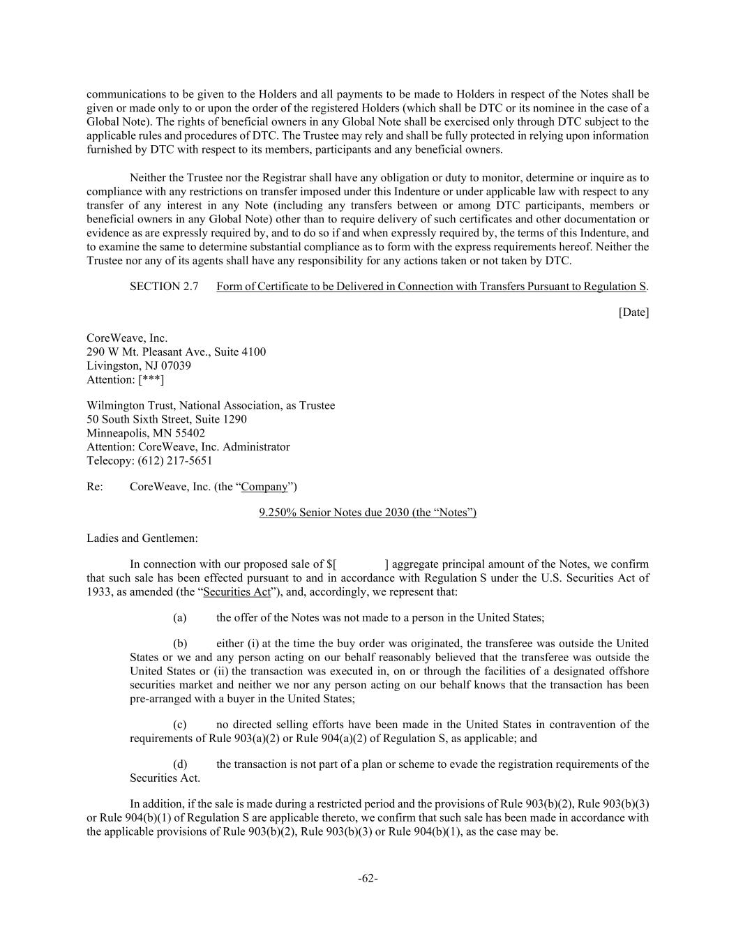 -62- communications to be given to the Holders and all payments to be made to Holders in respect of the Notes shall be given or made only to or upon the order of the registered Holders (which shall be DTC or its nominee in the case of a Global Note). The rights of beneficial owners in any Global Note shall be exercised only through DTC subject to the applicable rules and procedures of DTC. The Trustee may rely and shall be fully protected in relying upon information furnished by DTC with respect to its members, participants and any beneficial owners. Neither the Trustee nor the Registrar shall have any obligation or duty to monitor, determine or inquire as to compliance with any restrictions on transfer imposed under this Indenture or under applicable law with respect to any transfer of any interest in any Note (including any transfers between or among DTC participants, members or beneficial owners in any Global Note) other than to require delivery of such certificates and other documentation or evidence as are expressly required by, and to do so if and when expressly required by, the terms of this Indenture, and to examine the same to determine substantial compliance as to form with the express requirements hereof. Neither the Trustee nor any of its agents shall have any responsibility for any actions taken or not taken by DTC. SECTION 2.7 Form of Certificate to be Delivered in Connection with Transfers Pursuant to Regulation S. [Date] CoreWeave, Inc. 290 W Mt. Pleasant Ave., Suite 4100 Livingston, NJ 07039 Attention: [***] Wilmington Trust, National Association, as Trustee 50 South Sixth Street, Suite 1290 Minneapolis, MN 55402 Attention: CoreWeave, Inc. Administrator Telecopy: (612) 217-5651 Re: CoreWeave, Inc. (the “Company”) 9.250% Senior Notes due 2030 (the “Notes”) Ladies and Gentlemen: In connection with our proposed sale of $[ ] aggregate principal amount of the Notes, we confirm that such sale has been effected pursuant to and in accordance with Regulation S under the U.S. Securities Act of 1933, as amended (the “Securities Act”), and, accordingly, we represent that: (a) the offer of the Notes was not made to a person in the United States; (b) either (i) at the time the buy order was originated, the transferee was outside the United States or we and any person acting on our behalf reasonably believed that the transferee was outside the United States or (ii) the transaction was executed in, on or through the facilities of a designated offshore securities market and neither we nor any person acting on our behalf knows that the transaction has been pre-arranged with a buyer in the United States; (c) no directed selling efforts have been made in the United States in contravention of the requirements of Rule 903(a)(2) or Rule 904(a)(2) of Regulation S, as applicable; and (d) the transaction is not part of a plan or scheme to evade the registration requirements of the Securities Act. In addition, if the sale is made during a restricted period and the provisions of Rule 903(b)(2), Rule 903(b)(3) or Rule 904(b)(1) of Regulation S are applicable thereto, we confirm that such sale has been made in accordance with the applicable provisions of Rule 903(b)(2), Rule 903(b)(3) or Rule 904(b)(1), as the case may be.
