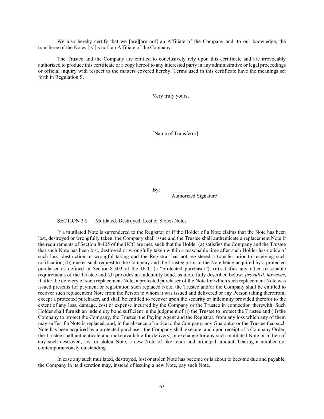 -63- We also hereby certify that we [are][are not] an Affiliate of the Company and, to our knowledge, the transferee of the Notes [is][is not] an Affiliate of the Company. The Trustee and the Company are entitled to conclusively rely upon this certificate and are irrevocably authorized to produce this certificate or a copy hereof to any interested party in any administrative or legal proceedings or official inquiry with respect to the matters covered hereby. Terms used in this certificate have the meanings set forth in Regulation S. Very truly yours, [Name of Transferor] By: Authorized Signature SECTION 2.8 Mutilated, Destroyed, Lost or Stolen Notes. If a mutilated Note is surrendered to the Registrar or if the Holder of a Note claims that the Note has been lost, destroyed or wrongfully taken, the Company shall issue and the Trustee shall authenticate a replacement Note if the requirements of Section 8-405 of the UCC are met, such that the Holder (a) satisfies the Company and the Trustee that such Note has been lost, destroyed or wrongfully taken within a reasonable time after such Holder has notice of such loss, destruction or wrongful taking and the Registrar has not registered a transfer prior to receiving such notification, (b) makes such request to the Company and the Trustee prior to the Note being acquired by a protected purchaser as defined in Section 8-303 of the UCC (a “protected purchaser”), (c) satisfies any other reasonable requirements of the Trustee and (d) provides an indemnity bond, as more fully described below; provided, however, if after the delivery of such replacement Note, a protected purchaser of the Note for which such replacement Note was issued presents for payment or registration such replaced Note, the Trustee and/or the Company shall be entitled to recover such replacement Note from the Person to whom it was issued and delivered or any Person taking therefrom, except a protected purchaser, and shall be entitled to recover upon the security or indemnity provided therefor to the extent of any loss, damage, cost or expense incurred by the Company or the Trustee in connection therewith. Such Holder shall furnish an indemnity bond sufficient in the judgment of (i) the Trustee to protect the Trustee and (ii) the Company to protect the Company, the Trustee, the Paying Agent and the Registrar, from any loss which any of them may suffer if a Note is replaced, and, in the absence of notice to the Company, any Guarantor or the Trustee that such Note has been acquired by a protected purchaser, the Company shall execute, and upon receipt of a Company Order, the Trustee shall authenticate and make available for delivery, in exchange for any such mutilated Note or in lieu of any such destroyed, lost or stolen Note, a new Note of like tenor and principal amount, bearing a number not contemporaneously outstanding. In case any such mutilated, destroyed, lost or stolen Note has become or is about to become due and payable, the Company in its discretion may, instead of issuing a new Note, pay such Note.