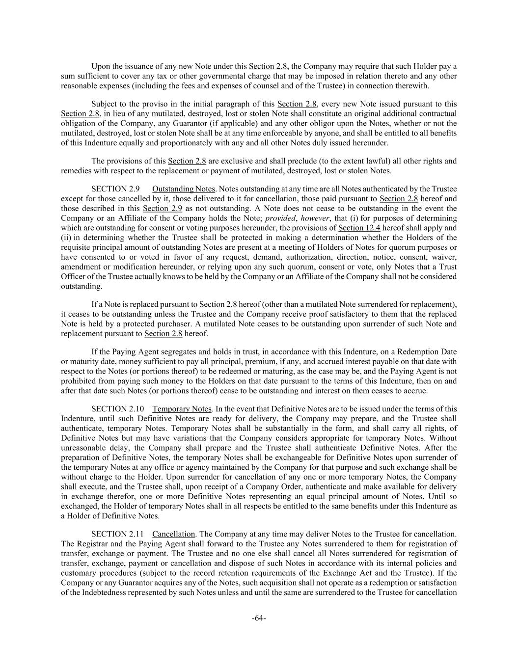 -64- Upon the issuance of any new Note under this Section 2.8, the Company may require that such Holder pay a sum sufficient to cover any tax or other governmental charge that may be imposed in relation thereto and any other reasonable expenses (including the fees and expenses of counsel and of the Trustee) in connection therewith. Subject to the proviso in the initial paragraph of this Section 2.8, every new Note issued pursuant to this Section 2.8, in lieu of any mutilated, destroyed, lost or stolen Note shall constitute an original additional contractual obligation of the Company, any Guarantor (if applicable) and any other obligor upon the Notes, whether or not the mutilated, destroyed, lost or stolen Note shall be at any time enforceable by anyone, and shall be entitled to all benefits of this Indenture equally and proportionately with any and all other Notes duly issued hereunder. The provisions of this Section 2.8 are exclusive and shall preclude (to the extent lawful) all other rights and remedies with respect to the replacement or payment of mutilated, destroyed, lost or stolen Notes. SECTION 2.9 Outstanding Notes. Notes outstanding at any time are all Notes authenticated by the Trustee except for those cancelled by it, those delivered to it for cancellation, those paid pursuant to Section 2.8 hereof and those described in this Section 2.9 as not outstanding. A Note does not cease to be outstanding in the event the Company or an Affiliate of the Company holds the Note; provided, however, that (i) for purposes of determining which are outstanding for consent or voting purposes hereunder, the provisions of Section 12.4 hereof shall apply and (ii) in determining whether the Trustee shall be protected in making a determination whether the Holders of the requisite principal amount of outstanding Notes are present at a meeting of Holders of Notes for quorum purposes or have consented to or voted in favor of any request, demand, authorization, direction, notice, consent, waiver, amendment or modification hereunder, or relying upon any such quorum, consent or vote, only Notes that a Trust Officer of the Trustee actually knows to be held by the Company or an Affiliate of the Company shall not be considered outstanding. If a Note is replaced pursuant to Section 2.8 hereof (other than a mutilated Note surrendered for replacement), it ceases to be outstanding unless the Trustee and the Company receive proof satisfactory to them that the replaced Note is held by a protected purchaser. A mutilated Note ceases to be outstanding upon surrender of such Note and replacement pursuant to Section 2.8 hereof. If the Paying Agent segregates and holds in trust, in accordance with this Indenture, on a Redemption Date or maturity date, money sufficient to pay all principal, premium, if any, and accrued interest payable on that date with respect to the Notes (or portions thereof) to be redeemed or maturing, as the case may be, and the Paying Agent is not prohibited from paying such money to the Holders on that date pursuant to the terms of this Indenture, then on and after that date such Notes (or portions thereof) cease to be outstanding and interest on them ceases to accrue. SECTION 2.10 Temporary Notes. In the event that Definitive Notes are to be issued under the terms of this Indenture, until such Definitive Notes are ready for delivery, the Company may prepare, and the Trustee shall authenticate, temporary Notes. Temporary Notes shall be substantially in the form, and shall carry all rights, of Definitive Notes but may have variations that the Company considers appropriate for temporary Notes. Without unreasonable delay, the Company shall prepare and the Trustee shall authenticate Definitive Notes. After the preparation of Definitive Notes, the temporary Notes shall be exchangeable for Definitive Notes upon surrender of the temporary Notes at any office or agency maintained by the Company for that purpose and such exchange shall be without charge to the Holder. Upon surrender for cancellation of any one or more temporary Notes, the Company shall execute, and the Trustee shall, upon receipt of a Company Order, authenticate and make available for delivery in exchange therefor, one or more Definitive Notes representing an equal principal amount of Notes. Until so exchanged, the Holder of temporary Notes shall in all respects be entitled to the same benefits under this Indenture as a Holder of Definitive Notes. SECTION 2.11 Cancellation. The Company at any time may deliver Notes to the Trustee for cancellation. The Registrar and the Paying Agent shall forward to the Trustee any Notes surrendered to them for registration of transfer, exchange or payment. The Trustee and no one else shall cancel all Notes surrendered for registration of transfer, exchange, payment or cancellation and dispose of such Notes in accordance with its internal policies and customary procedures (subject to the record retention requirements of the Exchange Act and the Trustee). If the Company or any Guarantor acquires any of the Notes, such acquisition shall not operate as a redemption or satisfaction of the Indebtedness represented by such Notes unless and until the same are surrendered to the Trustee for cancellation