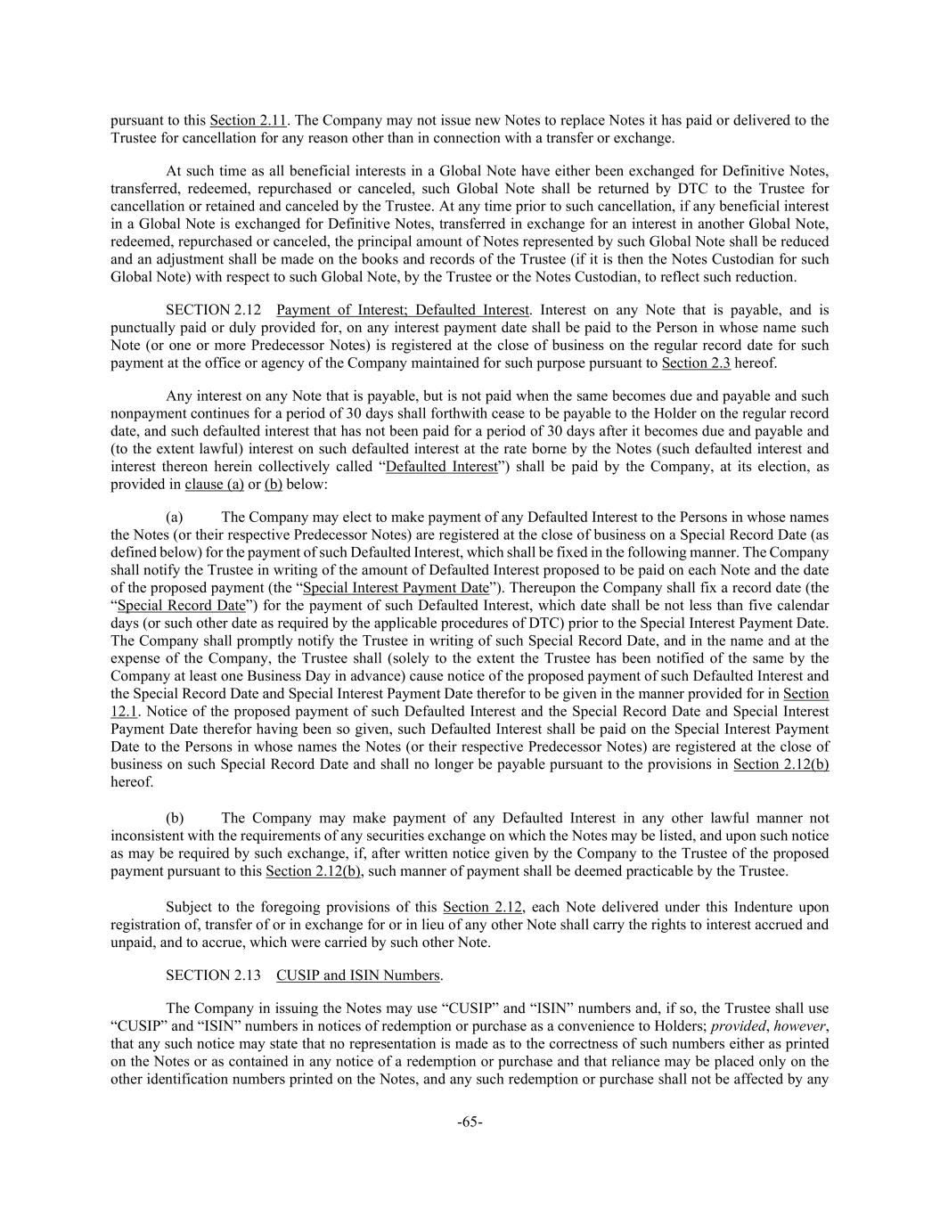 -65- pursuant to this Section 2.11. The Company may not issue new Notes to replace Notes it has paid or delivered to the Trustee for cancellation for any reason other than in connection with a transfer or exchange. At such time as all beneficial interests in a Global Note have either been exchanged for Definitive Notes, transferred, redeemed, repurchased or canceled, such Global Note shall be returned by DTC to the Trustee for cancellation or retained and canceled by the Trustee. At any time prior to such cancellation, if any beneficial interest in a Global Note is exchanged for Definitive Notes, transferred in exchange for an interest in another Global Note, redeemed, repurchased or canceled, the principal amount of Notes represented by such Global Note shall be reduced and an adjustment shall be made on the books and records of the Trustee (if it is then the Notes Custodian for such Global Note) with respect to such Global Note, by the Trustee or the Notes Custodian, to reflect such reduction. SECTION 2.12 Payment of Interest; Defaulted Interest. Interest on any Note that is payable, and is punctually paid or duly provided for, on any interest payment date shall be paid to the Person in whose name such Note (or one or more Predecessor Notes) is registered at the close of business on the regular record date for such payment at the office or agency of the Company maintained for such purpose pursuant to Section 2.3 hereof. Any interest on any Note that is payable, but is not paid when the same becomes due and payable and such nonpayment continues for a period of 30 days shall forthwith cease to be payable to the Holder on the regular record date, and such defaulted interest that has not been paid for a period of 30 days after it becomes due and payable and (to the extent lawful) interest on such defaulted interest at the rate borne by the Notes (such defaulted interest and interest thereon herein collectively called “Defaulted Interest”) shall be paid by the Company, at its election, as provided in clause (a) or (b) below: (a) The Company may elect to make payment of any Defaulted Interest to the Persons in whose names the Notes (or their respective Predecessor Notes) are registered at the close of business on a Special Record Date (as defined below) for the payment of such Defaulted Interest, which shall be fixed in the following manner. The Company shall notify the Trustee in writing of the amount of Defaulted Interest proposed to be paid on each Note and the date of the proposed payment (the “Special Interest Payment Date”). Thereupon the Company shall fix a record date (the “Special Record Date”) for the payment of such Defaulted Interest, which date shall be not less than five calendar days (or such other date as required by the applicable procedures of DTC) prior to the Special Interest Payment Date. The Company shall promptly notify the Trustee in writing of such Special Record Date, and in the name and at the expense of the Company, the Trustee shall (solely to the extent the Trustee has been notified of the same by the Company at least one Business Day in advance) cause notice of the proposed payment of such Defaulted Interest and the Special Record Date and Special Interest Payment Date therefor to be given in the manner provided for in Section 12.1. Notice of the proposed payment of such Defaulted Interest and the Special Record Date and Special Interest Payment Date therefor having been so given, such Defaulted Interest shall be paid on the Special Interest Payment Date to the Persons in whose names the Notes (or their respective Predecessor Notes) are registered at the close of business on such Special Record Date and shall no longer be payable pursuant to the provisions in Section 2.12(b) hereof. (b) The Company may make payment of any Defaulted Interest in any other lawful manner not inconsistent with the requirements of any securities exchange on which the Notes may be listed, and upon such notice as may be required by such exchange, if, after written notice given by the Company to the Trustee of the proposed payment pursuant to this Section 2.12(b), such manner of payment shall be deemed practicable by the Trustee. Subject to the foregoing provisions of this Section 2.12, each Note delivered under this Indenture upon registration of, transfer of or in exchange for or in lieu of any other Note shall carry the rights to interest accrued and unpaid, and to accrue, which were carried by such other Note. SECTION 2.13 CUSIP and ISIN Numbers. The Company in issuing the Notes may use “CUSIP” and “ISIN” numbers and, if so, the Trustee shall use “CUSIP” and “ISIN” numbers in notices of redemption or purchase as a convenience to Holders; provided, however, that any such notice may state that no representation is made as to the correctness of such numbers either as printed on the Notes or as contained in any notice of a redemption or purchase and that reliance may be placed only on the other identification numbers printed on the Notes, and any such redemption or purchase shall not be affected by any