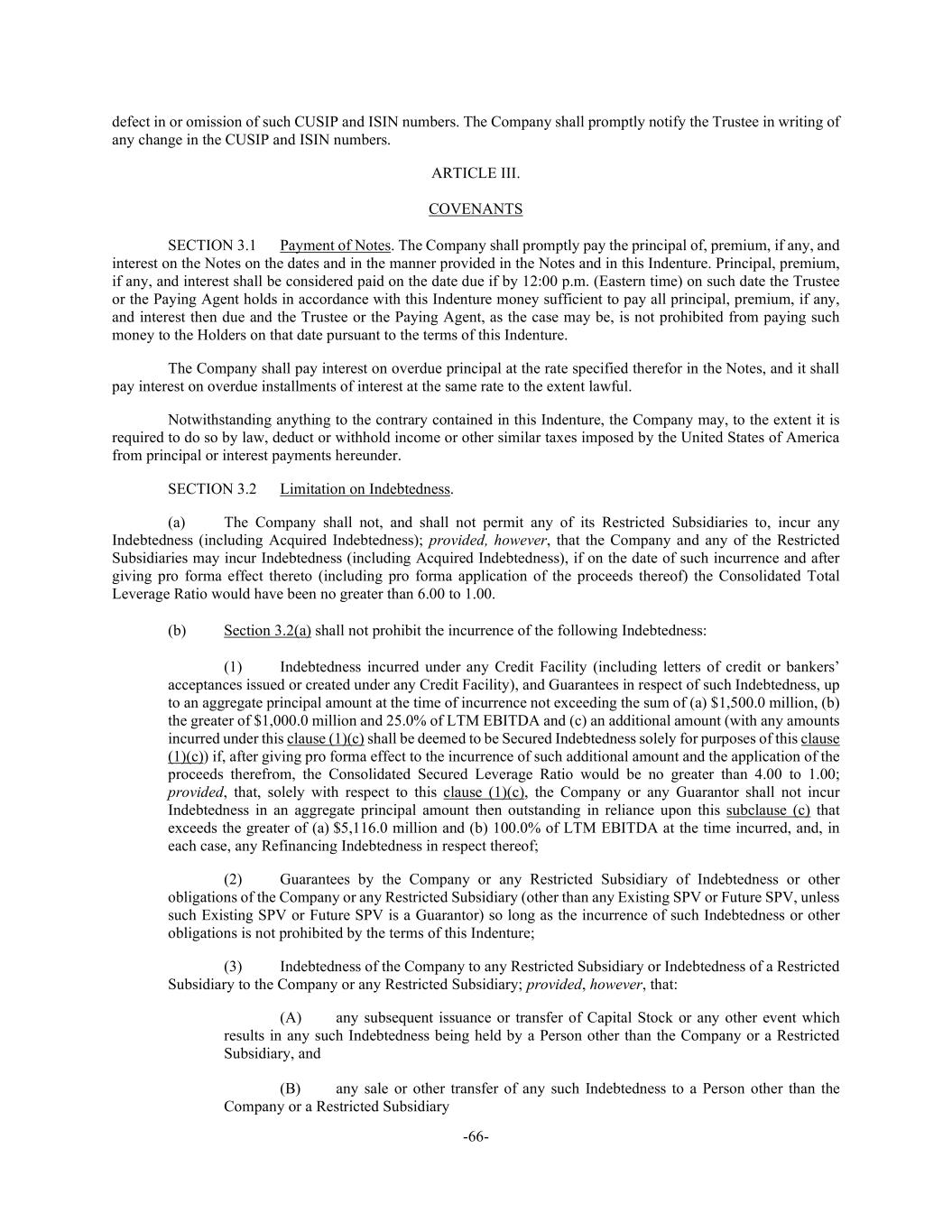 -66- defect in or omission of such CUSIP and ISIN numbers. The Company shall promptly notify the Trustee in writing of any change in the CUSIP and ISIN numbers. ARTICLE III. COVENANTS SECTION 3.1 Payment of Notes. The Company shall promptly pay the principal of, premium, if any, and interest on the Notes on the dates and in the manner provided in the Notes and in this Indenture. Principal, premium, if any, and interest shall be considered paid on the date due if by 12:00 p.m. (Eastern time) on such date the Trustee or the Paying Agent holds in accordance with this Indenture money sufficient to pay all principal, premium, if any, and interest then due and the Trustee or the Paying Agent, as the case may be, is not prohibited from paying such money to the Holders on that date pursuant to the terms of this Indenture. The Company shall pay interest on overdue principal at the rate specified therefor in the Notes, and it shall pay interest on overdue installments of interest at the same rate to the extent lawful. Notwithstanding anything to the contrary contained in this Indenture, the Company may, to the extent it is required to do so by law, deduct or withhold income or other similar taxes imposed by the United States of America from principal or interest payments hereunder. SECTION 3.2 Limitation on Indebtedness. (a) The Company shall not, and shall not permit any of its Restricted Subsidiaries to, incur any Indebtedness (including Acquired Indebtedness); provided, however, that the Company and any of the Restricted Subsidiaries may incur Indebtedness (including Acquired Indebtedness), if on the date of such incurrence and after giving pro forma effect thereto (including pro forma application of the proceeds thereof) the Consolidated Total Leverage Ratio would have been no greater than 6.00 to 1.00. (b) Section 3.2(a) shall not prohibit the incurrence of the following Indebtedness: (1) Indebtedness incurred under any Credit Facility (including letters of credit or bankers’ acceptances issued or created under any Credit Facility), and Guarantees in respect of such Indebtedness, up to an aggregate principal amount at the time of incurrence not exceeding the sum of (a) $1,500.0 million, (b) the greater of $1,000.0 million and 25.0% of LTM EBITDA and (c) an additional amount (with any amounts incurred under this clause (1)(c) shall be deemed to be Secured Indebtedness solely for purposes of this clause (1)(c)) if, after giving pro forma effect to the incurrence of such additional amount and the application of the proceeds therefrom, the Consolidated Secured Leverage Ratio would be no greater than 4.00 to 1.00; provided, that, solely with respect to this clause (1)(c), the Company or any Guarantor shall not incur Indebtedness in an aggregate principal amount then outstanding in reliance upon this subclause (c) that exceeds the greater of (a) $5,116.0 million and (b) 100.0% of LTM EBITDA at the time incurred, and, in each case, any Refinancing Indebtedness in respect thereof; (2) Guarantees by the Company or any Restricted Subsidiary of Indebtedness or other obligations of the Company or any Restricted Subsidiary (other than any Existing SPV or Future SPV, unless such Existing SPV or Future SPV is a Guarantor) so long as the incurrence of such Indebtedness or other obligations is not prohibited by the terms of this Indenture; (3) Indebtedness of the Company to any Restricted Subsidiary or Indebtedness of a Restricted Subsidiary to the Company or any Restricted Subsidiary; provided, however, that: (A) any subsequent issuance or transfer of Capital Stock or any other event which results in any such Indebtedness being held by a Person other than the Company or a Restricted Subsidiary, and (B) any sale or other transfer of any such Indebtedness to a Person other than the Company or a Restricted Subsidiary