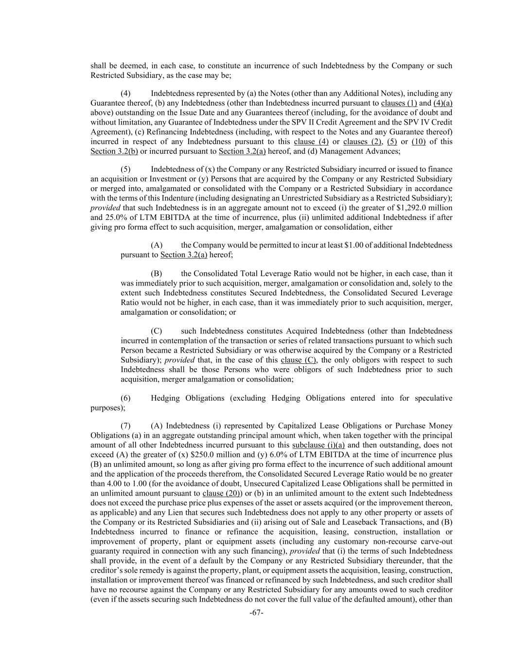 -67- shall be deemed, in each case, to constitute an incurrence of such Indebtedness by the Company or such Restricted Subsidiary, as the case may be; (4) Indebtedness represented by (a) the Notes (other than any Additional Notes), including any Guarantee thereof, (b) any Indebtedness (other than Indebtedness incurred pursuant to clauses (1) and (4)(a) above) outstanding on the Issue Date and any Guarantees thereof (including, for the avoidance of doubt and without limitation, any Guarantee of Indebtedness under the SPV II Credit Agreement and the SPV IV Credit Agreement), (c) Refinancing Indebtedness (including, with respect to the Notes and any Guarantee thereof) incurred in respect of any Indebtedness pursuant to this clause (4) or clauses (2), (5) or (10) of this Section 3.2(b) or incurred pursuant to Section 3.2(a) hereof, and (d) Management Advances; (5) Indebtedness of (x) the Company or any Restricted Subsidiary incurred or issued to finance an acquisition or Investment or (y) Persons that are acquired by the Company or any Restricted Subsidiary or merged into, amalgamated or consolidated with the Company or a Restricted Subsidiary in accordance with the terms of this Indenture (including designating an Unrestricted Subsidiary as a Restricted Subsidiary); provided that such Indebtedness is in an aggregate amount not to exceed (i) the greater of $1,292.0 million and 25.0% of LTM EBITDA at the time of incurrence, plus (ii) unlimited additional Indebtedness if after giving pro forma effect to such acquisition, merger, amalgamation or consolidation, either (A) the Company would be permitted to incur at least $1.00 of additional Indebtedness pursuant to Section 3.2(a) hereof; (B) the Consolidated Total Leverage Ratio would not be higher, in each case, than it was immediately prior to such acquisition, merger, amalgamation or consolidation and, solely to the extent such Indebtedness constitutes Secured Indebtedness, the Consolidated Secured Leverage Ratio would not be higher, in each case, than it was immediately prior to such acquisition, merger, amalgamation or consolidation; or (C) such Indebtedness constitutes Acquired Indebtedness (other than Indebtedness incurred in contemplation of the transaction or series of related transactions pursuant to which such Person became a Restricted Subsidiary or was otherwise acquired by the Company or a Restricted Subsidiary); provided that, in the case of this clause (C), the only obligors with respect to such Indebtedness shall be those Persons who were obligors of such Indebtedness prior to such acquisition, merger amalgamation or consolidation; (6) Hedging Obligations (excluding Hedging Obligations entered into for speculative purposes); (7) (A) Indebtedness (i) represented by Capitalized Lease Obligations or Purchase Money Obligations (a) in an aggregate outstanding principal amount which, when taken together with the principal amount of all other Indebtedness incurred pursuant to this subclause (i)(a) and then outstanding, does not exceed (A) the greater of (x) $250.0 million and (y) 6.0% of LTM EBITDA at the time of incurrence plus (B) an unlimited amount, so long as after giving pro forma effect to the incurrence of such additional amount and the application of the proceeds therefrom, the Consolidated Secured Leverage Ratio would be no greater than 4.00 to 1.00 (for the avoidance of doubt, Unsecured Capitalized Lease Obligations shall be permitted in an unlimited amount pursuant to clause (20)) or (b) in an unlimited amount to the extent such Indebtedness does not exceed the purchase price plus expenses of the asset or assets acquired (or the improvement thereon, as applicable) and any Lien that secures such Indebtedness does not apply to any other property or assets of the Company or its Restricted Subsidiaries and (ii) arising out of Sale and Leaseback Transactions, and (B) Indebtedness incurred to finance or refinance the acquisition, leasing, construction, installation or improvement of property, plant or equipment assets (including any customary non-recourse carve-out guaranty required in connection with any such financing), provided that (i) the terms of such Indebtedness shall provide, in the event of a default by the Company or any Restricted Subsidiary thereunder, that the creditor’s sole remedy is against the property, plant, or equipment assets the acquisition, leasing, construction, installation or improvement thereof was financed or refinanced by such Indebtedness, and such creditor shall have no recourse against the Company or any Restricted Subsidiary for any amounts owed to such creditor (even if the assets securing such Indebtedness do not cover the full value of the defaulted amount), other than