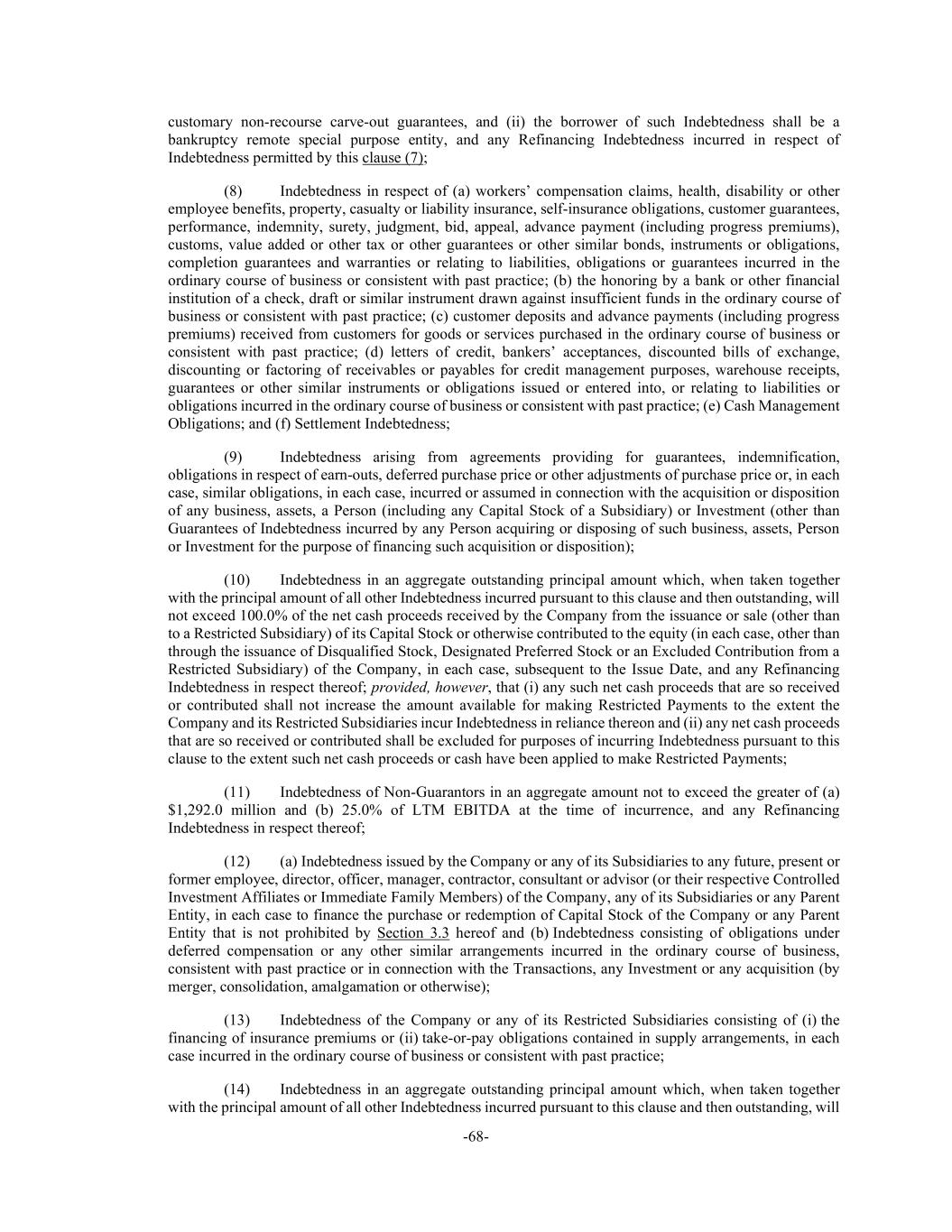 -68- customary non-recourse carve-out guarantees, and (ii) the borrower of such Indebtedness shall be a bankruptcy remote special purpose entity, and any Refinancing Indebtedness incurred in respect of Indebtedness permitted by this clause (7); (8) Indebtedness in respect of (a) workers’ compensation claims, health, disability or other employee benefits, property, casualty or liability insurance, self-insurance obligations, customer guarantees, performance, indemnity, surety, judgment, bid, appeal, advance payment (including progress premiums), customs, value added or other tax or other guarantees or other similar bonds, instruments or obligations, completion guarantees and warranties or relating to liabilities, obligations or guarantees incurred in the ordinary course of business or consistent with past practice; (b) the honoring by a bank or other financial institution of a check, draft or similar instrument drawn against insufficient funds in the ordinary course of business or consistent with past practice; (c) customer deposits and advance payments (including progress premiums) received from customers for goods or services purchased in the ordinary course of business or consistent with past practice; (d) letters of credit, bankers’ acceptances, discounted bills of exchange, discounting or factoring of receivables or payables for credit management purposes, warehouse receipts, guarantees or other similar instruments or obligations issued or entered into, or relating to liabilities or obligations incurred in the ordinary course of business or consistent with past practice; (e) Cash Management Obligations; and (f) Settlement Indebtedness; (9) Indebtedness arising from agreements providing for guarantees, indemnification, obligations in respect of earn-outs, deferred purchase price or other adjustments of purchase price or, in each case, similar obligations, in each case, incurred or assumed in connection with the acquisition or disposition of any business, assets, a Person (including any Capital Stock of a Subsidiary) or Investment (other than Guarantees of Indebtedness incurred by any Person acquiring or disposing of such business, assets, Person or Investment for the purpose of financing such acquisition or disposition); (10) Indebtedness in an aggregate outstanding principal amount which, when taken together with the principal amount of all other Indebtedness incurred pursuant to this clause and then outstanding, will not exceed 100.0% of the net cash proceeds received by the Company from the issuance or sale (other than to a Restricted Subsidiary) of its Capital Stock or otherwise contributed to the equity (in each case, other than through the issuance of Disqualified Stock, Designated Preferred Stock or an Excluded Contribution from a Restricted Subsidiary) of the Company, in each case, subsequent to the Issue Date, and any Refinancing Indebtedness in respect thereof; provided, however, that (i) any such net cash proceeds that are so received or contributed shall not increase the amount available for making Restricted Payments to the extent the Company and its Restricted Subsidiaries incur Indebtedness in reliance thereon and (ii) any net cash proceeds that are so received or contributed shall be excluded for purposes of incurring Indebtedness pursuant to this clause to the extent such net cash proceeds or cash have been applied to make Restricted Payments; (11) Indebtedness of Non-Guarantors in an aggregate amount not to exceed the greater of (a) $1,292.0 million and (b) 25.0% of LTM EBITDA at the time of incurrence, and any Refinancing Indebtedness in respect thereof; (12) (a) Indebtedness issued by the Company or any of its Subsidiaries to any future, present or former employee, director, officer, manager, contractor, consultant or advisor (or their respective Controlled Investment Affiliates or Immediate Family Members) of the Company, any of its Subsidiaries or any Parent Entity, in each case to finance the purchase or redemption of Capital Stock of the Company or any Parent Entity that is not prohibited by Section 3.3 hereof and (b) Indebtedness consisting of obligations under deferred compensation or any other similar arrangements incurred in the ordinary course of business, consistent with past practice or in connection with the Transactions, any Investment or any acquisition (by merger, consolidation, amalgamation or otherwise); (13) Indebtedness of the Company or any of its Restricted Subsidiaries consisting of (i) the financing of insurance premiums or (ii) take-or-pay obligations contained in supply arrangements, in each case incurred in the ordinary course of business or consistent with past practice; (14) Indebtedness in an aggregate outstanding principal amount which, when taken together with the principal amount of all other Indebtedness incurred pursuant to this clause and then outstanding, will