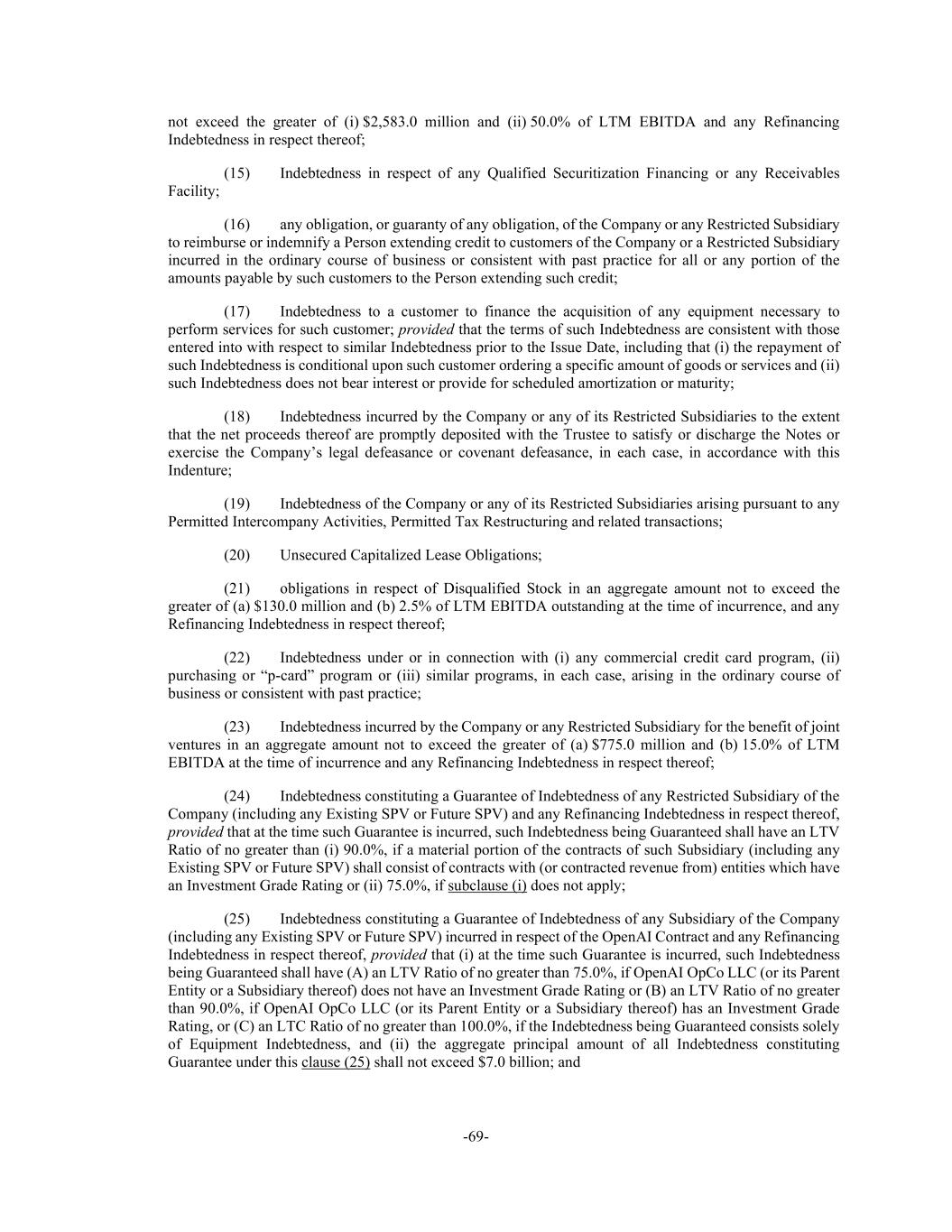 -69- not exceed the greater of (i) $2,583.0 million and (ii) 50.0% of LTM EBITDA and any Refinancing Indebtedness in respect thereof; (15) Indebtedness in respect of any Qualified Securitization Financing or any Receivables Facility; (16) any obligation, or guaranty of any obligation, of the Company or any Restricted Subsidiary to reimburse or indemnify a Person extending credit to customers of the Company or a Restricted Subsidiary incurred in the ordinary course of business or consistent with past practice for all or any portion of the amounts payable by such customers to the Person extending such credit; (17) Indebtedness to a customer to finance the acquisition of any equipment necessary to perform services for such customer; provided that the terms of such Indebtedness are consistent with those entered into with respect to similar Indebtedness prior to the Issue Date, including that (i) the repayment of such Indebtedness is conditional upon such customer ordering a specific amount of goods or services and (ii) such Indebtedness does not bear interest or provide for scheduled amortization or maturity; (18) Indebtedness incurred by the Company or any of its Restricted Subsidiaries to the extent that the net proceeds thereof are promptly deposited with the Trustee to satisfy or discharge the Notes or exercise the Company’s legal defeasance or covenant defeasance, in each case, in accordance with this Indenture; (19) Indebtedness of the Company or any of its Restricted Subsidiaries arising pursuant to any Permitted Intercompany Activities, Permitted Tax Restructuring and related transactions; (20) Unsecured Capitalized Lease Obligations; (21) obligations in respect of Disqualified Stock in an aggregate amount not to exceed the greater of (a) $130.0 million and (b) 2.5% of LTM EBITDA outstanding at the time of incurrence, and any Refinancing Indebtedness in respect thereof; (22) Indebtedness under or in connection with (i) any commercial credit card program, (ii) purchasing or “p-card” program or (iii) similar programs, in each case, arising in the ordinary course of business or consistent with past practice; (23) Indebtedness incurred by the Company or any Restricted Subsidiary for the benefit of joint ventures in an aggregate amount not to exceed the greater of (a) $775.0 million and (b) 15.0% of LTM EBITDA at the time of incurrence and any Refinancing Indebtedness in respect thereof; (24) Indebtedness constituting a Guarantee of Indebtedness of any Restricted Subsidiary of the Company (including any Existing SPV or Future SPV) and any Refinancing Indebtedness in respect thereof, provided that at the time such Guarantee is incurred, such Indebtedness being Guaranteed shall have an LTV Ratio of no greater than (i) 90.0%, if a material portion of the contracts of such Subsidiary (including any Existing SPV or Future SPV) shall consist of contracts with (or contracted revenue from) entities which have an Investment Grade Rating or (ii) 75.0%, if subclause (i) does not apply; (25) Indebtedness constituting a Guarantee of Indebtedness of any Subsidiary of the Company (including any Existing SPV or Future SPV) incurred in respect of the OpenAI Contract and any Refinancing Indebtedness in respect thereof, provided that (i) at the time such Guarantee is incurred, such Indebtedness being Guaranteed shall have (A) an LTV Ratio of no greater than 75.0%, if OpenAI OpCo LLC (or its Parent Entity or a Subsidiary thereof) does not have an Investment Grade Rating or (B) an LTV Ratio of no greater than 90.0%, if OpenAI OpCo LLC (or its Parent Entity or a Subsidiary thereof) has an Investment Grade Rating, or (C) an LTC Ratio of no greater than 100.0%, if the Indebtedness being Guaranteed consists solely of Equipment Indebtedness, and (ii) the aggregate principal amount of all Indebtedness constituting Guarantee under this clause (25) shall not exceed $7.0 billion; and