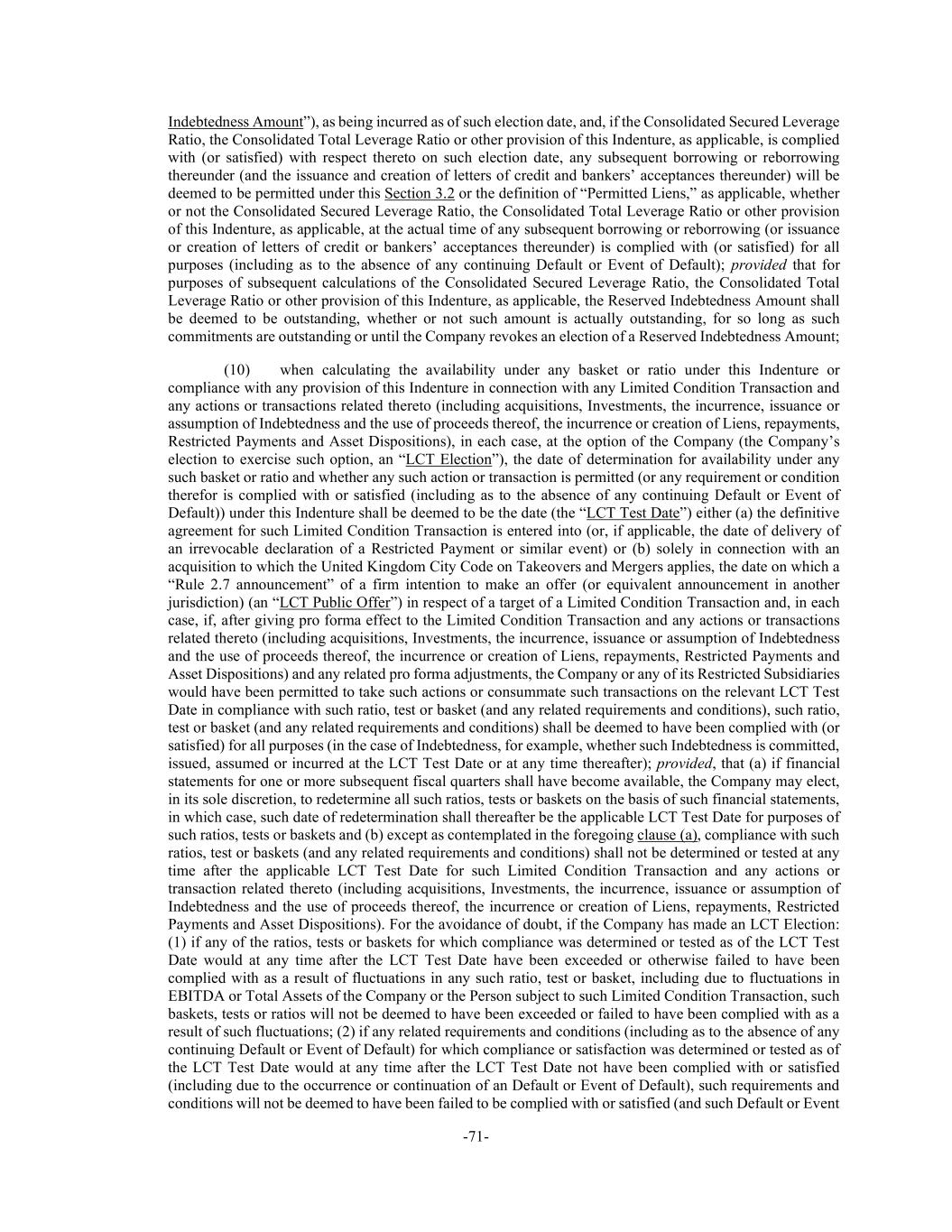 -71- Indebtedness Amount”), as being incurred as of such election date, and, if the Consolidated Secured Leverage Ratio, the Consolidated Total Leverage Ratio or other provision of this Indenture, as applicable, is complied with (or satisfied) with respect thereto on such election date, any subsequent borrowing or reborrowing thereunder (and the issuance and creation of letters of credit and bankers’ acceptances thereunder) will be deemed to be permitted under this Section 3.2 or the definition of “Permitted Liens,” as applicable, whether or not the Consolidated Secured Leverage Ratio, the Consolidated Total Leverage Ratio or other provision of this Indenture, as applicable, at the actual time of any subsequent borrowing or reborrowing (or issuance or creation of letters of credit or bankers’ acceptances thereunder) is complied with (or satisfied) for all purposes (including as to the absence of any continuing Default or Event of Default); provided that for purposes of subsequent calculations of the Consolidated Secured Leverage Ratio, the Consolidated Total Leverage Ratio or other provision of this Indenture, as applicable, the Reserved Indebtedness Amount shall be deemed to be outstanding, whether or not such amount is actually outstanding, for so long as such commitments are outstanding or until the Company revokes an election of a Reserved Indebtedness Amount; (10) when calculating the availability under any basket or ratio under this Indenture or compliance with any provision of this Indenture in connection with any Limited Condition Transaction and any actions or transactions related thereto (including acquisitions, Investments, the incurrence, issuance or assumption of Indebtedness and the use of proceeds thereof, the incurrence or creation of Liens, repayments, Restricted Payments and Asset Dispositions), in each case, at the option of the Company (the Company’s election to exercise such option, an “LCT Election”), the date of determination for availability under any such basket or ratio and whether any such action or transaction is permitted (or any requirement or condition therefor is complied with or satisfied (including as to the absence of any continuing Default or Event of Default)) under this Indenture shall be deemed to be the date (the “LCT Test Date”) either (a) the definitive agreement for such Limited Condition Transaction is entered into (or, if applicable, the date of delivery of an irrevocable declaration of a Restricted Payment or similar event) or (b) solely in connection with an acquisition to which the United Kingdom City Code on Takeovers and Mergers applies, the date on which a “Rule 2.7 announcement” of a firm intention to make an offer (or equivalent announcement in another jurisdiction) (an “LCT Public Offer”) in respect of a target of a Limited Condition Transaction and, in each case, if, after giving pro forma effect to the Limited Condition Transaction and any actions or transactions related thereto (including acquisitions, Investments, the incurrence, issuance or assumption of Indebtedness and the use of proceeds thereof, the incurrence or creation of Liens, repayments, Restricted Payments and Asset Dispositions) and any related pro forma adjustments, the Company or any of its Restricted Subsidiaries would have been permitted to take such actions or consummate such transactions on the relevant LCT Test Date in compliance with such ratio, test or basket (and any related requirements and conditions), such ratio, test or basket (and any related requirements and conditions) shall be deemed to have been complied with (or satisfied) for all purposes (in the case of Indebtedness, for example, whether such Indebtedness is committed, issued, assumed or incurred at the LCT Test Date or at any time thereafter); provided, that (a) if financial statements for one or more subsequent fiscal quarters shall have become available, the Company may elect, in its sole discretion, to redetermine all such ratios, tests or baskets on the basis of such financial statements, in which case, such date of redetermination shall thereafter be the applicable LCT Test Date for purposes of such ratios, tests or baskets and (b) except as contemplated in the foregoing clause (a), compliance with such ratios, test or baskets (and any related requirements and conditions) shall not be determined or tested at any time after the applicable LCT Test Date for such Limited Condition Transaction and any actions or transaction related thereto (including acquisitions, Investments, the incurrence, issuance or assumption of Indebtedness and the use of proceeds thereof, the incurrence or creation of Liens, repayments, Restricted Payments and Asset Dispositions). For the avoidance of doubt, if the Company has made an LCT Election: (1) if any of the ratios, tests or baskets for which compliance was determined or tested as of the LCT Test Date would at any time after the LCT Test Date have been exceeded or otherwise failed to have been complied with as a result of fluctuations in any such ratio, test or basket, including due to fluctuations in EBITDA or Total Assets of the Company or the Person subject to such Limited Condition Transaction, such baskets, tests or ratios will not be deemed to have been exceeded or failed to have been complied with as a result of such fluctuations; (2) if any related requirements and conditions (including as to the absence of any continuing Default or Event of Default) for which compliance or satisfaction was determined or tested as of the LCT Test Date would at any time after the LCT Test Date not have been complied with or satisfied (including due to the occurrence or continuation of an Default or Event of Default), such requirements and conditions will not be deemed to have been failed to be complied with or satisfied (and such Default or Event