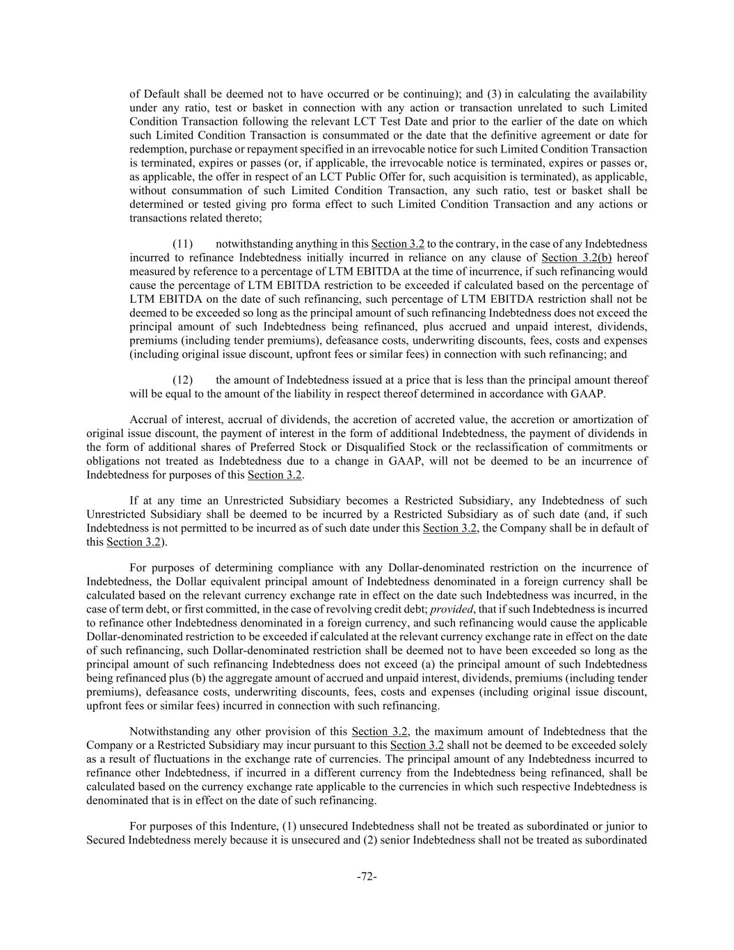 -72- of Default shall be deemed not to have occurred or be continuing); and (3) in calculating the availability under any ratio, test or basket in connection with any action or transaction unrelated to such Limited Condition Transaction following the relevant LCT Test Date and prior to the earlier of the date on which such Limited Condition Transaction is consummated or the date that the definitive agreement or date for redemption, purchase or repayment specified in an irrevocable notice for such Limited Condition Transaction is terminated, expires or passes (or, if applicable, the irrevocable notice is terminated, expires or passes or, as applicable, the offer in respect of an LCT Public Offer for, such acquisition is terminated), as applicable, without consummation of such Limited Condition Transaction, any such ratio, test or basket shall be determined or tested giving pro forma effect to such Limited Condition Transaction and any actions or transactions related thereto; (11) notwithstanding anything in this Section 3.2 to the contrary, in the case of any Indebtedness incurred to refinance Indebtedness initially incurred in reliance on any clause of Section 3.2(b) hereof measured by reference to a percentage of LTM EBITDA at the time of incurrence, if such refinancing would cause the percentage of LTM EBITDA restriction to be exceeded if calculated based on the percentage of LTM EBITDA on the date of such refinancing, such percentage of LTM EBITDA restriction shall not be deemed to be exceeded so long as the principal amount of such refinancing Indebtedness does not exceed the principal amount of such Indebtedness being refinanced, plus accrued and unpaid interest, dividends, premiums (including tender premiums), defeasance costs, underwriting discounts, fees, costs and expenses (including original issue discount, upfront fees or similar fees) in connection with such refinancing; and (12) the amount of Indebtedness issued at a price that is less than the principal amount thereof will be equal to the amount of the liability in respect thereof determined in accordance with GAAP. Accrual of interest, accrual of dividends, the accretion of accreted value, the accretion or amortization of original issue discount, the payment of interest in the form of additional Indebtedness, the payment of dividends in the form of additional shares of Preferred Stock or Disqualified Stock or the reclassification of commitments or obligations not treated as Indebtedness due to a change in GAAP, will not be deemed to be an incurrence of Indebtedness for purposes of this Section 3.2. If at any time an Unrestricted Subsidiary becomes a Restricted Subsidiary, any Indebtedness of such Unrestricted Subsidiary shall be deemed to be incurred by a Restricted Subsidiary as of such date (and, if such Indebtedness is not permitted to be incurred as of such date under this Section 3.2, the Company shall be in default of this Section 3.2). For purposes of determining compliance with any Dollar-denominated restriction on the incurrence of Indebtedness, the Dollar equivalent principal amount of Indebtedness denominated in a foreign currency shall be calculated based on the relevant currency exchange rate in effect on the date such Indebtedness was incurred, in the case of term debt, or first committed, in the case of revolving credit debt; provided, that if such Indebtedness is incurred to refinance other Indebtedness denominated in a foreign currency, and such refinancing would cause the applicable Dollar-denominated restriction to be exceeded if calculated at the relevant currency exchange rate in effect on the date of such refinancing, such Dollar-denominated restriction shall be deemed not to have been exceeded so long as the principal amount of such refinancing Indebtedness does not exceed (a) the principal amount of such Indebtedness being refinanced plus (b) the aggregate amount of accrued and unpaid interest, dividends, premiums (including tender premiums), defeasance costs, underwriting discounts, fees, costs and expenses (including original issue discount, upfront fees or similar fees) incurred in connection with such refinancing. Notwithstanding any other provision of this Section 3.2, the maximum amount of Indebtedness that the Company or a Restricted Subsidiary may incur pursuant to this Section 3.2 shall not be deemed to be exceeded solely as a result of fluctuations in the exchange rate of currencies. The principal amount of any Indebtedness incurred to refinance other Indebtedness, if incurred in a different currency from the Indebtedness being refinanced, shall be calculated based on the currency exchange rate applicable to the currencies in which such respective Indebtedness is denominated that is in effect on the date of such refinancing. For purposes of this Indenture, (1) unsecured Indebtedness shall not be treated as subordinated or junior to Secured Indebtedness merely because it is unsecured and (2) senior Indebtedness shall not be treated as subordinated