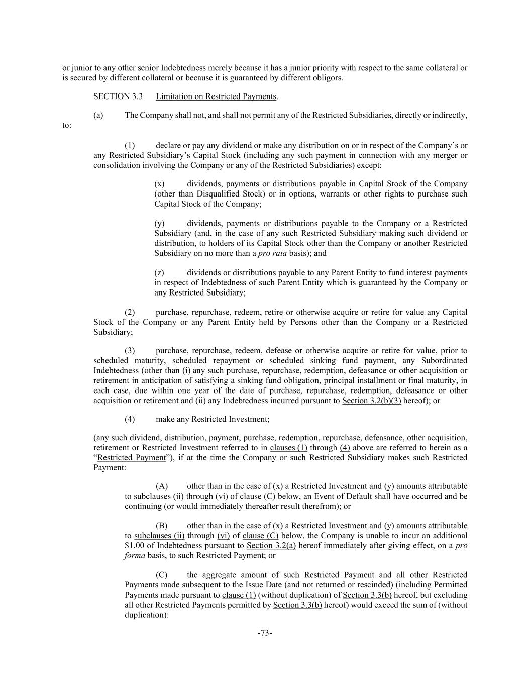 -73- or junior to any other senior Indebtedness merely because it has a junior priority with respect to the same collateral or is secured by different collateral or because it is guaranteed by different obligors. SECTION 3.3 Limitation on Restricted Payments. (a) The Company shall not, and shall not permit any of the Restricted Subsidiaries, directly or indirectly, to: (1) declare or pay any dividend or make any distribution on or in respect of the Company’s or any Restricted Subsidiary’s Capital Stock (including any such payment in connection with any merger or consolidation involving the Company or any of the Restricted Subsidiaries) except: (x) dividends, payments or distributions payable in Capital Stock of the Company (other than Disqualified Stock) or in options, warrants or other rights to purchase such Capital Stock of the Company; (y) dividends, payments or distributions payable to the Company or a Restricted Subsidiary (and, in the case of any such Restricted Subsidiary making such dividend or distribution, to holders of its Capital Stock other than the Company or another Restricted Subsidiary on no more than a pro rata basis); and (z) dividends or distributions payable to any Parent Entity to fund interest payments in respect of Indebtedness of such Parent Entity which is guaranteed by the Company or any Restricted Subsidiary; (2) purchase, repurchase, redeem, retire or otherwise acquire or retire for value any Capital Stock of the Company or any Parent Entity held by Persons other than the Company or a Restricted Subsidiary; (3) purchase, repurchase, redeem, defease or otherwise acquire or retire for value, prior to scheduled maturity, scheduled repayment or scheduled sinking fund payment, any Subordinated Indebtedness (other than (i) any such purchase, repurchase, redemption, defeasance or other acquisition or retirement in anticipation of satisfying a sinking fund obligation, principal installment or final maturity, in each case, due within one year of the date of purchase, repurchase, redemption, defeasance or other acquisition or retirement and (ii) any Indebtedness incurred pursuant to Section 3.2(b)(3) hereof); or (4) make any Restricted Investment; (any such dividend, distribution, payment, purchase, redemption, repurchase, defeasance, other acquisition, retirement or Restricted Investment referred to in clauses (1) through (4) above are referred to herein as a “Restricted Payment”), if at the time the Company or such Restricted Subsidiary makes such Restricted Payment: (A) other than in the case of (x) a Restricted Investment and (y) amounts attributable to subclauses (ii) through (vi) of clause (C) below, an Event of Default shall have occurred and be continuing (or would immediately thereafter result therefrom); or (B) other than in the case of (x) a Restricted Investment and (y) amounts attributable to subclauses (ii) through (vi) of clause (C) below, the Company is unable to incur an additional $1.00 of Indebtedness pursuant to Section 3.2(a) hereof immediately after giving effect, on a pro forma basis, to such Restricted Payment; or (C) the aggregate amount of such Restricted Payment and all other Restricted Payments made subsequent to the Issue Date (and not returned or rescinded) (including Permitted Payments made pursuant to clause (1) (without duplication) of Section 3.3(b) hereof, but excluding all other Restricted Payments permitted by Section 3.3(b) hereof) would exceed the sum of (without duplication):