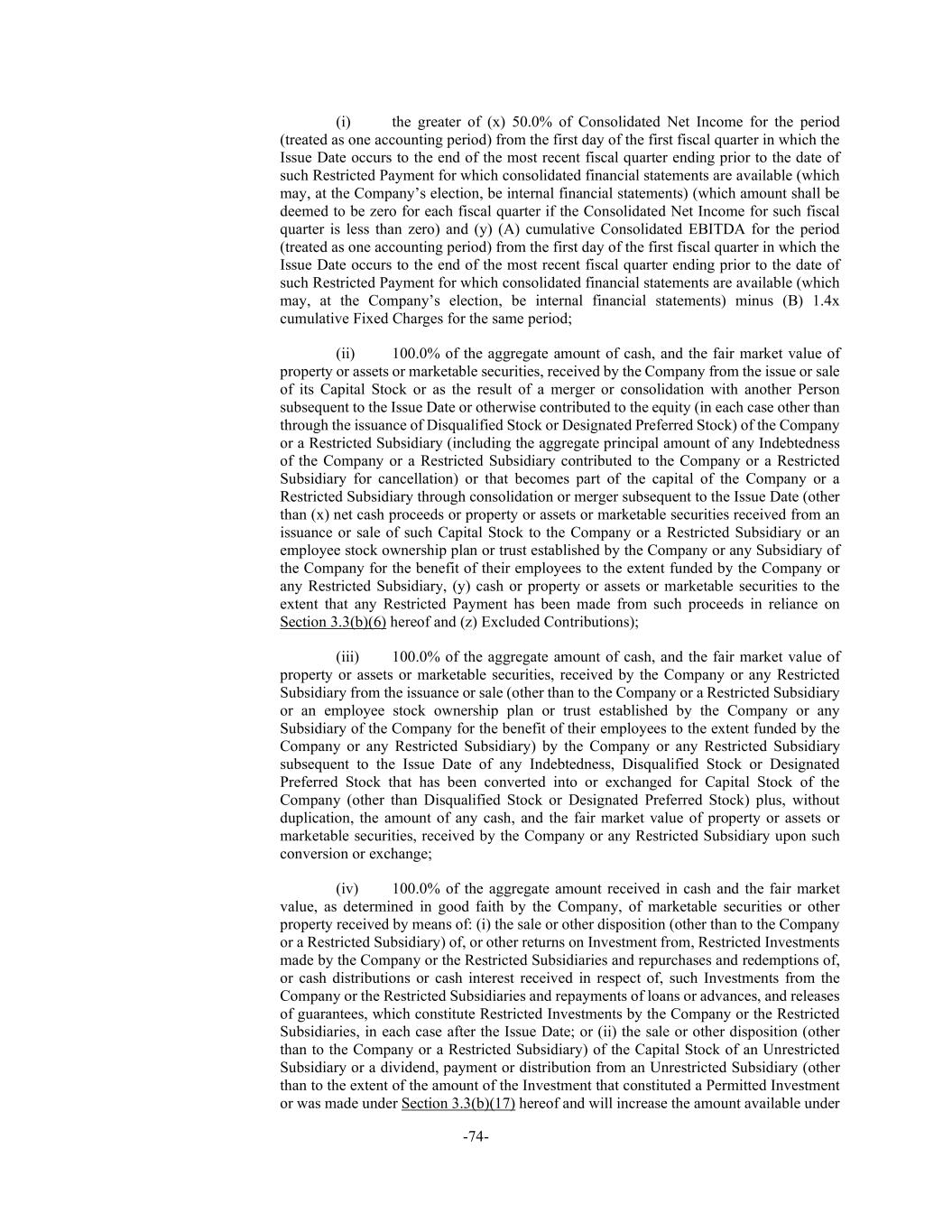 -74- (i) the greater of (x) 50.0% of Consolidated Net Income for the period (treated as one accounting period) from the first day of the first fiscal quarter in which the Issue Date occurs to the end of the most recent fiscal quarter ending prior to the date of such Restricted Payment for which consolidated financial statements are available (which may, at the Company’s election, be internal financial statements) (which amount shall be deemed to be zero for each fiscal quarter if the Consolidated Net Income for such fiscal quarter is less than zero) and (y) (A) cumulative Consolidated EBITDA for the period (treated as one accounting period) from the first day of the first fiscal quarter in which the Issue Date occurs to the end of the most recent fiscal quarter ending prior to the date of such Restricted Payment for which consolidated financial statements are available (which may, at the Company’s election, be internal financial statements) minus (B) 1.4x cumulative Fixed Charges for the same period; (ii) 100.0% of the aggregate amount of cash, and the fair market value of property or assets or marketable securities, received by the Company from the issue or sale of its Capital Stock or as the result of a merger or consolidation with another Person subsequent to the Issue Date or otherwise contributed to the equity (in each case other than through the issuance of Disqualified Stock or Designated Preferred Stock) of the Company or a Restricted Subsidiary (including the aggregate principal amount of any Indebtedness of the Company or a Restricted Subsidiary contributed to the Company or a Restricted Subsidiary for cancellation) or that becomes part of the capital of the Company or a Restricted Subsidiary through consolidation or merger subsequent to the Issue Date (other than (x) net cash proceeds or property or assets or marketable securities received from an issuance or sale of such Capital Stock to the Company or a Restricted Subsidiary or an employee stock ownership plan or trust established by the Company or any Subsidiary of the Company for the benefit of their employees to the extent funded by the Company or any Restricted Subsidiary, (y) cash or property or assets or marketable securities to the extent that any Restricted Payment has been made from such proceeds in reliance on Section 3.3(b)(6) hereof and (z) Excluded Contributions); (iii) 100.0% of the aggregate amount of cash, and the fair market value of property or assets or marketable securities, received by the Company or any Restricted Subsidiary from the issuance or sale (other than to the Company or a Restricted Subsidiary or an employee stock ownership plan or trust established by the Company or any Subsidiary of the Company for the benefit of their employees to the extent funded by the Company or any Restricted Subsidiary) by the Company or any Restricted Subsidiary subsequent to the Issue Date of any Indebtedness, Disqualified Stock or Designated Preferred Stock that has been converted into or exchanged for Capital Stock of the Company (other than Disqualified Stock or Designated Preferred Stock) plus, without duplication, the amount of any cash, and the fair market value of property or assets or marketable securities, received by the Company or any Restricted Subsidiary upon such conversion or exchange; (iv) 100.0% of the aggregate amount received in cash and the fair market value, as determined in good faith by the Company, of marketable securities or other property received by means of: (i) the sale or other disposition (other than to the Company or a Restricted Subsidiary) of, or other returns on Investment from, Restricted Investments made by the Company or the Restricted Subsidiaries and repurchases and redemptions of, or cash distributions or cash interest received in respect of, such Investments from the Company or the Restricted Subsidiaries and repayments of loans or advances, and releases of guarantees, which constitute Restricted Investments by the Company or the Restricted Subsidiaries, in each case after the Issue Date; or (ii) the sale or other disposition (other than to the Company or a Restricted Subsidiary) of the Capital Stock of an Unrestricted Subsidiary or a dividend, payment or distribution from an Unrestricted Subsidiary (other than to the extent of the amount of the Investment that constituted a Permitted Investment or was made under Section 3.3(b)(17) hereof and will increase the amount available under
