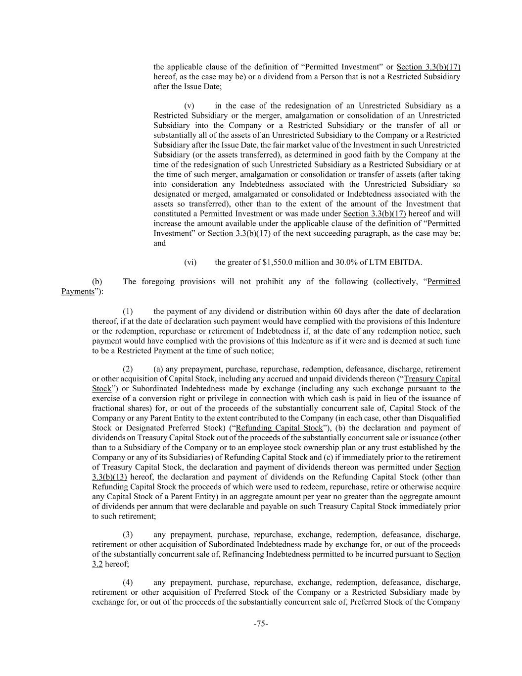 -75- the applicable clause of the definition of “Permitted Investment” or Section 3.3(b)(17) hereof, as the case may be) or a dividend from a Person that is not a Restricted Subsidiary after the Issue Date; (v) in the case of the redesignation of an Unrestricted Subsidiary as a Restricted Subsidiary or the merger, amalgamation or consolidation of an Unrestricted Subsidiary into the Company or a Restricted Subsidiary or the transfer of all or substantially all of the assets of an Unrestricted Subsidiary to the Company or a Restricted Subsidiary after the Issue Date, the fair market value of the Investment in such Unrestricted Subsidiary (or the assets transferred), as determined in good faith by the Company at the time of the redesignation of such Unrestricted Subsidiary as a Restricted Subsidiary or at the time of such merger, amalgamation or consolidation or transfer of assets (after taking into consideration any Indebtedness associated with the Unrestricted Subsidiary so designated or merged, amalgamated or consolidated or Indebtedness associated with the assets so transferred), other than to the extent of the amount of the Investment that constituted a Permitted Investment or was made under Section 3.3(b)(17) hereof and will increase the amount available under the applicable clause of the definition of “Permitted Investment” or Section 3.3(b)(17) of the next succeeding paragraph, as the case may be; and (vi) the greater of $1,550.0 million and 30.0% of LTM EBITDA. (b) The foregoing provisions will not prohibit any of the following (collectively, “Permitted Payments”): (1) the payment of any dividend or distribution within 60 days after the date of declaration thereof, if at the date of declaration such payment would have complied with the provisions of this Indenture or the redemption, repurchase or retirement of Indebtedness if, at the date of any redemption notice, such payment would have complied with the provisions of this Indenture as if it were and is deemed at such time to be a Restricted Payment at the time of such notice; (2) (a) any prepayment, purchase, repurchase, redemption, defeasance, discharge, retirement or other acquisition of Capital Stock, including any accrued and unpaid dividends thereon (“Treasury Capital Stock”) or Subordinated Indebtedness made by exchange (including any such exchange pursuant to the exercise of a conversion right or privilege in connection with which cash is paid in lieu of the issuance of fractional shares) for, or out of the proceeds of the substantially concurrent sale of, Capital Stock of the Company or any Parent Entity to the extent contributed to the Company (in each case, other than Disqualified Stock or Designated Preferred Stock) (“Refunding Capital Stock”), (b) the declaration and payment of dividends on Treasury Capital Stock out of the proceeds of the substantially concurrent sale or issuance (other than to a Subsidiary of the Company or to an employee stock ownership plan or any trust established by the Company or any of its Subsidiaries) of Refunding Capital Stock and (c) if immediately prior to the retirement of Treasury Capital Stock, the declaration and payment of dividends thereon was permitted under Section 3.3(b)(13) hereof, the declaration and payment of dividends on the Refunding Capital Stock (other than Refunding Capital Stock the proceeds of which were used to redeem, repurchase, retire or otherwise acquire any Capital Stock of a Parent Entity) in an aggregate amount per year no greater than the aggregate amount of dividends per annum that were declarable and payable on such Treasury Capital Stock immediately prior to such retirement; (3) any prepayment, purchase, repurchase, exchange, redemption, defeasance, discharge, retirement or other acquisition of Subordinated Indebtedness made by exchange for, or out of the proceeds of the substantially concurrent sale of, Refinancing Indebtedness permitted to be incurred pursuant to Section 3.2 hereof; (4) any prepayment, purchase, repurchase, exchange, redemption, defeasance, discharge, retirement or other acquisition of Preferred Stock of the Company or a Restricted Subsidiary made by exchange for, or out of the proceeds of the substantially concurrent sale of, Preferred Stock of the Company