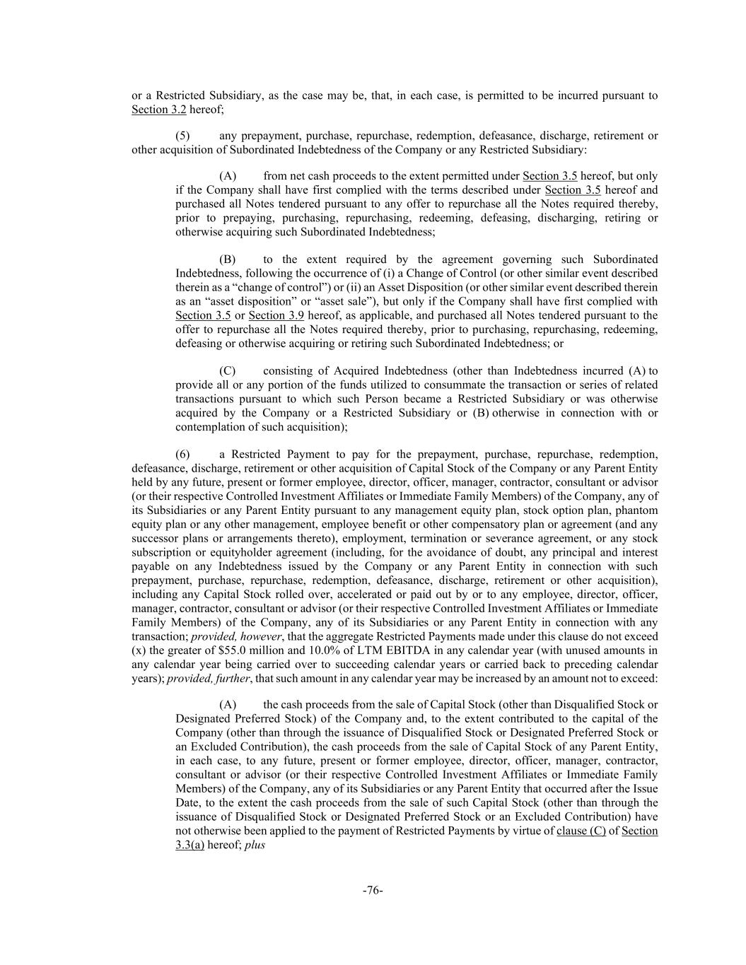 -76- or a Restricted Subsidiary, as the case may be, that, in each case, is permitted to be incurred pursuant to Section 3.2 hereof; (5) any prepayment, purchase, repurchase, redemption, defeasance, discharge, retirement or other acquisition of Subordinated Indebtedness of the Company or any Restricted Subsidiary: (A) from net cash proceeds to the extent permitted under Section 3.5 hereof, but only if the Company shall have first complied with the terms described under Section 3.5 hereof and purchased all Notes tendered pursuant to any offer to repurchase all the Notes required thereby, prior to prepaying, purchasing, repurchasing, redeeming, defeasing, discharging, retiring or otherwise acquiring such Subordinated Indebtedness; (B) to the extent required by the agreement governing such Subordinated Indebtedness, following the occurrence of (i) a Change of Control (or other similar event described therein as a “change of control”) or (ii) an Asset Disposition (or other similar event described therein as an “asset disposition” or “asset sale”), but only if the Company shall have first complied with Section 3.5 or Section 3.9 hereof, as applicable, and purchased all Notes tendered pursuant to the offer to repurchase all the Notes required thereby, prior to purchasing, repurchasing, redeeming, defeasing or otherwise acquiring or retiring such Subordinated Indebtedness; or (C) consisting of Acquired Indebtedness (other than Indebtedness incurred (A) to provide all or any portion of the funds utilized to consummate the transaction or series of related transactions pursuant to which such Person became a Restricted Subsidiary or was otherwise acquired by the Company or a Restricted Subsidiary or (B) otherwise in connection with or contemplation of such acquisition); (6) a Restricted Payment to pay for the prepayment, purchase, repurchase, redemption, defeasance, discharge, retirement or other acquisition of Capital Stock of the Company or any Parent Entity held by any future, present or former employee, director, officer, manager, contractor, consultant or advisor (or their respective Controlled Investment Affiliates or Immediate Family Members) of the Company, any of its Subsidiaries or any Parent Entity pursuant to any management equity plan, stock option plan, phantom equity plan or any other management, employee benefit or other compensatory plan or agreement (and any successor plans or arrangements thereto), employment, termination or severance agreement, or any stock subscription or equityholder agreement (including, for the avoidance of doubt, any principal and interest payable on any Indebtedness issued by the Company or any Parent Entity in connection with such prepayment, purchase, repurchase, redemption, defeasance, discharge, retirement or other acquisition), including any Capital Stock rolled over, accelerated or paid out by or to any employee, director, officer, manager, contractor, consultant or advisor (or their respective Controlled Investment Affiliates or Immediate Family Members) of the Company, any of its Subsidiaries or any Parent Entity in connection with any transaction; provided, however, that the aggregate Restricted Payments made under this clause do not exceed (x) the greater of $55.0 million and 10.0% of LTM EBITDA in any calendar year (with unused amounts in any calendar year being carried over to succeeding calendar years or carried back to preceding calendar years); provided, further, that such amount in any calendar year may be increased by an amount not to exceed: (A) the cash proceeds from the sale of Capital Stock (other than Disqualified Stock or Designated Preferred Stock) of the Company and, to the extent contributed to the capital of the Company (other than through the issuance of Disqualified Stock or Designated Preferred Stock or an Excluded Contribution), the cash proceeds from the sale of Capital Stock of any Parent Entity, in each case, to any future, present or former employee, director, officer, manager, contractor, consultant or advisor (or their respective Controlled Investment Affiliates or Immediate Family Members) of the Company, any of its Subsidiaries or any Parent Entity that occurred after the Issue Date, to the extent the cash proceeds from the sale of such Capital Stock (other than through the issuance of Disqualified Stock or Designated Preferred Stock or an Excluded Contribution) have not otherwise been applied to the payment of Restricted Payments by virtue of clause (C) of Section 3.3(a) hereof; plus
