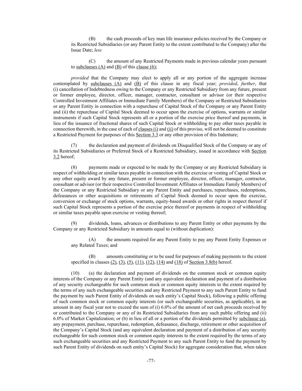 -77- (B) the cash proceeds of key man life insurance policies received by the Company or its Restricted Subsidiaries (or any Parent Entity to the extent contributed to the Company) after the Issue Date; less (C) the amount of any Restricted Payments made in previous calendar years pursuant to subclauses (A) and (B) of this clause (6); provided that the Company may elect to apply all or any portion of the aggregate increase contemplated by subclauses (A) and (B) of this clause in any fiscal year; provided, further, that (i) cancellation of Indebtedness owing to the Company or any Restricted Subsidiary from any future, present or former employee, director, officer, manager, contractor, consultant or advisor (or their respective Controlled Investment Affiliates or Immediate Family Members) of the Company or Restricted Subsidiaries or any Parent Entity in connection with a repurchase of Capital Stock of the Company or any Parent Entity and (ii) the repurchase of Capital Stock deemed to occur upon the exercise of options, warrants or similar instruments if such Capital Stock represents all or a portion of the exercise price thereof and payments, in lieu of the issuance of fractional shares of such Capital Stock or withholding to pay other taxes payable in connection therewith, in the case of each of clauses (i) and (ii) of this proviso, will not be deemed to constitute a Restricted Payment for purposes of this Section 3.3 or any other provision of this Indenture; (7) the declaration and payment of dividends on Disqualified Stock of the Company or any of its Restricted Subsidiaries or Preferred Stock of a Restricted Subsidiary, issued in accordance with Section 3.2 hereof; (8) payments made or expected to be made by the Company or any Restricted Subsidiary in respect of withholding or similar taxes payable in connection with the exercise or vesting of Capital Stock or any other equity award by any future, present or former employee, director, officer, manager, contractor, consultant or advisor (or their respective Controlled Investment Affiliates or Immediate Family Members) of the Company or any Restricted Subsidiary or any Parent Entity and purchases, repurchases, redemptions, defeasances or other acquisitions or retirements of Capital Stock deemed to occur upon the exercise, conversion or exchange of stock options, warrants, equity-based awards or other rights in respect thereof if such Capital Stock represents a portion of the exercise price thereof or payments in respect of withholding or similar taxes payable upon exercise or vesting thereof; (9) dividends, loans, advances or distributions to any Parent Entity or other payments by the Company or any Restricted Subsidiary in amounts equal to (without duplication): (A) the amounts required for any Parent Entity to pay any Parent Entity Expenses or any Related Taxes; and (B) amounts constituting or to be used for purposes of making payments to the extent specified in clauses (2), (3), (5), (11), (12), (14) and (18) of Section 3.8(b) hereof. (10) (a) the declaration and payment of dividends on the common stock or common equity interests of the Company or any Parent Entity (and any equivalent declaration and payment of a distribution of any security exchangeable for such common stock or common equity interests to the extent required by the terms of any such exchangeable securities and any Restricted Payment to any such Parent Entity to fund the payment by such Parent Entity of dividends on such entity’s Capital Stock), following a public offering of such common stock or common equity interests (or such exchangeable securities, as applicable), in an amount in any fiscal year not to exceed the sum of (i) 6.0% of the amount of net cash proceeds received by or contributed to the Company or any of its Restricted Subsidiaries from any such public offering and (ii) 6.0% of Market Capitalization; or (b) in lieu of all or a portion of the dividends permitted by subclause (a), any prepayment, purchase, repurchase, redemption, defeasance, discharge, retirement or other acquisition of the Company’s Capital Stock (and any equivalent declaration and payment of a distribution of any security exchangeable for such common stock or common equity interests to the extent required by the terms of any such exchangeable securities and any Restricted Payment to any such Parent Entity to fund the payment by such Parent Entity of dividends on such entity’s Capital Stock) for aggregate consideration that, when taken