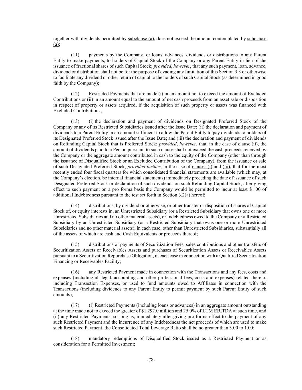 -78- together with dividends permitted by subclause (a), does not exceed the amount contemplated by subclause (a); (11) payments by the Company, or loans, advances, dividends or distributions to any Parent Entity to make payments, to holders of Capital Stock of the Company or any Parent Entity in lieu of the issuance of fractional shares of such Capital Stock; provided, however, that any such payment, loan, advance, dividend or distribution shall not be for the purpose of evading any limitation of this Section 3.3 or otherwise to facilitate any dividend or other return of capital to the holders of such Capital Stock (as determined in good faith by the Company); (12) Restricted Payments that are made (i) in an amount not to exceed the amount of Excluded Contributions or (ii) in an amount equal to the amount of net cash proceeds from an asset sale or disposition in respect of property or assets acquired, if the acquisition of such property or assets was financed with Excluded Contributions; (13) (i) the declaration and payment of dividends on Designated Preferred Stock of the Company or any of its Restricted Subsidiaries issued after the Issue Date; (ii) the declaration and payment of dividends to a Parent Entity in an amount sufficient to allow the Parent Entity to pay dividends to holders of its Designated Preferred Stock issued after the Issue Date; and (iii) the declaration and payment of dividends on Refunding Capital Stock that is Preferred Stock; provided, however, that, in the case of clause (ii), the amount of dividends paid to a Person pursuant to such clause shall not exceed the cash proceeds received by the Company or the aggregate amount contributed in cash to the equity of the Company (other than through the issuance of Disqualified Stock or an Excluded Contribution of the Company), from the issuance or sale of such Designated Preferred Stock; provided further, in the case of clauses (i) and (iii), that for the most recently ended four fiscal quarters for which consolidated financial statements are available (which may, at the Company’s election, be internal financial statements) immediately preceding the date of issuance of such Designated Preferred Stock or declaration of such dividends on such Refunding Capital Stock, after giving effect to such payment on a pro forma basis the Company would be permitted to incur at least $1.00 of additional Indebtedness pursuant to the test set forth in Section 3.2(a) hereof; (14) distributions, by dividend or otherwise, or other transfer or disposition of shares of Capital Stock of, or equity interests in, an Unrestricted Subsidiary (or a Restricted Subsidiary that owns one or more Unrestricted Subsidiaries and no other material assets), or Indebtedness owed to the Company or a Restricted Subsidiary by an Unrestricted Subsidiary (or a Restricted Subsidiary that owns one or more Unrestricted Subsidiaries and no other material assets), in each case, other than Unrestricted Subsidiaries, substantially all of the assets of which are cash and Cash Equivalents or proceeds thereof; (15) distributions or payments of Securitization Fees, sales contributions and other transfers of Securitization Assets or Receivables Assets and purchases of Securitization Assets or Receivables Assets pursuant to a Securitization Repurchase Obligation, in each case in connection with a Qualified Securitization Financing or Receivables Facility; (16) any Restricted Payment made in connection with the Transactions and any fees, costs and expenses (including all legal, accounting and other professional fees, costs and expenses) related thereto, including Transaction Expenses, or used to fund amounts owed to Affiliates in connection with the Transactions (including dividends to any Parent Entity to permit payment by such Parent Entity of such amounts); (17) (i) Restricted Payments (including loans or advances) in an aggregate amount outstanding at the time made not to exceed the greater of $1,292.0 million and 25.0% of LTM EBITDA at such time, and (ii) any Restricted Payments, so long as, immediately after giving pro forma effect to the payment of any such Restricted Payment and the incurrence of any Indebtedness the net proceeds of which are used to make such Restricted Payment, the Consolidated Total Leverage Ratio shall be no greater than 3.00 to 1.00; (18) mandatory redemptions of Disqualified Stock issued as a Restricted Payment or as consideration for a Permitted Investment;