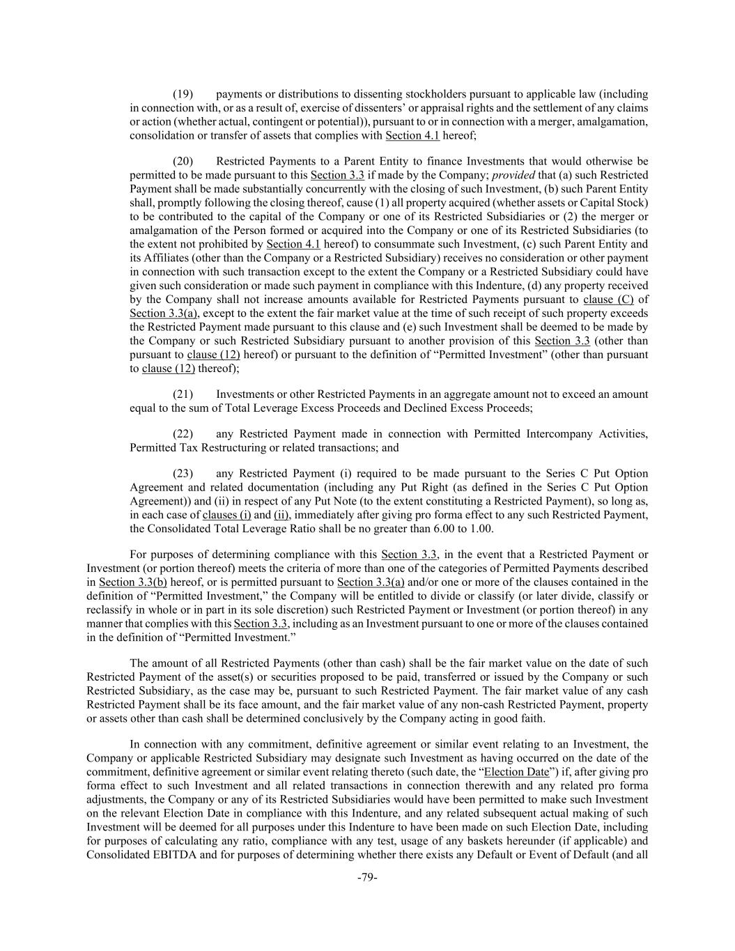 -79- (19) payments or distributions to dissenting stockholders pursuant to applicable law (including in connection with, or as a result of, exercise of dissenters’ or appraisal rights and the settlement of any claims or action (whether actual, contingent or potential)), pursuant to or in connection with a merger, amalgamation, consolidation or transfer of assets that complies with Section 4.1 hereof; (20) Restricted Payments to a Parent Entity to finance Investments that would otherwise be permitted to be made pursuant to this Section 3.3 if made by the Company; provided that (a) such Restricted Payment shall be made substantially concurrently with the closing of such Investment, (b) such Parent Entity shall, promptly following the closing thereof, cause (1) all property acquired (whether assets or Capital Stock) to be contributed to the capital of the Company or one of its Restricted Subsidiaries or (2) the merger or amalgamation of the Person formed or acquired into the Company or one of its Restricted Subsidiaries (to the extent not prohibited by Section 4.1 hereof) to consummate such Investment, (c) such Parent Entity and its Affiliates (other than the Company or a Restricted Subsidiary) receives no consideration or other payment in connection with such transaction except to the extent the Company or a Restricted Subsidiary could have given such consideration or made such payment in compliance with this Indenture, (d) any property received by the Company shall not increase amounts available for Restricted Payments pursuant to clause (C) of Section 3.3(a), except to the extent the fair market value at the time of such receipt of such property exceeds the Restricted Payment made pursuant to this clause and (e) such Investment shall be deemed to be made by the Company or such Restricted Subsidiary pursuant to another provision of this Section 3.3 (other than pursuant to clause (12) hereof) or pursuant to the definition of “Permitted Investment” (other than pursuant to clause (12) thereof); (21) Investments or other Restricted Payments in an aggregate amount not to exceed an amount equal to the sum of Total Leverage Excess Proceeds and Declined Excess Proceeds; (22) any Restricted Payment made in connection with Permitted Intercompany Activities, Permitted Tax Restructuring or related transactions; and (23) any Restricted Payment (i) required to be made pursuant to the Series C Put Option Agreement and related documentation (including any Put Right (as defined in the Series C Put Option Agreement)) and (ii) in respect of any Put Note (to the extent constituting a Restricted Payment), so long as, in each case of clauses (i) and (ii), immediately after giving pro forma effect to any such Restricted Payment, the Consolidated Total Leverage Ratio shall be no greater than 6.00 to 1.00. For purposes of determining compliance with this Section 3.3, in the event that a Restricted Payment or Investment (or portion thereof) meets the criteria of more than one of the categories of Permitted Payments described in Section 3.3(b) hereof, or is permitted pursuant to Section 3.3(a) and/or one or more of the clauses contained in the definition of “Permitted Investment,” the Company will be entitled to divide or classify (or later divide, classify or reclassify in whole or in part in its sole discretion) such Restricted Payment or Investment (or portion thereof) in any manner that complies with this Section 3.3, including as an Investment pursuant to one or more of the clauses contained in the definition of “Permitted Investment.” The amount of all Restricted Payments (other than cash) shall be the fair market value on the date of such Restricted Payment of the asset(s) or securities proposed to be paid, transferred or issued by the Company or such Restricted Subsidiary, as the case may be, pursuant to such Restricted Payment. The fair market value of any cash Restricted Payment shall be its face amount, and the fair market value of any non-cash Restricted Payment, property or assets other than cash shall be determined conclusively by the Company acting in good faith. In connection with any commitment, definitive agreement or similar event relating to an Investment, the Company or applicable Restricted Subsidiary may designate such Investment as having occurred on the date of the commitment, definitive agreement or similar event relating thereto (such date, the “Election Date”) if, after giving pro forma effect to such Investment and all related transactions in connection therewith and any related pro forma adjustments, the Company or any of its Restricted Subsidiaries would have been permitted to make such Investment on the relevant Election Date in compliance with this Indenture, and any related subsequent actual making of such Investment will be deemed for all purposes under this Indenture to have been made on such Election Date, including for purposes of calculating any ratio, compliance with any test, usage of any baskets hereunder (if applicable) and Consolidated EBITDA and for purposes of determining whether there exists any Default or Event of Default (and all