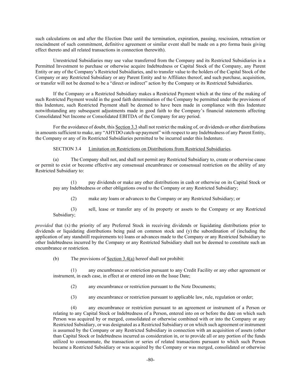 -80- such calculations on and after the Election Date until the termination, expiration, passing, rescission, retraction or rescindment of such commitment, definitive agreement or similar event shall be made on a pro forma basis giving effect thereto and all related transactions in connection therewith). Unrestricted Subsidiaries may use value transferred from the Company and its Restricted Subsidiaries in a Permitted Investment to purchase or otherwise acquire Indebtedness or Capital Stock of the Company, any Parent Entity or any of the Company’s Restricted Subsidiaries, and to transfer value to the holders of the Capital Stock of the Company or any Restricted Subsidiary or any Parent Entity and to Affiliates thereof, and such purchase, acquisition, or transfer will not be deemed to be a “direct or indirect” action by the Company or its Restricted Subsidiaries. If the Company or a Restricted Subsidiary makes a Restricted Payment which at the time of the making of such Restricted Payment would in the good faith determination of the Company be permitted under the provisions of this Indenture, such Restricted Payment shall be deemed to have been made in compliance with this Indenture notwithstanding any subsequent adjustments made in good faith to the Company’s financial statements affecting Consolidated Net Income or Consolidated EBITDA of the Company for any period. For the avoidance of doubt, this Section 3.3 shall not restrict the making of, or dividends or other distributions in amounts sufficient to make, any “AHYDO catch-up payment” with respect to any Indebtedness of any Parent Entity, the Company or any of its Restricted Subsidiaries permitted to be incurred under this Indenture. SECTION 3.4 Limitation on Restrictions on Distributions from Restricted Subsidiaries. (a) The Company shall not, and shall not permit any Restricted Subsidiary to, create or otherwise cause or permit to exist or become effective any consensual encumbrance or consensual restriction on the ability of any Restricted Subsidiary to: (1) pay dividends or make any other distributions in cash or otherwise on its Capital Stock or pay any Indebtedness or other obligations owed to the Company or any Restricted Subsidiary; (2) make any loans or advances to the Company or any Restricted Subsidiary; or (3) sell, lease or transfer any of its property or assets to the Company or any Restricted Subsidiary; provided that (x) the priority of any Preferred Stock in receiving dividends or liquidating distributions prior to dividends or liquidating distributions being paid on common stock and (y) the subordination of (including the application of any standstill requirements to) loans or advances made to the Company or any Restricted Subsidiary to other Indebtedness incurred by the Company or any Restricted Subsidiary shall not be deemed to constitute such an encumbrance or restriction. (b) The provisions of Section 3.4(a) hereof shall not prohibit: (1) any encumbrance or restriction pursuant to any Credit Facility or any other agreement or instrument, in each case, in effect at or entered into on the Issue Date; (2) any encumbrance or restriction pursuant to the Note Documents; (3) any encumbrance or restriction pursuant to applicable law, rule, regulation or order; (4) any encumbrance or restriction pursuant to an agreement or instrument of a Person or relating to any Capital Stock or Indebtedness of a Person, entered into on or before the date on which such Person was acquired by or merged, consolidated or otherwise combined with or into the Company or any Restricted Subsidiary, or was designated as a Restricted Subsidiary or on which such agreement or instrument is assumed by the Company or any Restricted Subsidiary in connection with an acquisition of assets (other than Capital Stock or Indebtedness incurred as consideration in, or to provide all or any portion of the funds utilized to consummate, the transaction or series of related transactions pursuant to which such Person became a Restricted Subsidiary or was acquired by the Company or was merged, consolidated or otherwise