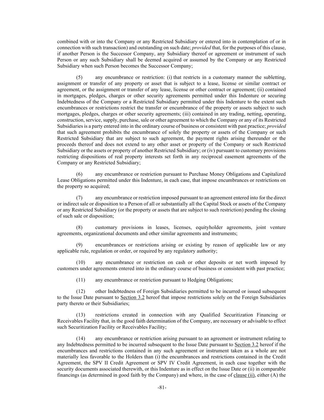 -81- combined with or into the Company or any Restricted Subsidiary or entered into in contemplation of or in connection with such transaction) and outstanding on such date; provided that, for the purposes of this clause, if another Person is the Successor Company, any Subsidiary thereof or agreement or instrument of such Person or any such Subsidiary shall be deemed acquired or assumed by the Company or any Restricted Subsidiary when such Person becomes the Successor Company; (5) any encumbrance or restriction: (i) that restricts in a customary manner the subletting, assignment or transfer of any property or asset that is subject to a lease, license or similar contract or agreement, or the assignment or transfer of any lease, license or other contract or agreement; (ii) contained in mortgages, pledges, charges or other security agreements permitted under this Indenture or securing Indebtedness of the Company or a Restricted Subsidiary permitted under this Indenture to the extent such encumbrances or restrictions restrict the transfer or encumbrance of the property or assets subject to such mortgages, pledges, charges or other security agreements; (iii) contained in any trading, netting, operating, construction, service, supply, purchase, sale or other agreement to which the Company or any of its Restricted Subsidiaries is a party entered into in the ordinary course of business or consistent with past practice; provided that such agreement prohibits the encumbrance of solely the property or assets of the Company or such Restricted Subsidiary that are subject to such agreement, the payment rights arising thereunder or the proceeds thereof and does not extend to any other asset or property of the Company or such Restricted Subsidiary or the assets or property of another Restricted Subsidiary; or (iv) pursuant to customary provisions restricting dispositions of real property interests set forth in any reciprocal easement agreements of the Company or any Restricted Subsidiary; (6) any encumbrance or restriction pursuant to Purchase Money Obligations and Capitalized Lease Obligations permitted under this Indenture, in each case, that impose encumbrances or restrictions on the property so acquired; (7) any encumbrance or restriction imposed pursuant to an agreement entered into for the direct or indirect sale or disposition to a Person of all or substantially all the Capital Stock or assets of the Company or any Restricted Subsidiary (or the property or assets that are subject to such restriction) pending the closing of such sale or disposition; (8) customary provisions in leases, licenses, equityholder agreements, joint venture agreements, organizational documents and other similar agreements and instruments; (9) encumbrances or restrictions arising or existing by reason of applicable law or any applicable rule, regulation or order, or required by any regulatory authority; (10) any encumbrance or restriction on cash or other deposits or net worth imposed by customers under agreements entered into in the ordinary course of business or consistent with past practice; (11) any encumbrance or restriction pursuant to Hedging Obligations; (12) other Indebtedness of Foreign Subsidiaries permitted to be incurred or issued subsequent to the Issue Date pursuant to Section 3.2 hereof that impose restrictions solely on the Foreign Subsidiaries party thereto or their Subsidiaries; (13) restrictions created in connection with any Qualified Securitization Financing or Receivables Facility that, in the good faith determination of the Company, are necessary or advisable to effect such Securitization Facility or Receivables Facility; (14) any encumbrance or restriction arising pursuant to an agreement or instrument relating to any Indebtedness permitted to be incurred subsequent to the Issue Date pursuant to Section 3.2 hereof if the encumbrances and restrictions contained in any such agreement or instrument taken as a whole are not materially less favorable to the Holders than (i) the encumbrances and restrictions contained in the Credit Agreement, the SPV II Credit Agreement or SPV IV Credit Agreement, in each case together with the security documents associated therewith, or this Indenture as in effect on the Issue Date or (ii) in comparable financings (as determined in good faith by the Company) and where, in the case of clause (ii), either (A) the