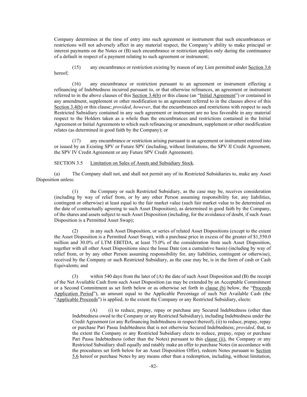 -82- Company determines at the time of entry into such agreement or instrument that such encumbrances or restrictions will not adversely affect in any material respect, the Company’s ability to make principal or interest payments on the Notes or (B) such encumbrance or restriction applies only during the continuance of a default in respect of a payment relating to such agreement or instrument; (15) any encumbrance or restriction existing by reason of any Lien permitted under Section 3.6 hereof; (16) any encumbrance or restriction pursuant to an agreement or instrument effecting a refinancing of Indebtedness incurred pursuant to, or that otherwise refinances, an agreement or instrument referred to in the above clauses of this Section 3.4(b) or this clause (an “Initial Agreement”) or contained in any amendment, supplement or other modification to an agreement referred to in the clauses above of this Section 3.4(b) or this clause; provided, however, that the encumbrances and restrictions with respect to such Restricted Subsidiary contained in any such agreement or instrument are no less favorable in any material respect to the Holders taken as a whole than the encumbrances and restrictions contained in the Initial Agreement or Initial Agreements to which such refinancing or amendment, supplement or other modification relates (as determined in good faith by the Company); or (17) any encumbrance or restriction arising pursuant to an agreement or instrument entered into or issued by an Existing SPV or Future SPV (including, without limitations, the SPV II Credit Agreement, the SPV IV Credit Agreement or any Future SPV Credit Agreement). SECTION 3.5 Limitation on Sales of Assets and Subsidiary Stock. (a) The Company shall not, and shall not permit any of its Restricted Subsidiaries to, make any Asset Disposition unless: (1) the Company or such Restricted Subsidiary, as the case may be, receives consideration (including by way of relief from, or by any other Person assuming responsibility for, any liabilities, contingent or otherwise) at least equal to the fair market value (such fair market value to be determined on the date of contractually agreeing to such Asset Disposition), as determined in good faith by the Company, of the shares and assets subject to such Asset Disposition (including, for the avoidance of doubt, if such Asset Disposition is a Permitted Asset Swap); (2) in any such Asset Disposition, or series of related Asset Dispositions (except to the extent the Asset Disposition is a Permitted Asset Swap), with a purchase price in excess of the greater of $1,550.0 million and 30.0% of LTM EBITDA, at least 75.0% of the consideration from such Asset Disposition, together with all other Asset Dispositions since the Issue Date (on a cumulative basis) (including by way of relief from, or by any other Person assuming responsibility for, any liabilities, contingent or otherwise), received by the Company or such Restricted Subsidiary, as the case may be, is in the form of cash or Cash Equivalents; and (3) within 540 days from the later of (A) the date of such Asset Disposition and (B) the receipt of the Net Available Cash from such Asset Disposition (as may be extended by an Acceptable Commitment or a Second Commitment as set forth below or as otherwise set forth in clause (b) below, the “Proceeds Application Period”), an amount equal to the Applicable Percentage of such Net Available Cash (the “Applicable Proceeds”) is applied, to the extent the Company or any Restricted Subsidiary, elects: (A) (i) to reduce, prepay, repay or purchase any Secured Indebtedness (other than Indebtedness owed to the Company or any Restricted Subsidiary), including Indebtedness under the Credit Agreement (or any Refinancing Indebtedness in respect thereof), (ii) to reduce, prepay, repay or purchase Pari Passu Indebtedness that is not otherwise Secured Indebtedness; provided, that, to the extent the Company or any Restricted Subsidiary elects to reduce, prepay, repay or purchase Pari Passu Indebtedness (other than the Notes) pursuant to this clause (ii), the Company or any Restricted Subsidiary shall equally and ratably make an offer to purchase Notes (in accordance with the procedures set forth below for an Asset Disposition Offer), redeem Notes pursuant to Section 5.6 hereof or purchase Notes by any means other than a redemption, including, without limitation,