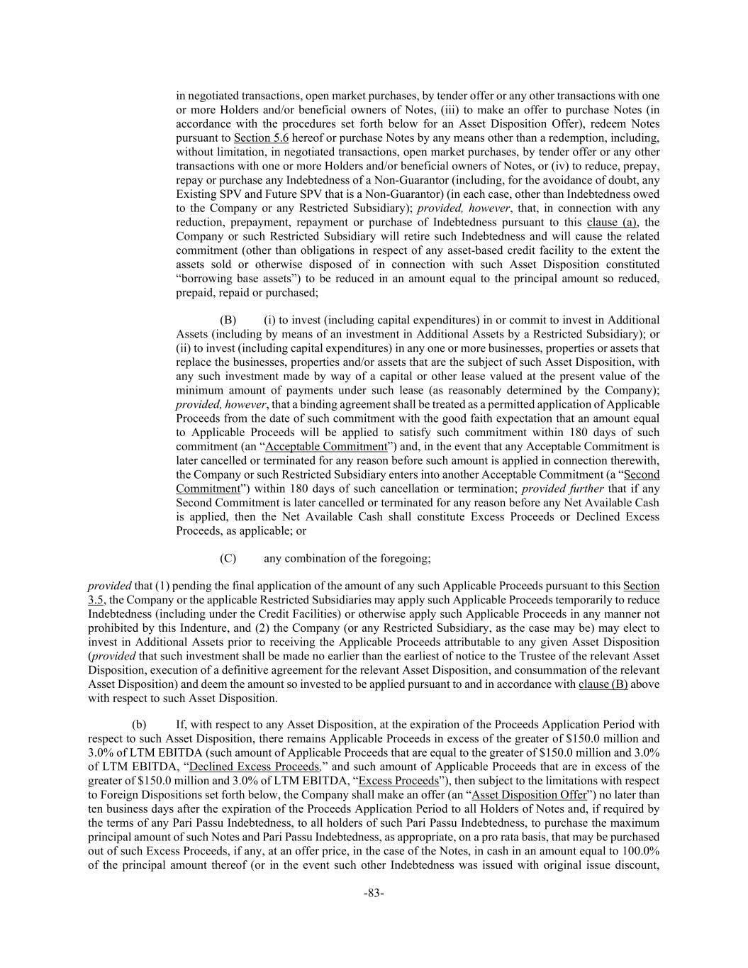 -83- in negotiated transactions, open market purchases, by tender offer or any other transactions with one or more Holders and/or beneficial owners of Notes, (iii) to make an offer to purchase Notes (in accordance with the procedures set forth below for an Asset Disposition Offer), redeem Notes pursuant to Section 5.6 hereof or purchase Notes by any means other than a redemption, including, without limitation, in negotiated transactions, open market purchases, by tender offer or any other transactions with one or more Holders and/or beneficial owners of Notes, or (iv) to reduce, prepay, repay or purchase any Indebtedness of a Non-Guarantor (including, for the avoidance of doubt, any Existing SPV and Future SPV that is a Non-Guarantor) (in each case, other than Indebtedness owed to the Company or any Restricted Subsidiary); provided, however, that, in connection with any reduction, prepayment, repayment or purchase of Indebtedness pursuant to this clause (a), the Company or such Restricted Subsidiary will retire such Indebtedness and will cause the related commitment (other than obligations in respect of any asset-based credit facility to the extent the assets sold or otherwise disposed of in connection with such Asset Disposition constituted “borrowing base assets”) to be reduced in an amount equal to the principal amount so reduced, prepaid, repaid or purchased; (B) (i) to invest (including capital expenditures) in or commit to invest in Additional Assets (including by means of an investment in Additional Assets by a Restricted Subsidiary); or (ii) to invest (including capital expenditures) in any one or more businesses, properties or assets that replace the businesses, properties and/or assets that are the subject of such Asset Disposition, with any such investment made by way of a capital or other lease valued at the present value of the minimum amount of payments under such lease (as reasonably determined by the Company); provided, however, that a binding agreement shall be treated as a permitted application of Applicable Proceeds from the date of such commitment with the good faith expectation that an amount equal to Applicable Proceeds will be applied to satisfy such commitment within 180 days of such commitment (an “Acceptable Commitment”) and, in the event that any Acceptable Commitment is later cancelled or terminated for any reason before such amount is applied in connection therewith, the Company or such Restricted Subsidiary enters into another Acceptable Commitment (a “Second Commitment”) within 180 days of such cancellation or termination; provided further that if any Second Commitment is later cancelled or terminated for any reason before any Net Available Cash is applied, then the Net Available Cash shall constitute Excess Proceeds or Declined Excess Proceeds, as applicable; or (C) any combination of the foregoing; provided that (1) pending the final application of the amount of any such Applicable Proceeds pursuant to this Section 3.5, the Company or the applicable Restricted Subsidiaries may apply such Applicable Proceeds temporarily to reduce Indebtedness (including under the Credit Facilities) or otherwise apply such Applicable Proceeds in any manner not prohibited by this Indenture, and (2) the Company (or any Restricted Subsidiary, as the case may be) may elect to invest in Additional Assets prior to receiving the Applicable Proceeds attributable to any given Asset Disposition (provided that such investment shall be made no earlier than the earliest of notice to the Trustee of the relevant Asset Disposition, execution of a definitive agreement for the relevant Asset Disposition, and consummation of the relevant Asset Disposition) and deem the amount so invested to be applied pursuant to and in accordance with clause (B) above with respect to such Asset Disposition. (b) If, with respect to any Asset Disposition, at the expiration of the Proceeds Application Period with respect to such Asset Disposition, there remains Applicable Proceeds in excess of the greater of $150.0 million and 3.0% of LTM EBITDA (such amount of Applicable Proceeds that are equal to the greater of $150.0 million and 3.0% of LTM EBITDA, “Declined Excess Proceeds,” and such amount of Applicable Proceeds that are in excess of the greater of $150.0 million and 3.0% of LTM EBITDA, “Excess Proceeds”), then subject to the limitations with respect to Foreign Dispositions set forth below, the Company shall make an offer (an “Asset Disposition Offer”) no later than ten business days after the expiration of the Proceeds Application Period to all Holders of Notes and, if required by the terms of any Pari Passu Indebtedness, to all holders of such Pari Passu Indebtedness, to purchase the maximum principal amount of such Notes and Pari Passu Indebtedness, as appropriate, on a pro rata basis, that may be purchased out of such Excess Proceeds, if any, at an offer price, in the case of the Notes, in cash in an amount equal to 100.0% of the principal amount thereof (or in the event such other Indebtedness was issued with original issue discount,