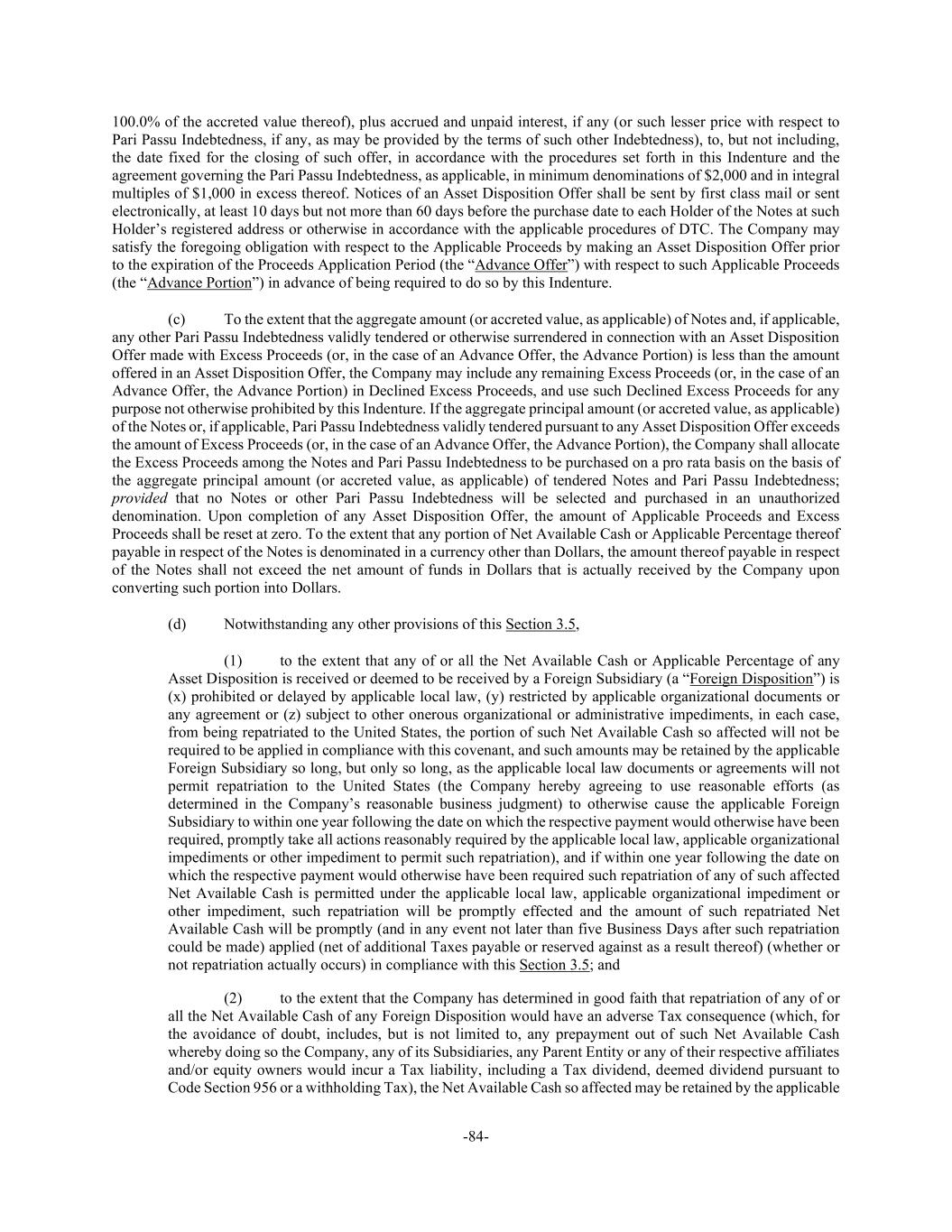 -84- 100.0% of the accreted value thereof), plus accrued and unpaid interest, if any (or such lesser price with respect to Pari Passu Indebtedness, if any, as may be provided by the terms of such other Indebtedness), to, but not including, the date fixed for the closing of such offer, in accordance with the procedures set forth in this Indenture and the agreement governing the Pari Passu Indebtedness, as applicable, in minimum denominations of $2,000 and in integral multiples of $1,000 in excess thereof. Notices of an Asset Disposition Offer shall be sent by first class mail or sent electronically, at least 10 days but not more than 60 days before the purchase date to each Holder of the Notes at such Holder’s registered address or otherwise in accordance with the applicable procedures of DTC. The Company may satisfy the foregoing obligation with respect to the Applicable Proceeds by making an Asset Disposition Offer prior to the expiration of the Proceeds Application Period (the “Advance Offer”) with respect to such Applicable Proceeds (the “Advance Portion”) in advance of being required to do so by this Indenture. (c) To the extent that the aggregate amount (or accreted value, as applicable) of Notes and, if applicable, any other Pari Passu Indebtedness validly tendered or otherwise surrendered in connection with an Asset Disposition Offer made with Excess Proceeds (or, in the case of an Advance Offer, the Advance Portion) is less than the amount offered in an Asset Disposition Offer, the Company may include any remaining Excess Proceeds (or, in the case of an Advance Offer, the Advance Portion) in Declined Excess Proceeds, and use such Declined Excess Proceeds for any purpose not otherwise prohibited by this Indenture. If the aggregate principal amount (or accreted value, as applicable) of the Notes or, if applicable, Pari Passu Indebtedness validly tendered pursuant to any Asset Disposition Offer exceeds the amount of Excess Proceeds (or, in the case of an Advance Offer, the Advance Portion), the Company shall allocate the Excess Proceeds among the Notes and Pari Passu Indebtedness to be purchased on a pro rata basis on the basis of the aggregate principal amount (or accreted value, as applicable) of tendered Notes and Pari Passu Indebtedness; provided that no Notes or other Pari Passu Indebtedness will be selected and purchased in an unauthorized denomination. Upon completion of any Asset Disposition Offer, the amount of Applicable Proceeds and Excess Proceeds shall be reset at zero. To the extent that any portion of Net Available Cash or Applicable Percentage thereof payable in respect of the Notes is denominated in a currency other than Dollars, the amount thereof payable in respect of the Notes shall not exceed the net amount of funds in Dollars that is actually received by the Company upon converting such portion into Dollars. (d) Notwithstanding any other provisions of this Section 3.5, (1) to the extent that any of or all the Net Available Cash or Applicable Percentage of any Asset Disposition is received or deemed to be received by a Foreign Subsidiary (a “Foreign Disposition”) is (x) prohibited or delayed by applicable local law, (y) restricted by applicable organizational documents or any agreement or (z) subject to other onerous organizational or administrative impediments, in each case, from being repatriated to the United States, the portion of such Net Available Cash so affected will not be required to be applied in compliance with this covenant, and such amounts may be retained by the applicable Foreign Subsidiary so long, but only so long, as the applicable local law documents or agreements will not permit repatriation to the United States (the Company hereby agreeing to use reasonable efforts (as determined in the Company’s reasonable business judgment) to otherwise cause the applicable Foreign Subsidiary to within one year following the date on which the respective payment would otherwise have been required, promptly take all actions reasonably required by the applicable local law, applicable organizational impediments or other impediment to permit such repatriation), and if within one year following the date on which the respective payment would otherwise have been required such repatriation of any of such affected Net Available Cash is permitted under the applicable local law, applicable organizational impediment or other impediment, such repatriation will be promptly effected and the amount of such repatriated Net Available Cash will be promptly (and in any event not later than five Business Days after such repatriation could be made) applied (net of additional Taxes payable or reserved against as a result thereof) (whether or not repatriation actually occurs) in compliance with this Section 3.5; and (2) to the extent that the Company has determined in good faith that repatriation of any of or all the Net Available Cash of any Foreign Disposition would have an adverse Tax consequence (which, for the avoidance of doubt, includes, but is not limited to, any prepayment out of such Net Available Cash whereby doing so the Company, any of its Subsidiaries, any Parent Entity or any of their respective affiliates and/or equity owners would incur a Tax liability, including a Tax dividend, deemed dividend pursuant to Code Section 956 or a withholding Tax), the Net Available Cash so affected may be retained by the applicable