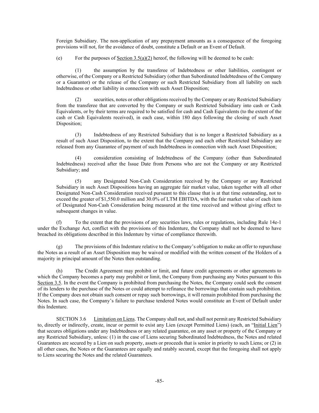 -85- Foreign Subsidiary. The non-application of any prepayment amounts as a consequence of the foregoing provisions will not, for the avoidance of doubt, constitute a Default or an Event of Default. (e) For the purposes of Section 3.5(a)(2) hereof, the following will be deemed to be cash: (1) the assumption by the transferee of Indebtedness or other liabilities, contingent or otherwise, of the Company or a Restricted Subsidiary (other than Subordinated Indebtedness of the Company or a Guarantor) or the release of the Company or such Restricted Subsidiary from all liability on such Indebtedness or other liability in connection with such Asset Disposition; (2) securities, notes or other obligations received by the Company or any Restricted Subsidiary from the transferee that are converted by the Company or such Restricted Subsidiary into cash or Cash Equivalents, or by their terms are required to be satisfied for cash and Cash Equivalents (to the extent of the cash or Cash Equivalents received), in each case, within 180 days following the closing of such Asset Disposition; (3) Indebtedness of any Restricted Subsidiary that is no longer a Restricted Subsidiary as a result of such Asset Disposition, to the extent that the Company and each other Restricted Subsidiary are released from any Guarantee of payment of such Indebtedness in connection with such Asset Disposition; (4) consideration consisting of Indebtedness of the Company (other than Subordinated Indebtedness) received after the Issue Date from Persons who are not the Company or any Restricted Subsidiary; and (5) any Designated Non-Cash Consideration received by the Company or any Restricted Subsidiary in such Asset Dispositions having an aggregate fair market value, taken together with all other Designated Non-Cash Consideration received pursuant to this clause that is at that time outstanding, not to exceed the greater of $1,550.0 million and 30.0% of LTM EBITDA, with the fair market value of each item of Designated Non-Cash Consideration being measured at the time received and without giving effect to subsequent changes in value. (f) To the extent that the provisions of any securities laws, rules or regulations, including Rule 14e-1 under the Exchange Act, conflict with the provisions of this Indenture, the Company shall not be deemed to have breached its obligations described in this Indenture by virtue of compliance therewith. (g) The provisions of this Indenture relative to the Company’s obligation to make an offer to repurchase the Notes as a result of an Asset Disposition may be waived or modified with the written consent of the Holders of a majority in principal amount of the Notes then outstanding. (h) The Credit Agreement may prohibit or limit, and future credit agreements or other agreements to which the Company becomes a party may prohibit or limit, the Company from purchasing any Notes pursuant to this Section 3.5. In the event the Company is prohibited from purchasing the Notes, the Company could seek the consent of its lenders to the purchase of the Notes or could attempt to refinance the borrowings that contain such prohibition. If the Company does not obtain such consent or repay such borrowings, it will remain prohibited from purchasing the Notes. In such case, the Company’s failure to purchase tendered Notes would constitute an Event of Default under this Indenture. SECTION 3.6 Limitation on Liens. The Company shall not, and shall not permit any Restricted Subsidiary to, directly or indirectly, create, incur or permit to exist any Lien (except Permitted Liens) (each, an “Initial Lien”) that secures obligations under any Indebtedness or any related guarantee, on any asset or property of the Company or any Restricted Subsidiary, unless: (1) in the case of Liens securing Subordinated Indebtedness, the Notes and related Guarantees are secured by a Lien on such property, assets or proceeds that is senior in priority to such Liens; or (2) in all other cases, the Notes or the Guarantees are equally and ratably secured, except that the foregoing shall not apply to Liens securing the Notes and the related Guarantees.