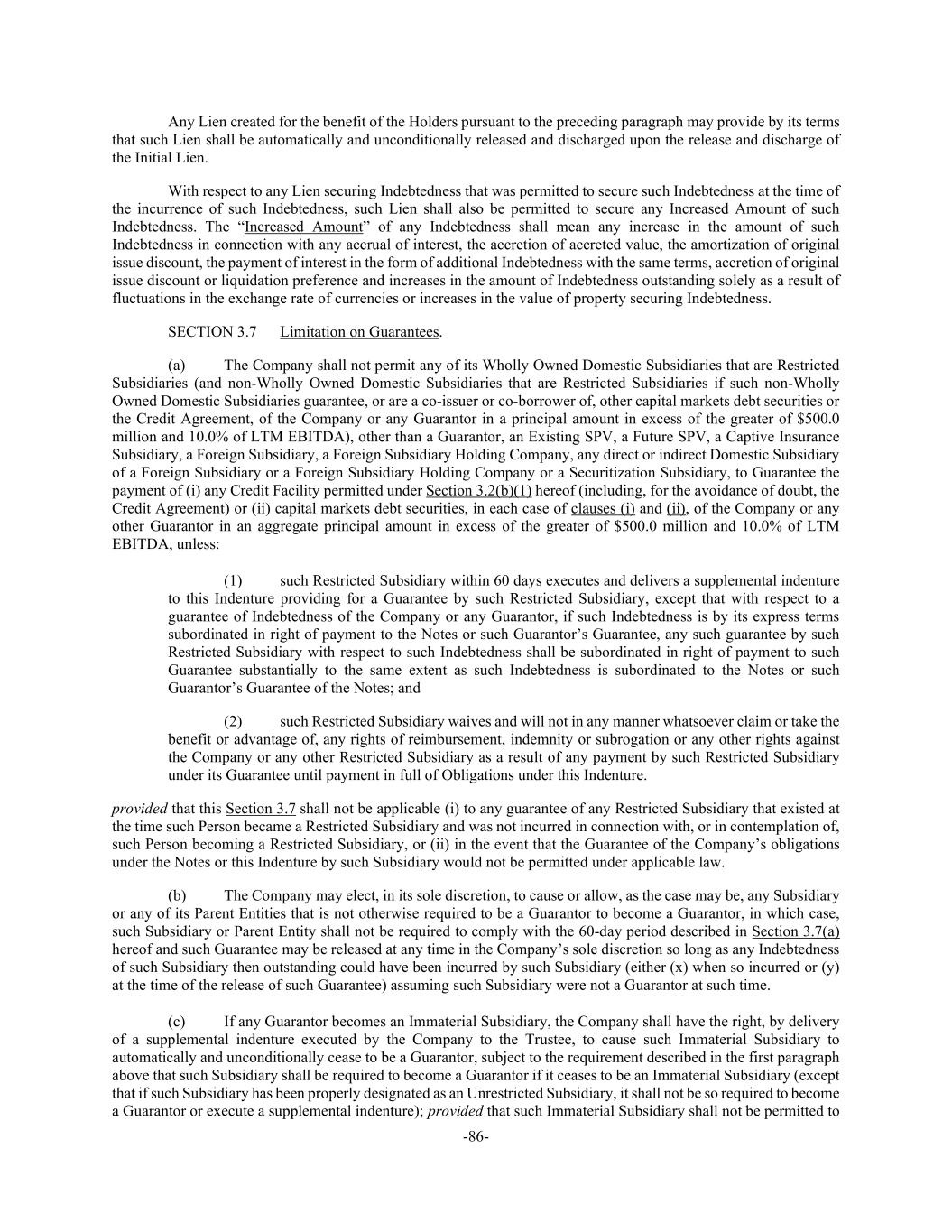 -86- Any Lien created for the benefit of the Holders pursuant to the preceding paragraph may provide by its terms that such Lien shall be automatically and unconditionally released and discharged upon the release and discharge of the Initial Lien. With respect to any Lien securing Indebtedness that was permitted to secure such Indebtedness at the time of the incurrence of such Indebtedness, such Lien shall also be permitted to secure any Increased Amount of such Indebtedness. The “Increased Amount” of any Indebtedness shall mean any increase in the amount of such Indebtedness in connection with any accrual of interest, the accretion of accreted value, the amortization of original issue discount, the payment of interest in the form of additional Indebtedness with the same terms, accretion of original issue discount or liquidation preference and increases in the amount of Indebtedness outstanding solely as a result of fluctuations in the exchange rate of currencies or increases in the value of property securing Indebtedness. SECTION 3.7 Limitation on Guarantees. (a) The Company shall not permit any of its Wholly Owned Domestic Subsidiaries that are Restricted Subsidiaries (and non-Wholly Owned Domestic Subsidiaries that are Restricted Subsidiaries if such non-Wholly Owned Domestic Subsidiaries guarantee, or are a co-issuer or co-borrower of, other capital markets debt securities or the Credit Agreement, of the Company or any Guarantor in a principal amount in excess of the greater of $500.0 million and 10.0% of LTM EBITDA), other than a Guarantor, an Existing SPV, a Future SPV, a Captive Insurance Subsidiary, a Foreign Subsidiary, a Foreign Subsidiary Holding Company, any direct or indirect Domestic Subsidiary of a Foreign Subsidiary or a Foreign Subsidiary Holding Company or a Securitization Subsidiary, to Guarantee the payment of (i) any Credit Facility permitted under Section 3.2(b)(1) hereof (including, for the avoidance of doubt, the Credit Agreement) or (ii) capital markets debt securities, in each case of clauses (i) and (ii), of the Company or any other Guarantor in an aggregate principal amount in excess of the greater of $500.0 million and 10.0% of LTM EBITDA, unless: (1) such Restricted Subsidiary within 60 days executes and delivers a supplemental indenture to this Indenture providing for a Guarantee by such Restricted Subsidiary, except that with respect to a guarantee of Indebtedness of the Company or any Guarantor, if such Indebtedness is by its express terms subordinated in right of payment to the Notes or such Guarantor’s Guarantee, any such guarantee by such Restricted Subsidiary with respect to such Indebtedness shall be subordinated in right of payment to such Guarantee substantially to the same extent as such Indebtedness is subordinated to the Notes or such Guarantor’s Guarantee of the Notes; and (2) such Restricted Subsidiary waives and will not in any manner whatsoever claim or take the benefit or advantage of, any rights of reimbursement, indemnity or subrogation or any other rights against the Company or any other Restricted Subsidiary as a result of any payment by such Restricted Subsidiary under its Guarantee until payment in full of Obligations under this Indenture. provided that this Section 3.7 shall not be applicable (i) to any guarantee of any Restricted Subsidiary that existed at the time such Person became a Restricted Subsidiary and was not incurred in connection with, or in contemplation of, such Person becoming a Restricted Subsidiary, or (ii) in the event that the Guarantee of the Company’s obligations under the Notes or this Indenture by such Subsidiary would not be permitted under applicable law. (b) The Company may elect, in its sole discretion, to cause or allow, as the case may be, any Subsidiary or any of its Parent Entities that is not otherwise required to be a Guarantor to become a Guarantor, in which case, such Subsidiary or Parent Entity shall not be required to comply with the 60-day period described in Section 3.7(a) hereof and such Guarantee may be released at any time in the Company’s sole discretion so long as any Indebtedness of such Subsidiary then outstanding could have been incurred by such Subsidiary (either (x) when so incurred or (y) at the time of the release of such Guarantee) assuming such Subsidiary were not a Guarantor at such time. (c) If any Guarantor becomes an Immaterial Subsidiary, the Company shall have the right, by delivery of a supplemental indenture executed by the Company to the Trustee, to cause such Immaterial Subsidiary to automatically and unconditionally cease to be a Guarantor, subject to the requirement described in the first paragraph above that such Subsidiary shall be required to become a Guarantor if it ceases to be an Immaterial Subsidiary (except that if such Subsidiary has been properly designated as an Unrestricted Subsidiary, it shall not be so required to become a Guarantor or execute a supplemental indenture); provided that such Immaterial Subsidiary shall not be permitted to