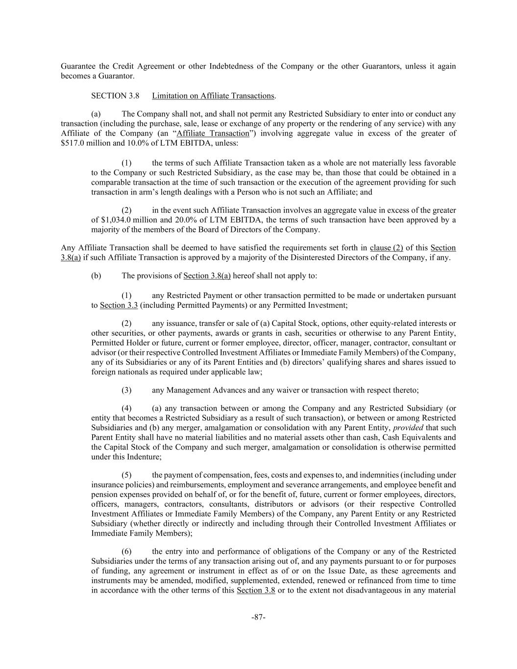 -87- Guarantee the Credit Agreement or other Indebtedness of the Company or the other Guarantors, unless it again becomes a Guarantor. SECTION 3.8 Limitation on Affiliate Transactions. (a) The Company shall not, and shall not permit any Restricted Subsidiary to enter into or conduct any transaction (including the purchase, sale, lease or exchange of any property or the rendering of any service) with any Affiliate of the Company (an “Affiliate Transaction”) involving aggregate value in excess of the greater of $517.0 million and 10.0% of LTM EBITDA, unless: (1) the terms of such Affiliate Transaction taken as a whole are not materially less favorable to the Company or such Restricted Subsidiary, as the case may be, than those that could be obtained in a comparable transaction at the time of such transaction or the execution of the agreement providing for such transaction in arm’s length dealings with a Person who is not such an Affiliate; and (2) in the event such Affiliate Transaction involves an aggregate value in excess of the greater of $1,034.0 million and 20.0% of LTM EBITDA, the terms of such transaction have been approved by a majority of the members of the Board of Directors of the Company. Any Affiliate Transaction shall be deemed to have satisfied the requirements set forth in clause (2) of this Section 3.8(a) if such Affiliate Transaction is approved by a majority of the Disinterested Directors of the Company, if any. (b) The provisions of Section 3.8(a) hereof shall not apply to: (1) any Restricted Payment or other transaction permitted to be made or undertaken pursuant to Section 3.3 (including Permitted Payments) or any Permitted Investment; (2) any issuance, transfer or sale of (a) Capital Stock, options, other equity-related interests or other securities, or other payments, awards or grants in cash, securities or otherwise to any Parent Entity, Permitted Holder or future, current or former employee, director, officer, manager, contractor, consultant or advisor (or their respective Controlled Investment Affiliates or Immediate Family Members) of the Company, any of its Subsidiaries or any of its Parent Entities and (b) directors’ qualifying shares and shares issued to foreign nationals as required under applicable law; (3) any Management Advances and any waiver or transaction with respect thereto; (4) (a) any transaction between or among the Company and any Restricted Subsidiary (or entity that becomes a Restricted Subsidiary as a result of such transaction), or between or among Restricted Subsidiaries and (b) any merger, amalgamation or consolidation with any Parent Entity, provided that such Parent Entity shall have no material liabilities and no material assets other than cash, Cash Equivalents and the Capital Stock of the Company and such merger, amalgamation or consolidation is otherwise permitted under this Indenture; (5) the payment of compensation, fees, costs and expenses to, and indemnities (including under insurance policies) and reimbursements, employment and severance arrangements, and employee benefit and pension expenses provided on behalf of, or for the benefit of, future, current or former employees, directors, officers, managers, contractors, consultants, distributors or advisors (or their respective Controlled Investment Affiliates or Immediate Family Members) of the Company, any Parent Entity or any Restricted Subsidiary (whether directly or indirectly and including through their Controlled Investment Affiliates or Immediate Family Members); (6) the entry into and performance of obligations of the Company or any of the Restricted Subsidiaries under the terms of any transaction arising out of, and any payments pursuant to or for purposes of funding, any agreement or instrument in effect as of or on the Issue Date, as these agreements and instruments may be amended, modified, supplemented, extended, renewed or refinanced from time to time in accordance with the other terms of this Section 3.8 or to the extent not disadvantageous in any material