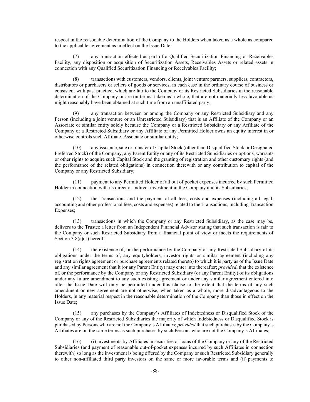 -88- respect in the reasonable determination of the Company to the Holders when taken as a whole as compared to the applicable agreement as in effect on the Issue Date; (7) any transaction effected as part of a Qualified Securitization Financing or Receivables Facility, any disposition or acquisition of Securitization Assets, Receivables Assets or related assets in connection with any Qualified Securitization Financing or Receivables Facility; (8) transactions with customers, vendors, clients, joint venture partners, suppliers, contractors, distributors or purchasers or sellers of goods or services, in each case in the ordinary course of business or consistent with past practice, which are fair to the Company or its Restricted Subsidiaries in the reasonable determination of the Company or are on terms, taken as a whole, that are not materially less favorable as might reasonably have been obtained at such time from an unaffiliated party; (9) any transaction between or among the Company or any Restricted Subsidiary and any Person (including a joint venture or an Unrestricted Subsidiary) that is an Affiliate of the Company or an Associate or similar entity solely because the Company or a Restricted Subsidiary or any Affiliate of the Company or a Restricted Subsidiary or any Affiliate of any Permitted Holder owns an equity interest in or otherwise controls such Affiliate, Associate or similar entity; (10) any issuance, sale or transfer of Capital Stock (other than Disqualified Stock or Designated Preferred Stock) of the Company, any Parent Entity or any of its Restricted Subsidiaries or options, warrants or other rights to acquire such Capital Stock and the granting of registration and other customary rights (and the performance of the related obligations) in connection therewith or any contribution to capital of the Company or any Restricted Subsidiary; (11) payment to any Permitted Holder of all out of pocket expenses incurred by such Permitted Holder in connection with its direct or indirect investment in the Company and its Subsidiaries; (12) the Transactions and the payment of all fees, costs and expenses (including all legal, accounting and other professional fees, costs and expenses) related to the Transactions, including Transaction Expenses; (13) transactions in which the Company or any Restricted Subsidiary, as the case may be, delivers to the Trustee a letter from an Independent Financial Advisor stating that such transaction is fair to the Company or such Restricted Subsidiary from a financial point of view or meets the requirements of Section 3.8(a)(1) hereof; (14) the existence of, or the performance by the Company or any Restricted Subsidiary of its obligations under the terms of, any equityholders, investor rights or similar agreement (including any registration rights agreement or purchase agreements related thereto) to which it is party as of the Issue Date and any similar agreement that it (or any Parent Entity) may enter into thereafter; provided, that the existence of, or the performance by the Company or any Restricted Subsidiary (or any Parent Entity) of its obligations under any future amendment to any such existing agreement or under any similar agreement entered into after the Issue Date will only be permitted under this clause to the extent that the terms of any such amendment or new agreement are not otherwise, when taken as a whole, more disadvantageous to the Holders, in any material respect in the reasonable determination of the Company than those in effect on the Issue Date; (15) any purchases by the Company’s Affiliates of Indebtedness or Disqualified Stock of the Company or any of the Restricted Subsidiaries the majority of which Indebtedness or Disqualified Stock is purchased by Persons who are not the Company’s Affiliates; provided that such purchases by the Company’s Affiliates are on the same terms as such purchases by such Persons who are not the Company’s Affiliates; (16) (i) investments by Affiliates in securities or loans of the Company or any of the Restricted Subsidiaries (and payment of reasonable out-of-pocket expenses incurred by such Affiliates in connection therewith) so long as the investment is being offered by the Company or such Restricted Subsidiary generally to other non-affiliated third party investors on the same or more favorable terms and (ii) payments to