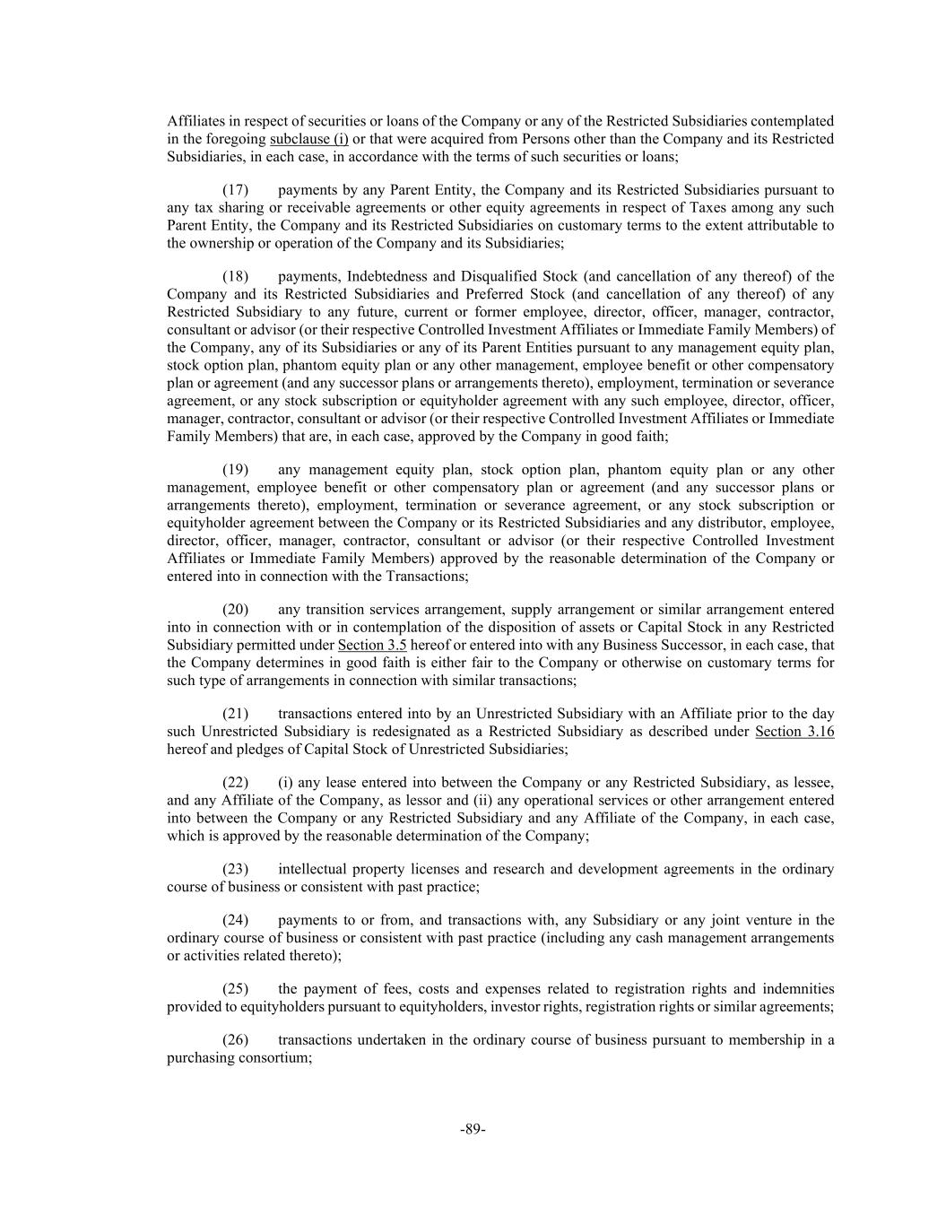 -89- Affiliates in respect of securities or loans of the Company or any of the Restricted Subsidiaries contemplated in the foregoing subclause (i) or that were acquired from Persons other than the Company and its Restricted Subsidiaries, in each case, in accordance with the terms of such securities or loans; (17) payments by any Parent Entity, the Company and its Restricted Subsidiaries pursuant to any tax sharing or receivable agreements or other equity agreements in respect of Taxes among any such Parent Entity, the Company and its Restricted Subsidiaries on customary terms to the extent attributable to the ownership or operation of the Company and its Subsidiaries; (18) payments, Indebtedness and Disqualified Stock (and cancellation of any thereof) of the Company and its Restricted Subsidiaries and Preferred Stock (and cancellation of any thereof) of any Restricted Subsidiary to any future, current or former employee, director, officer, manager, contractor, consultant or advisor (or their respective Controlled Investment Affiliates or Immediate Family Members) of the Company, any of its Subsidiaries or any of its Parent Entities pursuant to any management equity plan, stock option plan, phantom equity plan or any other management, employee benefit or other compensatory plan or agreement (and any successor plans or arrangements thereto), employment, termination or severance agreement, or any stock subscription or equityholder agreement with any such employee, director, officer, manager, contractor, consultant or advisor (or their respective Controlled Investment Affiliates or Immediate Family Members) that are, in each case, approved by the Company in good faith; (19) any management equity plan, stock option plan, phantom equity plan or any other management, employee benefit or other compensatory plan or agreement (and any successor plans or arrangements thereto), employment, termination or severance agreement, or any stock subscription or equityholder agreement between the Company or its Restricted Subsidiaries and any distributor, employee, director, officer, manager, contractor, consultant or advisor (or their respective Controlled Investment Affiliates or Immediate Family Members) approved by the reasonable determination of the Company or entered into in connection with the Transactions; (20) any transition services arrangement, supply arrangement or similar arrangement entered into in connection with or in contemplation of the disposition of assets or Capital Stock in any Restricted Subsidiary permitted under Section 3.5 hereof or entered into with any Business Successor, in each case, that the Company determines in good faith is either fair to the Company or otherwise on customary terms for such type of arrangements in connection with similar transactions; (21) transactions entered into by an Unrestricted Subsidiary with an Affiliate prior to the day such Unrestricted Subsidiary is redesignated as a Restricted Subsidiary as described under Section 3.16 hereof and pledges of Capital Stock of Unrestricted Subsidiaries; (22) (i) any lease entered into between the Company or any Restricted Subsidiary, as lessee, and any Affiliate of the Company, as lessor and (ii) any operational services or other arrangement entered into between the Company or any Restricted Subsidiary and any Affiliate of the Company, in each case, which is approved by the reasonable determination of the Company; (23) intellectual property licenses and research and development agreements in the ordinary course of business or consistent with past practice; (24) payments to or from, and transactions with, any Subsidiary or any joint venture in the ordinary course of business or consistent with past practice (including any cash management arrangements or activities related thereto); (25) the payment of fees, costs and expenses related to registration rights and indemnities provided to equityholders pursuant to equityholders, investor rights, registration rights or similar agreements; (26) transactions undertaken in the ordinary course of business pursuant to membership in a purchasing consortium;