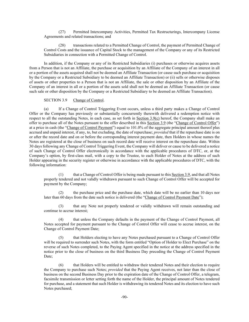 -90- (27) Permitted Intercompany Activities, Permitted Tax Restructurings, Intercompany License Agreements and related transactions; and (28) transactions related to a Permitted Change of Control, the payment of Permitted Change of Control Costs and the issuance of Capital Stock to the management of the Company or any of its Restricted Subsidiaries in connection with a Permitted Change of Control. In addition, if the Company or any of its Restricted Subsidiaries (i) purchases or otherwise acquires assets from a Person that is not an Affiliate, the purchase or acquisition by an Affiliate of the Company of an interest in all or a portion of the assets acquired shall not be deemed an Affiliate Transaction (or cause such purchase or acquisition by the Company or a Restricted Subsidiary to be deemed an Affiliate Transaction) or (ii) sells or otherwise disposes of assets or other properties to a Person that is not an Affiliate, the sale or other disposition by an Affiliate of the Company of an interest in all or a portion of the assets sold shall not be deemed an Affiliate Transaction (or cause such sale or other disposition by the Company or a Restricted Subsidiary to be deemed an Affiliate Transaction). SECTION 3.9 Change of Control. (a) If a Change of Control Triggering Event occurs, unless a third party makes a Change of Control Offer or the Company has previously or substantially concurrently therewith delivered a redemption notice with respect to all the outstanding Notes, in each case, as set forth in Section 3.9(c) hereof, the Company shall make an offer to purchase all of the Notes pursuant to the offer described in this Section 3.9 (the “Change of Control Offer”) at a price in cash (the “Change of Control Payment”) equal to 101.0% of the aggregate principal amount thereof plus accrued and unpaid interest, if any, to, but excluding, the date of repurchase; provided that if the repurchase date is on or after the record date and on or before the corresponding interest payment date, then Holders in whose names the Notes are registered at the close of business on such record date will receive interest on the repurchase date. Within 30 days following any Change of Control Triggering Event, the Company will deliver or cause to be delivered a notice of such Change of Control Offer electronically in accordance with the applicable procedures of DTC, or, at the Company’s option, by first-class mail, with a copy to the Trustee, to each Holder of Notes at the address of such Holder appearing in the security register or otherwise in accordance with the applicable procedures of DTC, with the following information: (1) that a Change of Control Offer is being made pursuant to this Section 3.9, and that all Notes properly tendered and not validly withdrawn pursuant to such Change of Control Offer will be accepted for payment by the Company; (2) the purchase price and the purchase date, which date will be no earlier than 10 days nor later than 60 days from the date such notice is delivered (the “Change of Control Payment Date”); (3) that any Note not properly tendered or validly withdrawn will remain outstanding and continue to accrue interest; (4) that unless the Company defaults in the payment of the Change of Control Payment, all Notes accepted for payment pursuant to the Change of Control Offer will cease to accrue interest, on the Change of Control Payment Date; (5) that Holders electing to have any Notes purchased pursuant to a Change of Control Offer will be required to surrender such Notes, with the form entitled “Option of Holder to Elect Purchase” on the reverse of such Notes completed, to the Paying Agent specified in the notice at the address specified in the notice prior to the close of business on the third Business Day preceding the Change of Control Payment Date; (6) that Holders will be entitled to withdraw their tendered Notes and their election to require the Company to purchase such Notes; provided that the Paying Agent receives, not later than the close of business on the second Business Day prior to the expiration date of the Change of Control Offer, a telegram, facsimile transmission or letter setting forth the name of the Holder, the principal amount of Notes tendered for purchase, and a statement that such Holder is withdrawing its tendered Notes and its election to have such Notes purchased;