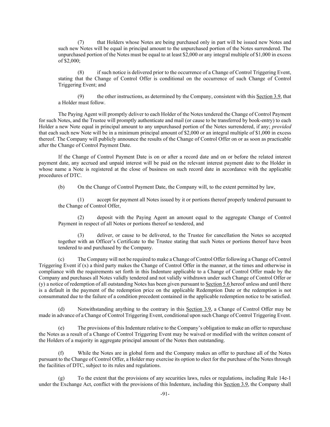 -91- (7) that Holders whose Notes are being purchased only in part will be issued new Notes and such new Notes will be equal in principal amount to the unpurchased portion of the Notes surrendered. The unpurchased portion of the Notes must be equal to at least $2,000 or any integral multiple of $1,000 in excess of $2,000; (8) if such notice is delivered prior to the occurrence of a Change of Control Triggering Event, stating that the Change of Control Offer is conditional on the occurrence of such Change of Control Triggering Event; and (9) the other instructions, as determined by the Company, consistent with this Section 3.9, that a Holder must follow. The Paying Agent will promptly deliver to each Holder of the Notes tendered the Change of Control Payment for such Notes, and the Trustee will promptly authenticate and mail (or cause to be transferred by book-entry) to each Holder a new Note equal in principal amount to any unpurchased portion of the Notes surrendered, if any; provided that each such new Note will be in a minimum principal amount of $2,000 or an integral multiple of $1,000 in excess thereof. The Company will publicly announce the results of the Change of Control Offer on or as soon as practicable after the Change of Control Payment Date. If the Change of Control Payment Date is on or after a record date and on or before the related interest payment date, any accrued and unpaid interest will be paid on the relevant interest payment date to the Holder in whose name a Note is registered at the close of business on such record date in accordance with the applicable procedures of DTC. (b) On the Change of Control Payment Date, the Company will, to the extent permitted by law, (1) accept for payment all Notes issued by it or portions thereof properly tendered pursuant to the Change of Control Offer, (2) deposit with the Paying Agent an amount equal to the aggregate Change of Control Payment in respect of all Notes or portions thereof so tendered, and (3) deliver, or cause to be delivered, to the Trustee for cancellation the Notes so accepted together with an Officer’s Certificate to the Trustee stating that such Notes or portions thereof have been tendered to and purchased by the Company. (c) The Company will not be required to make a Change of Control Offer following a Change of Control Triggering Event if (x) a third party makes the Change of Control Offer in the manner, at the times and otherwise in compliance with the requirements set forth in this Indenture applicable to a Change of Control Offer made by the Company and purchases all Notes validly tendered and not validly withdrawn under such Change of Control Offer or (y) a notice of redemption of all outstanding Notes has been given pursuant to Section 5.6 hereof unless and until there is a default in the payment of the redemption price on the applicable Redemption Date or the redemption is not consummated due to the failure of a condition precedent contained in the applicable redemption notice to be satisfied. (d) Notwithstanding anything to the contrary in this Section 3.9, a Change of Control Offer may be made in advance of a Change of Control Triggering Event, conditional upon such Change of Control Triggering Event. (e) The provisions of this Indenture relative to the Company’s obligation to make an offer to repurchase the Notes as a result of a Change of Control Triggering Event may be waived or modified with the written consent of the Holders of a majority in aggregate principal amount of the Notes then outstanding. (f) While the Notes are in global form and the Company makes an offer to purchase all of the Notes pursuant to the Change of Control Offer, a Holder may exercise its option to elect for the purchase of the Notes through the facilities of DTC, subject to its rules and regulations. (g) To the extent that the provisions of any securities laws, rules or regulations, including Rule 14e-1 under the Exchange Act, conflict with the provisions of this Indenture, including this Section 3.9, the Company shall