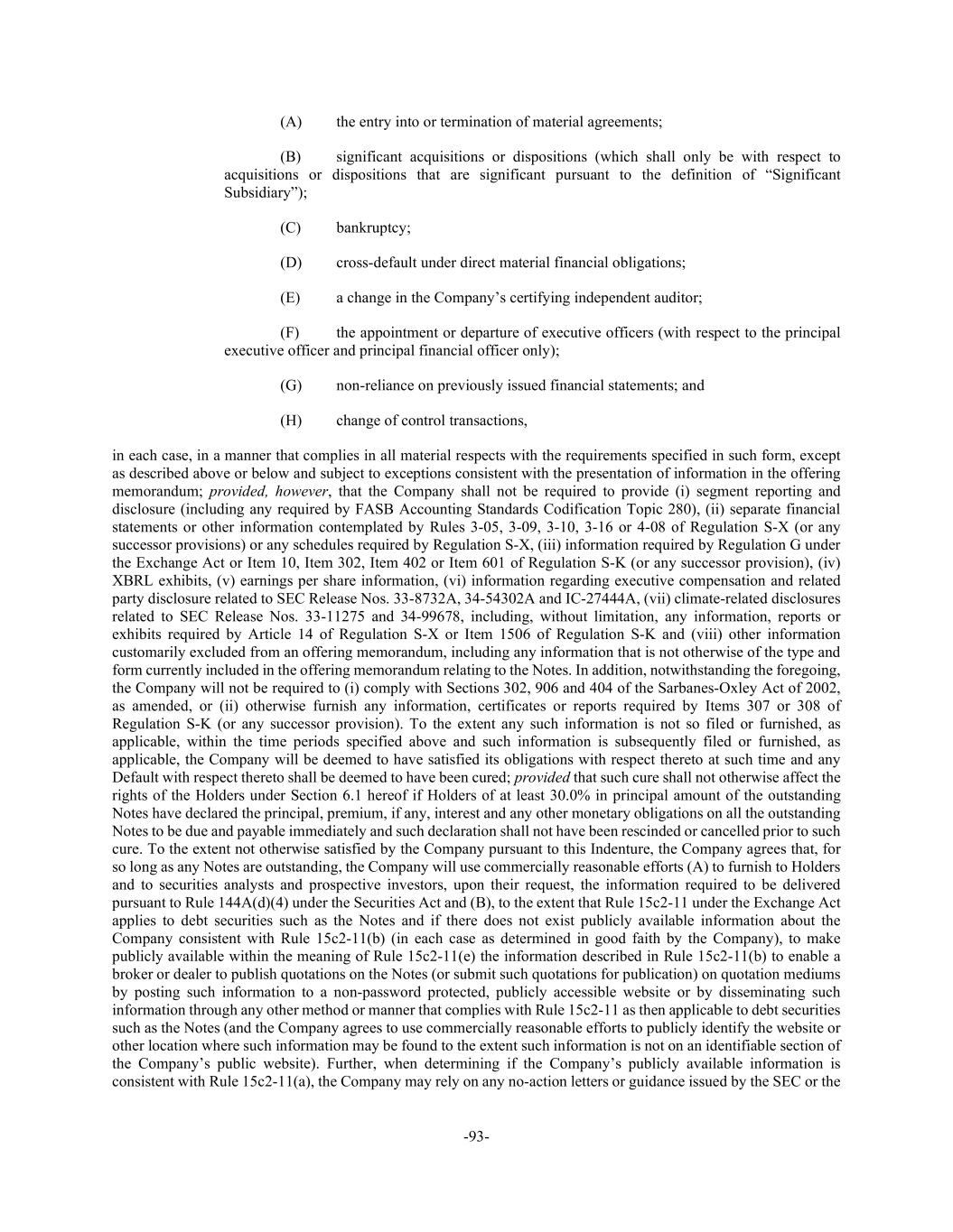 -93- (A) the entry into or termination of material agreements; (B) significant acquisitions or dispositions (which shall only be with respect to acquisitions or dispositions that are significant pursuant to the definition of “Significant Subsidiary”); (C) bankruptcy; (D) cross-default under direct material financial obligations; (E) a change in the Company’s certifying independent auditor; (F) the appointment or departure of executive officers (with respect to the principal executive officer and principal financial officer only); (G) non-reliance on previously issued financial statements; and (H) change of control transactions, in each case, in a manner that complies in all material respects with the requirements specified in such form, except as described above or below and subject to exceptions consistent with the presentation of information in the offering memorandum; provided, however, that the Company shall not be required to provide (i) segment reporting and disclosure (including any required by FASB Accounting Standards Codification Topic 280), (ii) separate financial statements or other information contemplated by Rules 3-05, 3-09, 3-10, 3-16 or 4-08 of Regulation S-X (or any successor provisions) or any schedules required by Regulation S-X, (iii) information required by Regulation G under the Exchange Act or Item 10, Item 302, Item 402 or Item 601 of Regulation S-K (or any successor provision), (iv) XBRL exhibits, (v) earnings per share information, (vi) information regarding executive compensation and related party disclosure related to SEC Release Nos. 33-8732A, 34-54302A and IC-27444A, (vii) climate-related disclosures related to SEC Release Nos. 33-11275 and 34-99678, including, without limitation, any information, reports or exhibits required by Article 14 of Regulation S-X or Item 1506 of Regulation S-K and (viii) other information customarily excluded from an offering memorandum, including any information that is not otherwise of the type and form currently included in the offering memorandum relating to the Notes. In addition, notwithstanding the foregoing, the Company will not be required to (i) comply with Sections 302, 906 and 404 of the Sarbanes-Oxley Act of 2002, as amended, or (ii) otherwise furnish any information, certificates or reports required by Items 307 or 308 of Regulation S-K (or any successor provision). To the extent any such information is not so filed or furnished, as applicable, within the time periods specified above and such information is subsequently filed or furnished, as applicable, the Company will be deemed to have satisfied its obligations with respect thereto at such time and any Default with respect thereto shall be deemed to have been cured; provided that such cure shall not otherwise affect the rights of the Holders under Section 6.1 hereof if Holders of at least 30.0% in principal amount of the outstanding Notes have declared the principal, premium, if any, interest and any other monetary obligations on all the outstanding Notes to be due and payable immediately and such declaration shall not have been rescinded or cancelled prior to such cure. To the extent not otherwise satisfied by the Company pursuant to this Indenture, the Company agrees that, for so long as any Notes are outstanding, the Company will use commercially reasonable efforts (A) to furnish to Holders and to securities analysts and prospective investors, upon their request, the information required to be delivered pursuant to Rule 144A(d)(4) under the Securities Act and (B), to the extent that Rule 15c2-11 under the Exchange Act applies to debt securities such as the Notes and if there does not exist publicly available information about the Company consistent with Rule 15c2-11(b) (in each case as determined in good faith by the Company), to make publicly available within the meaning of Rule 15c2-11(e) the information described in Rule 15c2-11(b) to enable a broker or dealer to publish quotations on the Notes (or submit such quotations for publication) on quotation mediums by posting such information to a non-password protected, publicly accessible website or by disseminating such information through any other method or manner that complies with Rule 15c2-11 as then applicable to debt securities such as the Notes (and the Company agrees to use commercially reasonable efforts to publicly identify the website or other location where such information may be found to the extent such information is not on an identifiable section of the Company’s public website). Further, when determining if the Company’s publicly available information is consistent with Rule 15c2-11(a), the Company may rely on any no-action letters or guidance issued by the SEC or the