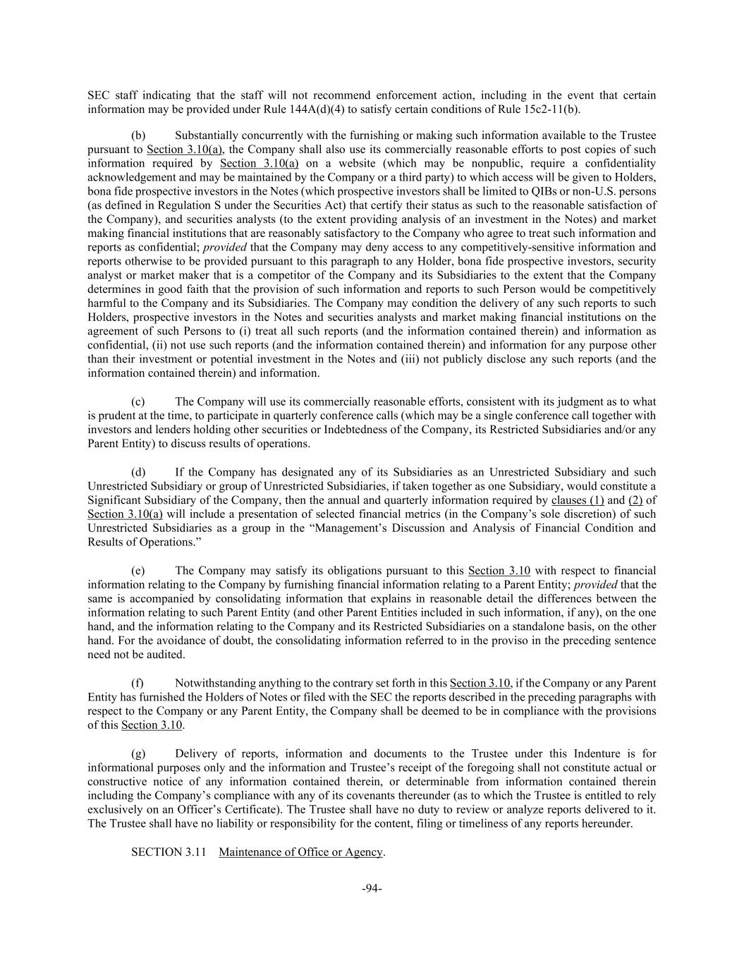 -94- SEC staff indicating that the staff will not recommend enforcement action, including in the event that certain information may be provided under Rule 144A(d)(4) to satisfy certain conditions of Rule 15c2-11(b). (b) Substantially concurrently with the furnishing or making such information available to the Trustee pursuant to Section 3.10(a), the Company shall also use its commercially reasonable efforts to post copies of such information required by Section 3.10(a) on a website (which may be nonpublic, require a confidentiality acknowledgement and may be maintained by the Company or a third party) to which access will be given to Holders, bona fide prospective investors in the Notes (which prospective investors shall be limited to QIBs or non-U.S. persons (as defined in Regulation S under the Securities Act) that certify their status as such to the reasonable satisfaction of the Company), and securities analysts (to the extent providing analysis of an investment in the Notes) and market making financial institutions that are reasonably satisfactory to the Company who agree to treat such information and reports as confidential; provided that the Company may deny access to any competitively-sensitive information and reports otherwise to be provided pursuant to this paragraph to any Holder, bona fide prospective investors, security analyst or market maker that is a competitor of the Company and its Subsidiaries to the extent that the Company determines in good faith that the provision of such information and reports to such Person would be competitively harmful to the Company and its Subsidiaries. The Company may condition the delivery of any such reports to such Holders, prospective investors in the Notes and securities analysts and market making financial institutions on the agreement of such Persons to (i) treat all such reports (and the information contained therein) and information as confidential, (ii) not use such reports (and the information contained therein) and information for any purpose other than their investment or potential investment in the Notes and (iii) not publicly disclose any such reports (and the information contained therein) and information. (c) The Company will use its commercially reasonable efforts, consistent with its judgment as to what is prudent at the time, to participate in quarterly conference calls (which may be a single conference call together with investors and lenders holding other securities or Indebtedness of the Company, its Restricted Subsidiaries and/or any Parent Entity) to discuss results of operations. (d) If the Company has designated any of its Subsidiaries as an Unrestricted Subsidiary and such Unrestricted Subsidiary or group of Unrestricted Subsidiaries, if taken together as one Subsidiary, would constitute a Significant Subsidiary of the Company, then the annual and quarterly information required by clauses (1) and (2) of Section 3.10(a) will include a presentation of selected financial metrics (in the Company’s sole discretion) of such Unrestricted Subsidiaries as a group in the “Management’s Discussion and Analysis of Financial Condition and Results of Operations.” (e) The Company may satisfy its obligations pursuant to this Section 3.10 with respect to financial information relating to the Company by furnishing financial information relating to a Parent Entity; provided that the same is accompanied by consolidating information that explains in reasonable detail the differences between the information relating to such Parent Entity (and other Parent Entities included in such information, if any), on the one hand, and the information relating to the Company and its Restricted Subsidiaries on a standalone basis, on the other hand. For the avoidance of doubt, the consolidating information referred to in the proviso in the preceding sentence need not be audited. (f) Notwithstanding anything to the contrary set forth in this Section 3.10, if the Company or any Parent Entity has furnished the Holders of Notes or filed with the SEC the reports described in the preceding paragraphs with respect to the Company or any Parent Entity, the Company shall be deemed to be in compliance with the provisions of this Section 3.10. (g) Delivery of reports, information and documents to the Trustee under this Indenture is for informational purposes only and the information and Trustee’s receipt of the foregoing shall not constitute actual or constructive notice of any information contained therein, or determinable from information contained therein including the Company’s compliance with any of its covenants thereunder (as to which the Trustee is entitled to rely exclusively on an Officer’s Certificate). The Trustee shall have no duty to review or analyze reports delivered to it. The Trustee shall have no liability or responsibility for the content, filing or timeliness of any reports hereunder. SECTION 3.11 Maintenance of Office or Agency.