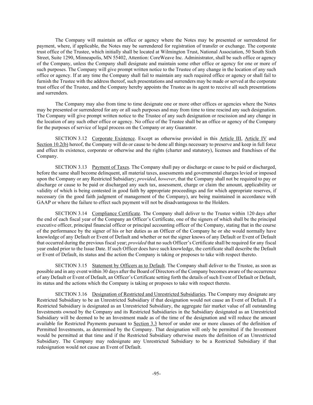 -95- The Company will maintain an office or agency where the Notes may be presented or surrendered for payment, where, if applicable, the Notes may be surrendered for registration of transfer or exchange. The corporate trust office of the Trustee, which initially shall be located at Wilmington Trust, National Association, 50 South Sixth Street, Suite 1290, Minneapolis, MN 55402, Attention: CoreWeave Inc. Administrator, shall be such office or agency of the Company, unless the Company shall designate and maintain some other office or agency for one or more of such purposes. The Company will give prompt written notice to the Trustee of any change in the location of any such office or agency. If at any time the Company shall fail to maintain any such required office or agency or shall fail to furnish the Trustee with the address thereof, such presentations and surrenders may be made or served at the corporate trust office of the Trustee, and the Company hereby appoints the Trustee as its agent to receive all such presentations and surrenders. The Company may also from time to time designate one or more other offices or agencies where the Notes may be presented or surrendered for any or all such purposes and may from time to time rescind any such designation. The Company will give prompt written notice to the Trustee of any such designation or rescission and any change in the location of any such other office or agency. No office of the Trustee shall be an office or agency of the Company for the purposes of service of legal process on the Company or any Guarantor. SECTION 3.12 Corporate Existence. Except as otherwise provided in this Article III, Article IV and Section 10.2(b) hereof, the Company will do or cause to be done all things necessary to preserve and keep in full force and effect its existence, corporate or otherwise and the rights (charter and statutory), licenses and franchises of the Company. SECTION 3.13 Payment of Taxes. The Company shall pay or discharge or cause to be paid or discharged, before the same shall become delinquent, all material taxes, assessments and governmental charges levied or imposed upon the Company or any Restricted Subsidiary; provided, however, that the Company shall not be required to pay or discharge or cause to be paid or discharged any such tax, assessment, charge or claim the amount, applicability or validity of which is being contested in good faith by appropriate proceedings and for which appropriate reserves, if necessary (in the good faith judgment of management of the Company), are being maintained in accordance with GAAP or where the failure to effect such payment will not be disadvantageous to the Holders. SECTION 3.14 Compliance Certificate. The Company shall deliver to the Trustee within 120 days after the end of each fiscal year of the Company an Officer’s Certificate, one of the signers of which shall be the principal executive officer, principal financial officer or principal accounting officer of the Company, stating that in the course of the performance by the signer of his or her duties as an Officer of the Company he or she would normally have knowledge of any Default or Event of Default and whether or not the signer knows of any Default or Event of Default that occurred during the previous fiscal year; provided that no such Officer’s Certificate shall be required for any fiscal year ended prior to the Issue Date. If such Officer does have such knowledge, the certificate shall describe the Default or Event of Default, its status and the action the Company is taking or proposes to take with respect thereto. SECTION 3.15 Statement by Officers as to Default. The Company shall deliver to the Trustee, as soon as possible and in any event within 30 days after the Board of Directors of the Company becomes aware of the occurrence of any Default or Event of Default, an Officer’s Certificate setting forth the details of such Event of Default or Default, its status and the actions which the Company is taking or proposes to take with respect thereto. SECTION 3.16 Designation of Restricted and Unrestricted Subsidiaries. The Company may designate any Restricted Subsidiary to be an Unrestricted Subsidiary if that designation would not cause an Event of Default. If a Restricted Subsidiary is designated as an Unrestricted Subsidiary, the aggregate fair market value of all outstanding Investments owned by the Company and its Restricted Subsidiaries in the Subsidiary designated as an Unrestricted Subsidiary will be deemed to be an Investment made as of the time of the designation and will reduce the amount available for Restricted Payments pursuant to Section 3.3 hereof or under one or more clauses of the definition of Permitted Investments, as determined by the Company. That designation will only be permitted if the Investment would be permitted at that time and if the Restricted Subsidiary otherwise meets the definition of an Unrestricted Subsidiary. The Company may redesignate any Unrestricted Subsidiary to be a Restricted Subsidiary if that redesignation would not cause an Event of Default.