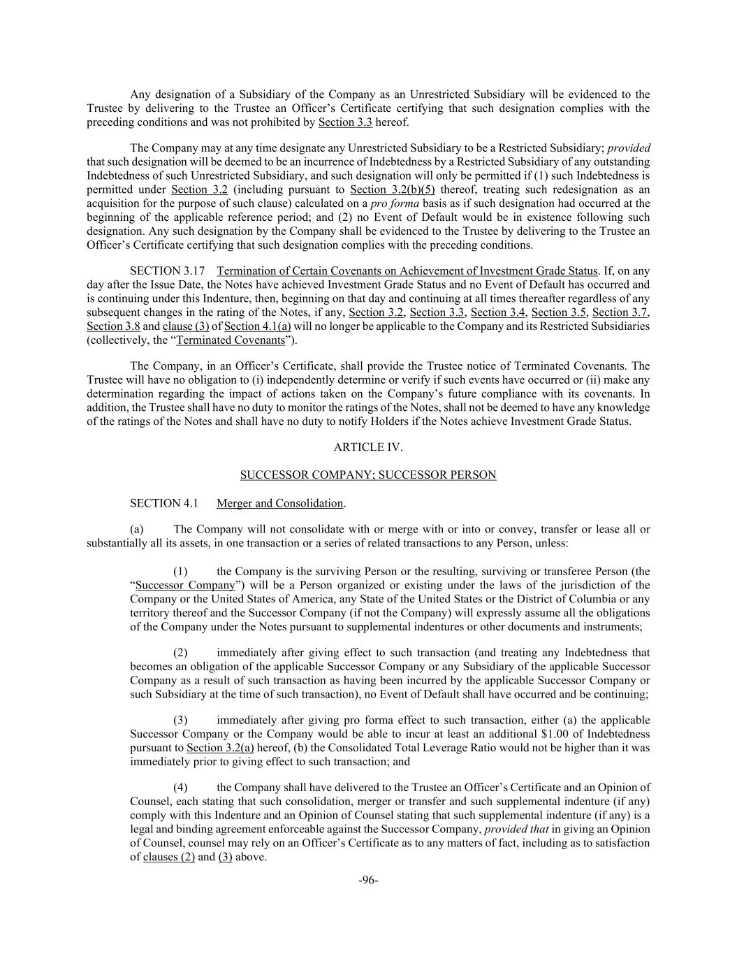 -96- Any designation of a Subsidiary of the Company as an Unrestricted Subsidiary will be evidenced to the Trustee by delivering to the Trustee an Officer’s Certificate certifying that such designation complies with the preceding conditions and was not prohibited by Section 3.3 hereof. The Company may at any time designate any Unrestricted Subsidiary to be a Restricted Subsidiary; provided that such designation will be deemed to be an incurrence of Indebtedness by a Restricted Subsidiary of any outstanding Indebtedness of such Unrestricted Subsidiary, and such designation will only be permitted if (1) such Indebtedness is permitted under Section 3.2 (including pursuant to Section 3.2(b)(5) thereof, treating such redesignation as an acquisition for the purpose of such clause) calculated on a pro forma basis as if such designation had occurred at the beginning of the applicable reference period; and (2) no Event of Default would be in existence following such designation. Any such designation by the Company shall be evidenced to the Trustee by delivering to the Trustee an Officer’s Certificate certifying that such designation complies with the preceding conditions. SECTION 3.17 Termination of Certain Covenants on Achievement of Investment Grade Status. If, on any day after the Issue Date, the Notes have achieved Investment Grade Status and no Event of Default has occurred and is continuing under this Indenture, then, beginning on that day and continuing at all times thereafter regardless of any subsequent changes in the rating of the Notes, if any, Section 3.2, Section 3.3, Section 3.4, Section 3.5, Section 3.7, Section 3.8 and clause (3) of Section 4.1(a) will no longer be applicable to the Company and its Restricted Subsidiaries (collectively, the “Terminated Covenants”). The Company, in an Officer’s Certificate, shall provide the Trustee notice of Terminated Covenants. The Trustee will have no obligation to (i) independently determine or verify if such events have occurred or (ii) make any determination regarding the impact of actions taken on the Company’s future compliance with its covenants. In addition, the Trustee shall have no duty to monitor the ratings of the Notes, shall not be deemed to have any knowledge of the ratings of the Notes and shall have no duty to notify Holders if the Notes achieve Investment Grade Status. ARTICLE IV. SUCCESSOR COMPANY; SUCCESSOR PERSON SECTION 4.1 Merger and Consolidation. (a) The Company will not consolidate with or merge with or into or convey, transfer or lease all or substantially all its assets, in one transaction or a series of related transactions to any Person, unless: (1) the Company is the surviving Person or the resulting, surviving or transferee Person (the “Successor Company”) will be a Person organized or existing under the laws of the jurisdiction of the Company or the United States of America, any State of the United States or the District of Columbia or any territory thereof and the Successor Company (if not the Company) will expressly assume all the obligations of the Company under the Notes pursuant to supplemental indentures or other documents and instruments; (2) immediately after giving effect to such transaction (and treating any Indebtedness that becomes an obligation of the applicable Successor Company or any Subsidiary of the applicable Successor Company as a result of such transaction as having been incurred by the applicable Successor Company or such Subsidiary at the time of such transaction), no Event of Default shall have occurred and be continuing; (3) immediately after giving pro forma effect to such transaction, either (a) the applicable Successor Company or the Company would be able to incur at least an additional $1.00 of Indebtedness pursuant to Section 3.2(a) hereof, (b) the Consolidated Total Leverage Ratio would not be higher than it was immediately prior to giving effect to such transaction; and (4) the Company shall have delivered to the Trustee an Officer’s Certificate and an Opinion of Counsel, each stating that such consolidation, merger or transfer and such supplemental indenture (if any) comply with this Indenture and an Opinion of Counsel stating that such supplemental indenture (if any) is a legal and binding agreement enforceable against the Successor Company, provided that in giving an Opinion of Counsel, counsel may rely on an Officer’s Certificate as to any matters of fact, including as to satisfaction of clauses (2) and (3) above.