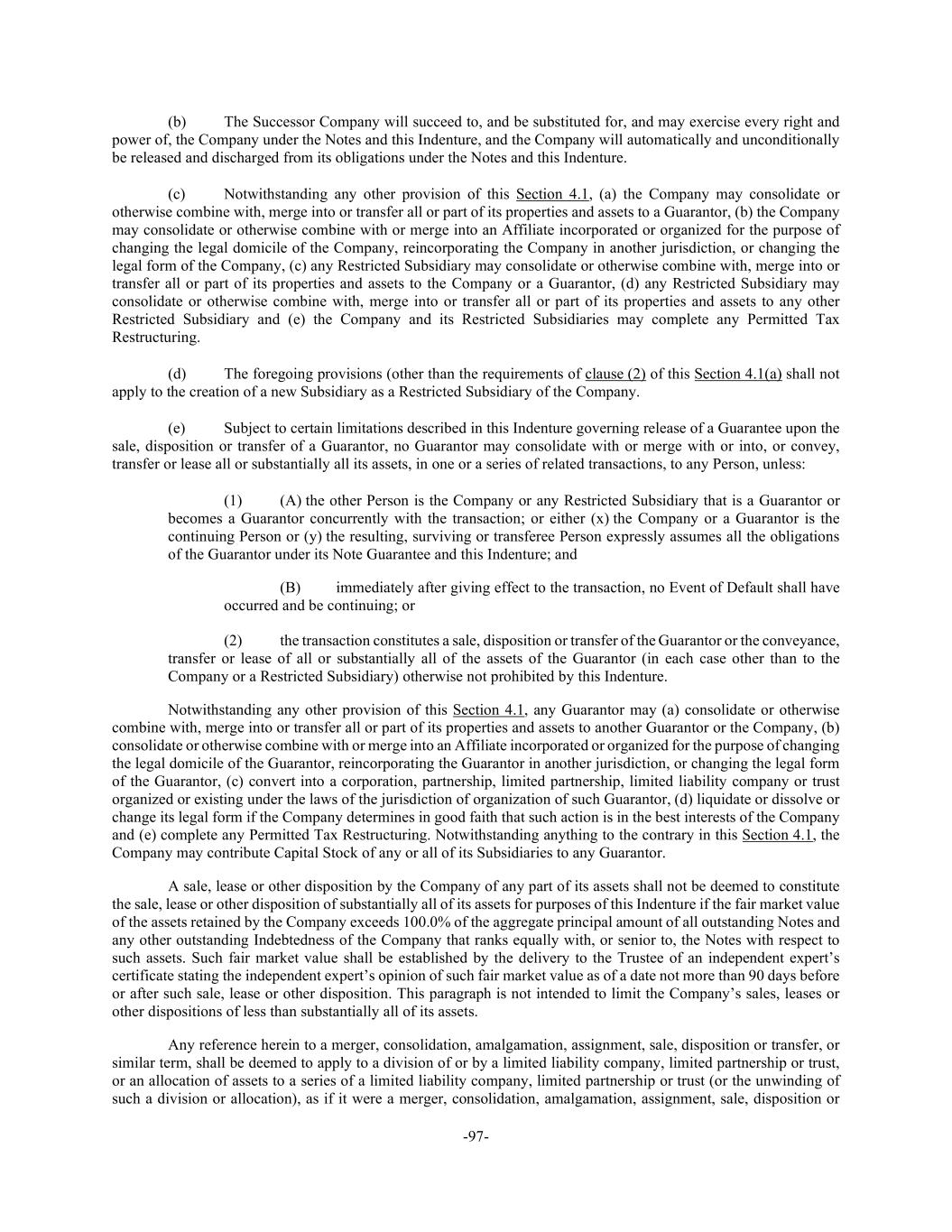 -97- (b) The Successor Company will succeed to, and be substituted for, and may exercise every right and power of, the Company under the Notes and this Indenture, and the Company will automatically and unconditionally be released and discharged from its obligations under the Notes and this Indenture. (c) Notwithstanding any other provision of this Section 4.1, (a) the Company may consolidate or otherwise combine with, merge into or transfer all or part of its properties and assets to a Guarantor, (b) the Company may consolidate or otherwise combine with or merge into an Affiliate incorporated or organized for the purpose of changing the legal domicile of the Company, reincorporating the Company in another jurisdiction, or changing the legal form of the Company, (c) any Restricted Subsidiary may consolidate or otherwise combine with, merge into or transfer all or part of its properties and assets to the Company or a Guarantor, (d) any Restricted Subsidiary may consolidate or otherwise combine with, merge into or transfer all or part of its properties and assets to any other Restricted Subsidiary and (e) the Company and its Restricted Subsidiaries may complete any Permitted Tax Restructuring. (d) The foregoing provisions (other than the requirements of clause (2) of this Section 4.1(a) shall not apply to the creation of a new Subsidiary as a Restricted Subsidiary of the Company. (e) Subject to certain limitations described in this Indenture governing release of a Guarantee upon the sale, disposition or transfer of a Guarantor, no Guarantor may consolidate with or merge with or into, or convey, transfer or lease all or substantially all its assets, in one or a series of related transactions, to any Person, unless: (1) (A) the other Person is the Company or any Restricted Subsidiary that is a Guarantor or becomes a Guarantor concurrently with the transaction; or either (x) the Company or a Guarantor is the continuing Person or (y) the resulting, surviving or transferee Person expressly assumes all the obligations of the Guarantor under its Note Guarantee and this Indenture; and (B) immediately after giving effect to the transaction, no Event of Default shall have occurred and be continuing; or (2) the transaction constitutes a sale, disposition or transfer of the Guarantor or the conveyance, transfer or lease of all or substantially all of the assets of the Guarantor (in each case other than to the Company or a Restricted Subsidiary) otherwise not prohibited by this Indenture. Notwithstanding any other provision of this Section 4.1, any Guarantor may (a) consolidate or otherwise combine with, merge into or transfer all or part of its properties and assets to another Guarantor or the Company, (b) consolidate or otherwise combine with or merge into an Affiliate incorporated or organized for the purpose of changing the legal domicile of the Guarantor, reincorporating the Guarantor in another jurisdiction, or changing the legal form of the Guarantor, (c) convert into a corporation, partnership, limited partnership, limited liability company or trust organized or existing under the laws of the jurisdiction of organization of such Guarantor, (d) liquidate or dissolve or change its legal form if the Company determines in good faith that such action is in the best interests of the Company and (e) complete any Permitted Tax Restructuring. Notwithstanding anything to the contrary in this Section 4.1, the Company may contribute Capital Stock of any or all of its Subsidiaries to any Guarantor. A sale, lease or other disposition by the Company of any part of its assets shall not be deemed to constitute the sale, lease or other disposition of substantially all of its assets for purposes of this Indenture if the fair market value of the assets retained by the Company exceeds 100.0% of the aggregate principal amount of all outstanding Notes and any other outstanding Indebtedness of the Company that ranks equally with, or senior to, the Notes with respect to such assets. Such fair market value shall be established by the delivery to the Trustee of an independent expert’s certificate stating the independent expert’s opinion of such fair market value as of a date not more than 90 days before or after such sale, lease or other disposition. This paragraph is not intended to limit the Company’s sales, leases or other dispositions of less than substantially all of its assets. Any reference herein to a merger, consolidation, amalgamation, assignment, sale, disposition or transfer, or similar term, shall be deemed to apply to a division of or by a limited liability company, limited partnership or trust, or an allocation of assets to a series of a limited liability company, limited partnership or trust (or the unwinding of such a division or allocation), as if it were a merger, consolidation, amalgamation, assignment, sale, disposition or