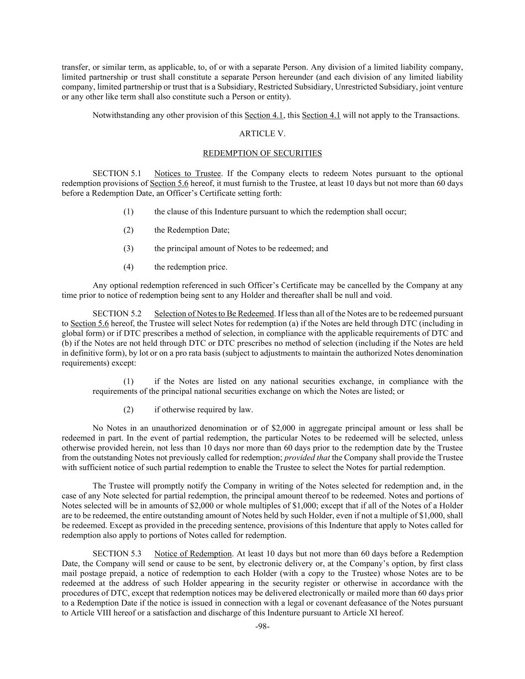 -98- transfer, or similar term, as applicable, to, of or with a separate Person. Any division of a limited liability company, limited partnership or trust shall constitute a separate Person hereunder (and each division of any limited liability company, limited partnership or trust that is a Subsidiary, Restricted Subsidiary, Unrestricted Subsidiary, joint venture or any other like term shall also constitute such a Person or entity). Notwithstanding any other provision of this Section 4.1, this Section 4.1 will not apply to the Transactions. ARTICLE V. REDEMPTION OF SECURITIES SECTION 5.1 Notices to Trustee. If the Company elects to redeem Notes pursuant to the optional redemption provisions of Section 5.6 hereof, it must furnish to the Trustee, at least 10 days but not more than 60 days before a Redemption Date, an Officer’s Certificate setting forth: (1) the clause of this Indenture pursuant to which the redemption shall occur; (2) the Redemption Date; (3) the principal amount of Notes to be redeemed; and (4) the redemption price. Any optional redemption referenced in such Officer’s Certificate may be cancelled by the Company at any time prior to notice of redemption being sent to any Holder and thereafter shall be null and void. SECTION 5.2 Selection of Notes to Be Redeemed. If less than all of the Notes are to be redeemed pursuant to Section 5.6 hereof, the Trustee will select Notes for redemption (a) if the Notes are held through DTC (including in global form) or if DTC prescribes a method of selection, in compliance with the applicable requirements of DTC and (b) if the Notes are not held through DTC or DTC prescribes no method of selection (including if the Notes are held in definitive form), by lot or on a pro rata basis (subject to adjustments to maintain the authorized Notes denomination requirements) except: (1) if the Notes are listed on any national securities exchange, in compliance with the requirements of the principal national securities exchange on which the Notes are listed; or (2) if otherwise required by law. No Notes in an unauthorized denomination or of $2,000 in aggregate principal amount or less shall be redeemed in part. In the event of partial redemption, the particular Notes to be redeemed will be selected, unless otherwise provided herein, not less than 10 days nor more than 60 days prior to the redemption date by the Trustee from the outstanding Notes not previously called for redemption; provided that the Company shall provide the Trustee with sufficient notice of such partial redemption to enable the Trustee to select the Notes for partial redemption. The Trustee will promptly notify the Company in writing of the Notes selected for redemption and, in the case of any Note selected for partial redemption, the principal amount thereof to be redeemed. Notes and portions of Notes selected will be in amounts of $2,000 or whole multiples of $1,000; except that if all of the Notes of a Holder are to be redeemed, the entire outstanding amount of Notes held by such Holder, even if not a multiple of $1,000, shall be redeemed. Except as provided in the preceding sentence, provisions of this Indenture that apply to Notes called for redemption also apply to portions of Notes called for redemption. SECTION 5.3 Notice of Redemption. At least 10 days but not more than 60 days before a Redemption Date, the Company will send or cause to be sent, by electronic delivery or, at the Company’s option, by first class mail postage prepaid, a notice of redemption to each Holder (with a copy to the Trustee) whose Notes are to be redeemed at the address of such Holder appearing in the security register or otherwise in accordance with the procedures of DTC, except that redemption notices may be delivered electronically or mailed more than 60 days prior to a Redemption Date if the notice is issued in connection with a legal or covenant defeasance of the Notes pursuant to Article VIII hereof or a satisfaction and discharge of this Indenture pursuant to Article XI hereof.