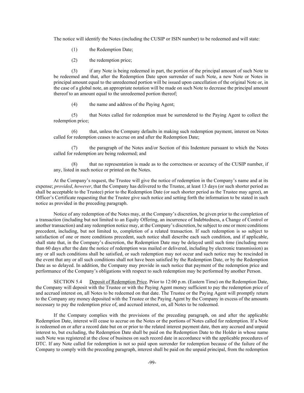-99- The notice will identify the Notes (including the CUSIP or ISIN number) to be redeemed and will state: (1) the Redemption Date; (2) the redemption price; (3) if any Note is being redeemed in part, the portion of the principal amount of such Note to be redeemed and that, after the Redemption Date upon surrender of such Note, a new Note or Notes in principal amount equal to the unredeemed portion will be issued upon cancellation of the original Note or, in the case of a global note, an appropriate notation will be made on such Note to decrease the principal amount thereof to an amount equal to the unredeemed portion thereof; (4) the name and address of the Paying Agent; (5) that Notes called for redemption must be surrendered to the Paying Agent to collect the redemption price; (6) that, unless the Company defaults in making such redemption payment, interest on Notes called for redemption ceases to accrue on and after the Redemption Date; (7) the paragraph of the Notes and/or Section of this Indenture pursuant to which the Notes called for redemption are being redeemed; and (8) that no representation is made as to the correctness or accuracy of the CUSIP number, if any, listed in such notice or printed on the Notes. At the Company’s request, the Trustee will give the notice of redemption in the Company’s name and at its expense; provided, however, that the Company has delivered to the Trustee, at least 13 days (or such shorter period as shall be acceptable to the Trustee) prior to the Redemption Date (or such shorter period as the Trustee may agree), an Officer’s Certificate requesting that the Trustee give such notice and setting forth the information to be stated in such notice as provided in the preceding paragraph. Notice of any redemption of the Notes may, at the Company’s discretion, be given prior to the completion of a transaction (including but not limited to an Equity Offering, an incurrence of Indebtedness, a Change of Control or another transaction) and any redemption notice may, at the Company’s discretion, be subject to one or more conditions precedent, including, but not limited to, completion of a related transaction. If such redemption is so subject to satisfaction of one or more conditions precedent, such notice shall describe each such condition, and if applicable, shall state that, in the Company’s discretion, the Redemption Date may be delayed until such time (including more than 60 days after the date the notice of redemption was mailed or delivered, including by electronic transmission) as any or all such conditions shall be satisfied, or such redemption may not occur and such notice may be rescinded in the event that any or all such conditions shall not have been satisfied by the Redemption Date, or by the Redemption Date as so delayed. In addition, the Company may provide in such notice that payment of the redemption price and performance of the Company’s obligations with respect to such redemption may be performed by another Person. SECTION 5.4 Deposit of Redemption Price. Prior to 12:00 p.m. (Eastern Time) on the Redemption Date, the Company will deposit with the Trustee or with the Paying Agent money sufficient to pay the redemption price of and accrued interest on, all Notes to be redeemed on that date. The Trustee or the Paying Agent will promptly return to the Company any money deposited with the Trustee or the Paying Agent by the Company in excess of the amounts necessary to pay the redemption price of, and accrued interest, on, all Notes to be redeemed. If the Company complies with the provisions of the preceding paragraph, on and after the applicable Redemption Date, interest will cease to accrue on the Notes or the portions of Notes called for redemption. If a Note is redeemed on or after a record date but on or prior to the related interest payment date, then any accrued and unpaid interest to, but excluding, the Redemption Date shall be paid on the Redemption Date to the Holder in whose name such Note was registered at the close of business on such record date in accordance with the applicable procedures of DTC. If any Note called for redemption is not so paid upon surrender for redemption because of the failure of the Company to comply with the preceding paragraph, interest shall be paid on the unpaid principal, from the redemption