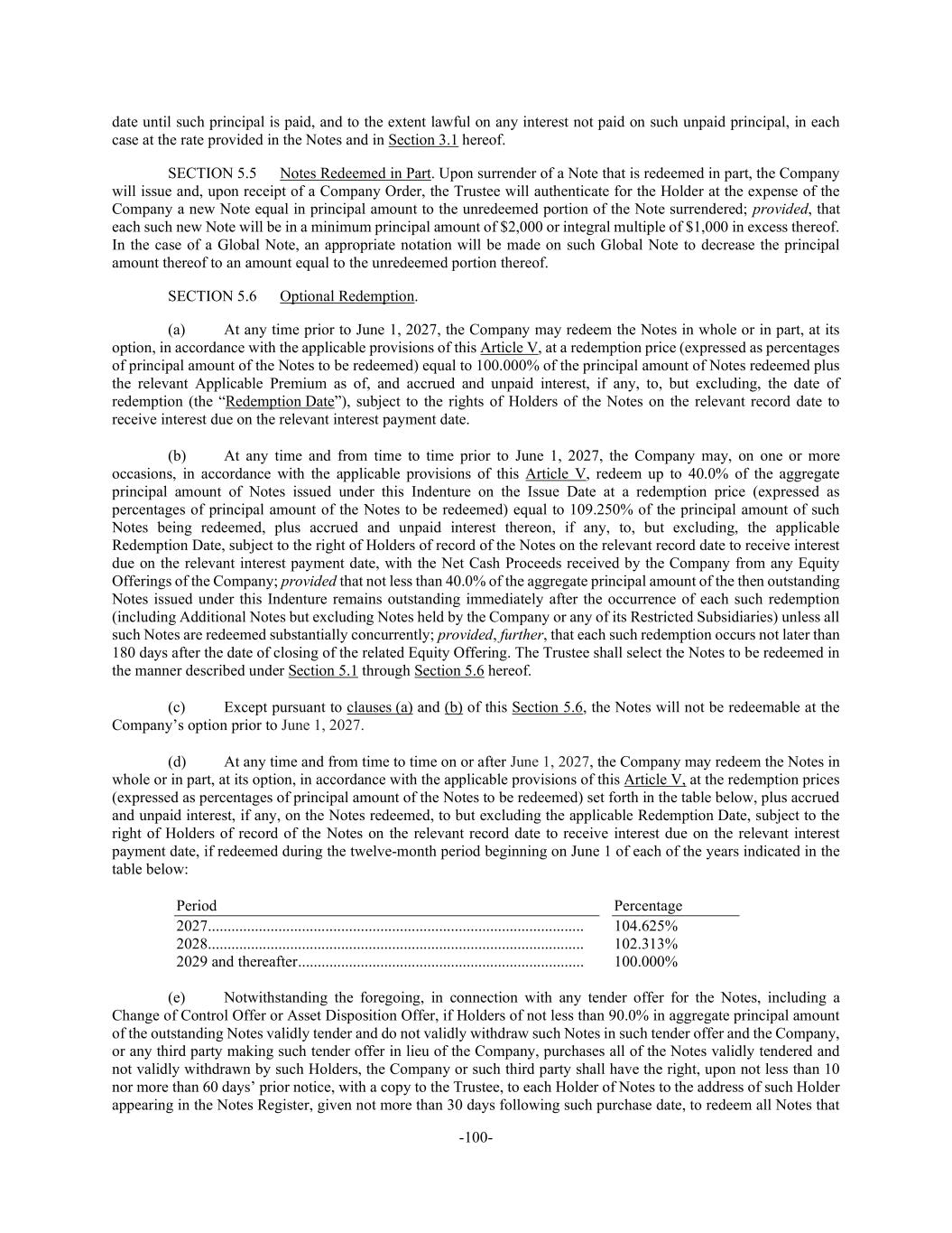-100- date until such principal is paid, and to the extent lawful on any interest not paid on such unpaid principal, in each case at the rate provided in the Notes and in Section 3.1 hereof. SECTION 5.5 Notes Redeemed in Part. Upon surrender of a Note that is redeemed in part, the Company will issue and, upon receipt of a Company Order, the Trustee will authenticate for the Holder at the expense of the Company a new Note equal in principal amount to the unredeemed portion of the Note surrendered; provided, that each such new Note will be in a minimum principal amount of $2,000 or integral multiple of $1,000 in excess thereof. In the case of a Global Note, an appropriate notation will be made on such Global Note to decrease the principal amount thereof to an amount equal to the unredeemed portion thereof. SECTION 5.6 Optional Redemption. (a) At any time prior to June 1, 2027, the Company may redeem the Notes in whole or in part, at its option, in accordance with the applicable provisions of this Article V, at a redemption price (expressed as percentages of principal amount of the Notes to be redeemed) equal to 100.000% of the principal amount of Notes redeemed plus the relevant Applicable Premium as of, and accrued and unpaid interest, if any, to, but excluding, the date of redemption (the “Redemption Date”), subject to the rights of Holders of the Notes on the relevant record date to receive interest due on the relevant interest payment date. (b) At any time and from time to time prior to June 1, 2027, the Company may, on one or more occasions, in accordance with the applicable provisions of this Article V, redeem up to 40.0% of the aggregate principal amount of Notes issued under this Indenture on the Issue Date at a redemption price (expressed as percentages of principal amount of the Notes to be redeemed) equal to 109.250% of the principal amount of such Notes being redeemed, plus accrued and unpaid interest thereon, if any, to, but excluding, the applicable Redemption Date, subject to the right of Holders of record of the Notes on the relevant record date to receive interest due on the relevant interest payment date, with the Net Cash Proceeds received by the Company from any Equity Offerings of the Company; provided that not less than 40.0% of the aggregate principal amount of the then outstanding Notes issued under this Indenture remains outstanding immediately after the occurrence of each such redemption (including Additional Notes but excluding Notes held by the Company or any of its Restricted Subsidiaries) unless all such Notes are redeemed substantially concurrently; provided, further, that each such redemption occurs not later than 180 days after the date of closing of the related Equity Offering. The Trustee shall select the Notes to be redeemed in the manner described under Section 5.1 through Section 5.6 hereof. (c) Except pursuant to clauses (a) and (b) of this Section 5.6, the Notes will not be redeemable at the Company’s option prior to June 1, 2027. (d) At any time and from time to time on or after June 1, 2027, the Company may redeem the Notes in whole or in part, at its option, in accordance with the applicable provisions of this Article V, at the redemption prices (expressed as percentages of principal amount of the Notes to be redeemed) set forth in the table below, plus accrued and unpaid interest, if any, on the Notes redeemed, to but excluding the applicable Redemption Date, subject to the right of Holders of record of the Notes on the relevant record date to receive interest due on the relevant interest payment date, if redeemed during the twelve-month period beginning on June 1 of each of the years indicated in the table below: Period Percentage 2027 ................................................................................................ 104.625% 2028 ................................................................................................ 102.313% 2029 and thereafter ......................................................................... 100.000% (e) Notwithstanding the foregoing, in connection with any tender offer for the Notes, including a Change of Control Offer or Asset Disposition Offer, if Holders of not less than 90.0% in aggregate principal amount of the outstanding Notes validly tender and do not validly withdraw such Notes in such tender offer and the Company, or any third party making such tender offer in lieu of the Company, purchases all of the Notes validly tendered and not validly withdrawn by such Holders, the Company or such third party shall have the right, upon not less than 10 nor more than 60 days’ prior notice, with a copy to the Trustee, to each Holder of Notes to the address of such Holder appearing in the Notes Register, given not more than 30 days following such purchase date, to redeem all Notes that