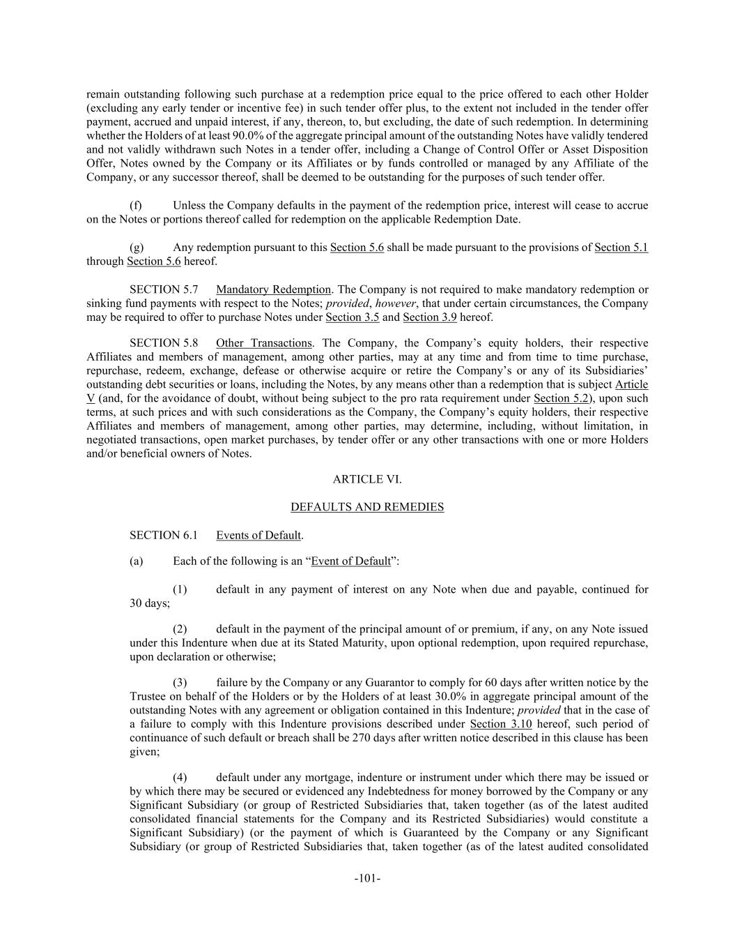 -101- remain outstanding following such purchase at a redemption price equal to the price offered to each other Holder (excluding any early tender or incentive fee) in such tender offer plus, to the extent not included in the tender offer payment, accrued and unpaid interest, if any, thereon, to, but excluding, the date of such redemption. In determining whether the Holders of at least 90.0% of the aggregate principal amount of the outstanding Notes have validly tendered and not validly withdrawn such Notes in a tender offer, including a Change of Control Offer or Asset Disposition Offer, Notes owned by the Company or its Affiliates or by funds controlled or managed by any Affiliate of the Company, or any successor thereof, shall be deemed to be outstanding for the purposes of such tender offer. (f) Unless the Company defaults in the payment of the redemption price, interest will cease to accrue on the Notes or portions thereof called for redemption on the applicable Redemption Date. (g) Any redemption pursuant to this Section 5.6 shall be made pursuant to the provisions of Section 5.1 through Section 5.6 hereof. SECTION 5.7 Mandatory Redemption. The Company is not required to make mandatory redemption or sinking fund payments with respect to the Notes; provided, however, that under certain circumstances, the Company may be required to offer to purchase Notes under Section 3.5 and Section 3.9 hereof. SECTION 5.8 Other Transactions. The Company, the Company’s equity holders, their respective Affiliates and members of management, among other parties, may at any time and from time to time purchase, repurchase, redeem, exchange, defease or otherwise acquire or retire the Company’s or any of its Subsidiaries’ outstanding debt securities or loans, including the Notes, by any means other than a redemption that is subject Article V (and, for the avoidance of doubt, without being subject to the pro rata requirement under Section 5.2), upon such terms, at such prices and with such considerations as the Company, the Company’s equity holders, their respective Affiliates and members of management, among other parties, may determine, including, without limitation, in negotiated transactions, open market purchases, by tender offer or any other transactions with one or more Holders and/or beneficial owners of Notes. ARTICLE VI. DEFAULTS AND REMEDIES SECTION 6.1 Events of Default. (a) Each of the following is an “Event of Default”: (1) default in any payment of interest on any Note when due and payable, continued for 30 days; (2) default in the payment of the principal amount of or premium, if any, on any Note issued under this Indenture when due at its Stated Maturity, upon optional redemption, upon required repurchase, upon declaration or otherwise; (3) failure by the Company or any Guarantor to comply for 60 days after written notice by the Trustee on behalf of the Holders or by the Holders of at least 30.0% in aggregate principal amount of the outstanding Notes with any agreement or obligation contained in this Indenture; provided that in the case of a failure to comply with this Indenture provisions described under Section 3.10 hereof, such period of continuance of such default or breach shall be 270 days after written notice described in this clause has been given; (4) default under any mortgage, indenture or instrument under which there may be issued or by which there may be secured or evidenced any Indebtedness for money borrowed by the Company or any Significant Subsidiary (or group of Restricted Subsidiaries that, taken together (as of the latest audited consolidated financial statements for the Company and its Restricted Subsidiaries) would constitute a Significant Subsidiary) (or the payment of which is Guaranteed by the Company or any Significant Subsidiary (or group of Restricted Subsidiaries that, taken together (as of the latest audited consolidated