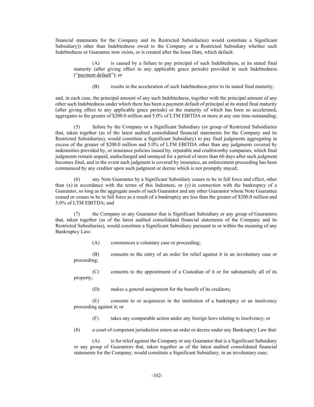 -102- financial statements for the Company and its Restricted Subsidiaries) would constitute a Significant Subsidiary)) other than Indebtedness owed to the Company or a Restricted Subsidiary whether such Indebtedness or Guarantee now exists, or is created after the Issue Date, which default: (A) is caused by a failure to pay principal of such Indebtedness, at its stated final maturity (after giving effect to any applicable grace periods) provided in such Indebtedness (“payment default”); or (B) results in the acceleration of such Indebtedness prior to its stated final maturity; and, in each case, the principal amount of any such Indebtedness, together with the principal amount of any other such Indebtedness under which there has been a payment default of principal at its stated final maturity (after giving effect to any applicable grace periods) or the maturity of which has been so accelerated, aggregates to the greater of $200.0 million and 5.0% of LTM EBITDA or more at any one time outstanding; (5) failure by the Company or a Significant Subsidiary (or group of Restricted Subsidiaries that, taken together (as of the latest audited consolidated financial statements for the Company and its Restricted Subsidiaries), would constitute a Significant Subsidiary) to pay final judgments aggregating in excess of the greater of $200.0 million and 5.0% of LTM EBITDA other than any judgments covered by indemnities provided by, or insurance policies issued by, reputable and creditworthy companies, which final judgments remain unpaid, undischarged and unstayed for a period of more than 60 days after such judgment becomes final, and in the event such judgment is covered by insurance, an enforcement proceeding has been commenced by any creditor upon such judgment or decree which is not promptly stayed; (6) any Note Guarantee by a Significant Subsidiary ceases to be in full force and effect, other than (x) in accordance with the terms of this Indenture, or (y) in connection with the bankruptcy of a Guarantor, so long as the aggregate assets of such Guarantor and any other Guarantor whose Note Guarantee ceased or ceases to be in full force as a result of a bankruptcy are less than the greater of $200.0 million and 5.0% of LTM EBITDA; and (7) the Company or any Guarantor that is Significant Subsidiary or any group of Guarantors that, taken together (as of the latest audited consolidated financial statements of the Company and its Restricted Subsidiaries), would constitute a Significant Subsidiary pursuant to or within the meaning of any Bankruptcy Law: (A) commences a voluntary case or proceeding; (B) consents to the entry of an order for relief against it in an involuntary case or proceeding; (C) consents to the appointment of a Custodian of it or for substantially all of its property; (D) makes a general assignment for the benefit of its creditors; (E) consents to or acquiesces in the institution of a bankruptcy or an insolvency proceeding against it; or (F) takes any comparable action under any foreign laws relating to insolvency; or (8) a court of competent jurisdiction enters an order or decree under any Bankruptcy Law that: (A) is for relief against the Company or any Guarantor that is a Significant Subsidiary or any group of Guarantors that, taken together as of the latest audited consolidated financial statements for the Company, would constitute a Significant Subsidiary, in an involuntary case;