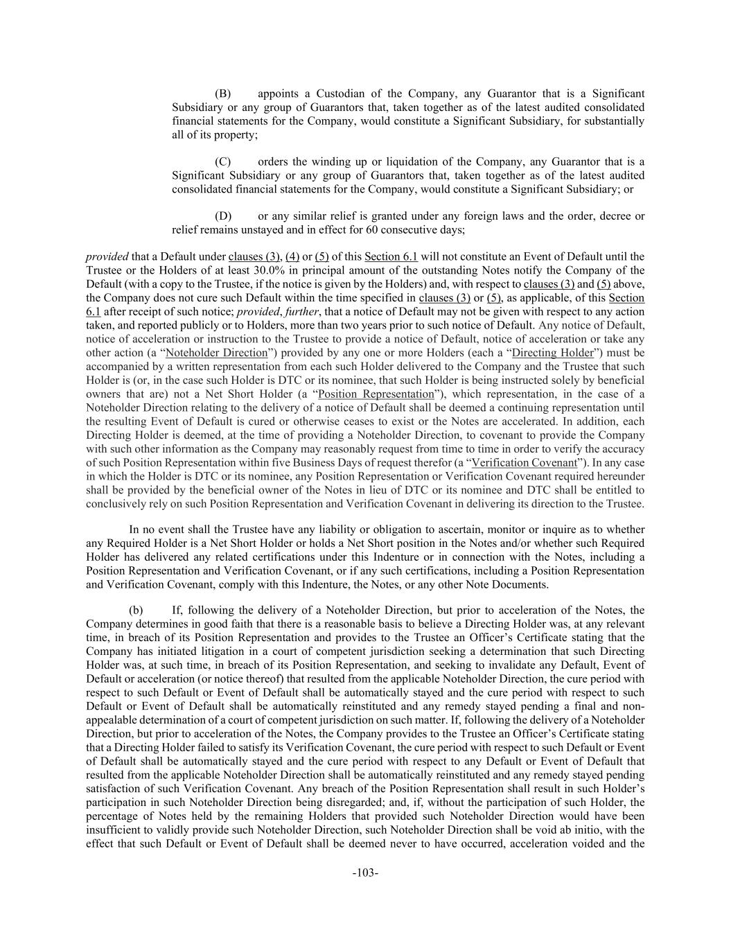 -103- (B) appoints a Custodian of the Company, any Guarantor that is a Significant Subsidiary or any group of Guarantors that, taken together as of the latest audited consolidated financial statements for the Company, would constitute a Significant Subsidiary, for substantially all of its property; (C) orders the winding up or liquidation of the Company, any Guarantor that is a Significant Subsidiary or any group of Guarantors that, taken together as of the latest audited consolidated financial statements for the Company, would constitute a Significant Subsidiary; or (D) or any similar relief is granted under any foreign laws and the order, decree or relief remains unstayed and in effect for 60 consecutive days; provided that a Default under clauses (3), (4) or (5) of this Section 6.1 will not constitute an Event of Default until the Trustee or the Holders of at least 30.0% in principal amount of the outstanding Notes notify the Company of the Default (with a copy to the Trustee, if the notice is given by the Holders) and, with respect to clauses (3) and (5) above, the Company does not cure such Default within the time specified in clauses (3) or (5), as applicable, of this Section 6.1 after receipt of such notice; provided, further, that a notice of Default may not be given with respect to any action taken, and reported publicly or to Holders, more than two years prior to such notice of Default. Any notice of Default, notice of acceleration or instruction to the Trustee to provide a notice of Default, notice of acceleration or take any other action (a “Noteholder Direction”) provided by any one or more Holders (each a “Directing Holder”) must be accompanied by a written representation from each such Holder delivered to the Company and the Trustee that such Holder is (or, in the case such Holder is DTC or its nominee, that such Holder is being instructed solely by beneficial owners that are) not a Net Short Holder (a “Position Representation”), which representation, in the case of a Noteholder Direction relating to the delivery of a notice of Default shall be deemed a continuing representation until the resulting Event of Default is cured or otherwise ceases to exist or the Notes are accelerated. In addition, each Directing Holder is deemed, at the time of providing a Noteholder Direction, to covenant to provide the Company with such other information as the Company may reasonably request from time to time in order to verify the accuracy of such Position Representation within five Business Days of request therefor (a “Verification Covenant”). In any case in which the Holder is DTC or its nominee, any Position Representation or Verification Covenant required hereunder shall be provided by the beneficial owner of the Notes in lieu of DTC or its nominee and DTC shall be entitled to conclusively rely on such Position Representation and Verification Covenant in delivering its direction to the Trustee. In no event shall the Trustee have any liability or obligation to ascertain, monitor or inquire as to whether any Required Holder is a Net Short Holder or holds a Net Short position in the Notes and/or whether such Required Holder has delivered any related certifications under this Indenture or in connection with the Notes, including a Position Representation and Verification Covenant, or if any such certifications, including a Position Representation and Verification Covenant, comply with this Indenture, the Notes, or any other Note Documents. (b) If, following the delivery of a Noteholder Direction, but prior to acceleration of the Notes, the Company determines in good faith that there is a reasonable basis to believe a Directing Holder was, at any relevant time, in breach of its Position Representation and provides to the Trustee an Officer’s Certificate stating that the Company has initiated litigation in a court of competent jurisdiction seeking a determination that such Directing Holder was, at such time, in breach of its Position Representation, and seeking to invalidate any Default, Event of Default or acceleration (or notice thereof) that resulted from the applicable Noteholder Direction, the cure period with respect to such Default or Event of Default shall be automatically stayed and the cure period with respect to such Default or Event of Default shall be automatically reinstituted and any remedy stayed pending a final and non- appealable determination of a court of competent jurisdiction on such matter. If, following the delivery of a Noteholder Direction, but prior to acceleration of the Notes, the Company provides to the Trustee an Officer’s Certificate stating that a Directing Holder failed to satisfy its Verification Covenant, the cure period with respect to such Default or Event of Default shall be automatically stayed and the cure period with respect to any Default or Event of Default that resulted from the applicable Noteholder Direction shall be automatically reinstituted and any remedy stayed pending satisfaction of such Verification Covenant. Any breach of the Position Representation shall result in such Holder’s participation in such Noteholder Direction being disregarded; and, if, without the participation of such Holder, the percentage of Notes held by the remaining Holders that provided such Noteholder Direction would have been insufficient to validly provide such Noteholder Direction, such Noteholder Direction shall be void ab initio, with the effect that such Default or Event of Default shall be deemed never to have occurred, acceleration voided and the