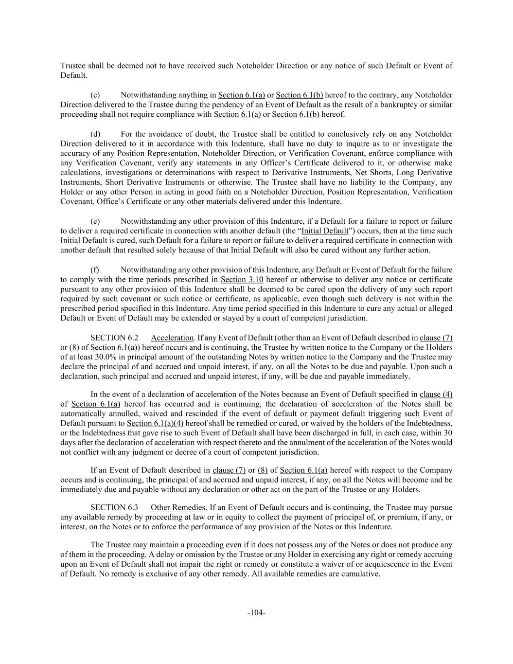 -104- Trustee shall be deemed not to have received such Noteholder Direction or any notice of such Default or Event of Default. (c) Notwithstanding anything in Section 6.1(a) or Section 6.1(b) hereof to the contrary, any Noteholder Direction delivered to the Trustee during the pendency of an Event of Default as the result of a bankruptcy or similar proceeding shall not require compliance with Section 6.1(a) or Section 6.1(b) hereof. (d) For the avoidance of doubt, the Trustee shall be entitled to conclusively rely on any Noteholder Direction delivered to it in accordance with this Indenture, shall have no duty to inquire as to or investigate the accuracy of any Position Representation, Noteholder Direction, or Verification Covenant, enforce compliance with any Verification Covenant, verify any statements in any Officer’s Certificate delivered to it, or otherwise make calculations, investigations or determinations with respect to Derivative Instruments, Net Shorts, Long Derivative Instruments, Short Derivative Instruments or otherwise. The Trustee shall have no liability to the Company, any Holder or any other Person in acting in good faith on a Noteholder Direction, Position Representation, Verification Covenant, Office’s Certificate or any other materials delivered under this Indenture. (e) Notwithstanding any other provision of this Indenture, if a Default for a failure to report or failure to deliver a required certificate in connection with another default (the “Initial Default”) occurs, then at the time such Initial Default is cured, such Default for a failure to report or failure to deliver a required certificate in connection with another default that resulted solely because of that Initial Default will also be cured without any further action. (f) Notwithstanding any other provision of this Indenture, any Default or Event of Default for the failure to comply with the time periods prescribed in Section 3.10 hereof or otherwise to deliver any notice or certificate pursuant to any other provision of this Indenture shall be deemed to be cured upon the delivery of any such report required by such covenant or such notice or certificate, as applicable, even though such delivery is not within the prescribed period specified in this Indenture. Any time period specified in this Indenture to cure any actual or alleged Default or Event of Default may be extended or stayed by a court of competent jurisdiction. SECTION 6.2 Acceleration. If any Event of Default (other than an Event of Default described in clause (7) or (8) of Section 6.1(a)) hereof occurs and is continuing, the Trustee by written notice to the Company or the Holders of at least 30.0% in principal amount of the outstanding Notes by written notice to the Company and the Trustee may declare the principal of and accrued and unpaid interest, if any, on all the Notes to be due and payable. Upon such a declaration, such principal and accrued and unpaid interest, if any, will be due and payable immediately. In the event of a declaration of acceleration of the Notes because an Event of Default specified in clause (4) of Section 6.1(a) hereof has occurred and is continuing, the declaration of acceleration of the Notes shall be automatically annulled, waived and rescinded if the event of default or payment default triggering such Event of Default pursuant to Section 6.1(a)(4) hereof shall be remedied or cured, or waived by the holders of the Indebtedness, or the Indebtedness that gave rise to such Event of Default shall have been discharged in full, in each case, within 30 days after the declaration of acceleration with respect thereto and the annulment of the acceleration of the Notes would not conflict with any judgment or decree of a court of competent jurisdiction. If an Event of Default described in clause (7) or (8) of Section 6.1(a) hereof with respect to the Company occurs and is continuing, the principal of and accrued and unpaid interest, if any, on all the Notes will become and be immediately due and payable without any declaration or other act on the part of the Trustee or any Holders. SECTION 6.3 Other Remedies. If an Event of Default occurs and is continuing, the Trustee may pursue any available remedy by proceeding at law or in equity to collect the payment of principal of, or premium, if any, or interest, on the Notes or to enforce the performance of any provision of the Notes or this Indenture. The Trustee may maintain a proceeding even if it does not possess any of the Notes or does not produce any of them in the proceeding. A delay or omission by the Trustee or any Holder in exercising any right or remedy accruing upon an Event of Default shall not impair the right or remedy or constitute a waiver of or acquiescence in the Event of Default. No remedy is exclusive of any other remedy. All available remedies are cumulative.