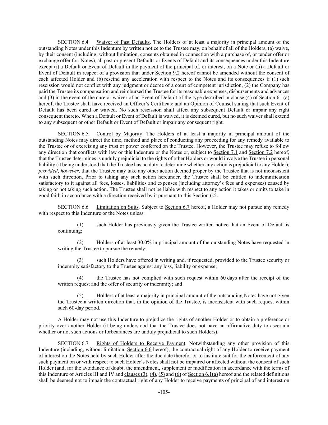 -105- SECTION 6.4 Waiver of Past Defaults. The Holders of at least a majority in principal amount of the outstanding Notes under this Indenture by written notice to the Trustee may, on behalf of all of the Holders, (a) waive, by their consent (including, without limitation, consents obtained in connection with a purchase of, or tender offer or exchange offer for, Notes), all past or present Defaults or Events of Default and its consequences under this Indenture except (i) a Default or Event of Default in the payment of the principal of, or interest, on a Note or (ii) a Default or Event of Default in respect of a provision that under Section 9.2 hereof cannot be amended without the consent of each affected Holder and (b) rescind any acceleration with respect to the Notes and its consequences if (1) such rescission would not conflict with any judgment or decree of a court of competent jurisdiction, (2) the Company has paid the Trustee its compensation and reimbursed the Trustee for its reasonable expenses, disbursements and advances and (3) in the event of the cure or waiver of an Event of Default of the type described in clause (4) of Section 6.1(a) hereof, the Trustee shall have received an Officer’s Certificate and an Opinion of Counsel stating that such Event of Default has been cured or waived. No such rescission shall affect any subsequent Default or impair any right consequent thereto. When a Default or Event of Default is waived, it is deemed cured, but no such waiver shall extend to any subsequent or other Default or Event of Default or impair any consequent right. SECTION 6.5 Control by Majority. The Holders of at least a majority in principal amount of the outstanding Notes may direct the time, method and place of conducting any proceeding for any remedy available to the Trustee or of exercising any trust or power conferred on the Trustee. However, the Trustee may refuse to follow any direction that conflicts with law or this Indenture or the Notes or, subject to Section 7.1 and Section 7.2 hereof, that the Trustee determines is unduly prejudicial to the rights of other Holders or would involve the Trustee in personal liability (it being understood that the Trustee has no duty to determine whether any action is prejudicial to any Holder); provided, however, that the Trustee may take any other action deemed proper by the Trustee that is not inconsistent with such direction. Prior to taking any such action hereunder, the Trustee shall be entitled to indemnification satisfactory to it against all fees, losses, liabilities and expenses (including attorney’s fees and expenses) caused by taking or not taking such action. The Trustee shall not be liable with respect to any action it takes or omits to take in good faith in accordance with a direction received by it pursuant to this Section 6.5. SECTION 6.6 Limitation on Suits. Subject to Section 6.7 hereof, a Holder may not pursue any remedy with respect to this Indenture or the Notes unless: (1) such Holder has previously given the Trustee written notice that an Event of Default is continuing; (2) Holders of at least 30.0% in principal amount of the outstanding Notes have requested in writing the Trustee to pursue the remedy; (3) such Holders have offered in writing and, if requested, provided to the Trustee security or indemnity satisfactory to the Trustee against any loss, liability or expense; (4) the Trustee has not complied with such request within 60 days after the receipt of the written request and the offer of security or indemnity; and (5) Holders of at least a majority in principal amount of the outstanding Notes have not given the Trustee a written direction that, in the opinion of the Trustee, is inconsistent with such request within such 60-day period. A Holder may not use this Indenture to prejudice the rights of another Holder or to obtain a preference or priority over another Holder (it being understood that the Trustee does not have an affirmative duty to ascertain whether or not such actions or forbearances are unduly prejudicial to such Holders). SECTION 6.7 Rights of Holders to Receive Payment. Notwithstanding any other provision of this Indenture (including, without limitation, Section 6.6 hereof), the contractual right of any Holder to receive payment of interest on the Notes held by such Holder after the due date therefor or to institute suit for the enforcement of any such payment on or with respect to such Holder’s Notes shall not be impaired or affected without the consent of such Holder (and, for the avoidance of doubt, the amendment, supplement or modification in accordance with the terms of this Indenture of Articles III and IV and clauses (3), (4), (5) and (6) of Section 6.1(a) hereof and the related definitions shall be deemed not to impair the contractual right of any Holder to receive payments of principal of and interest on