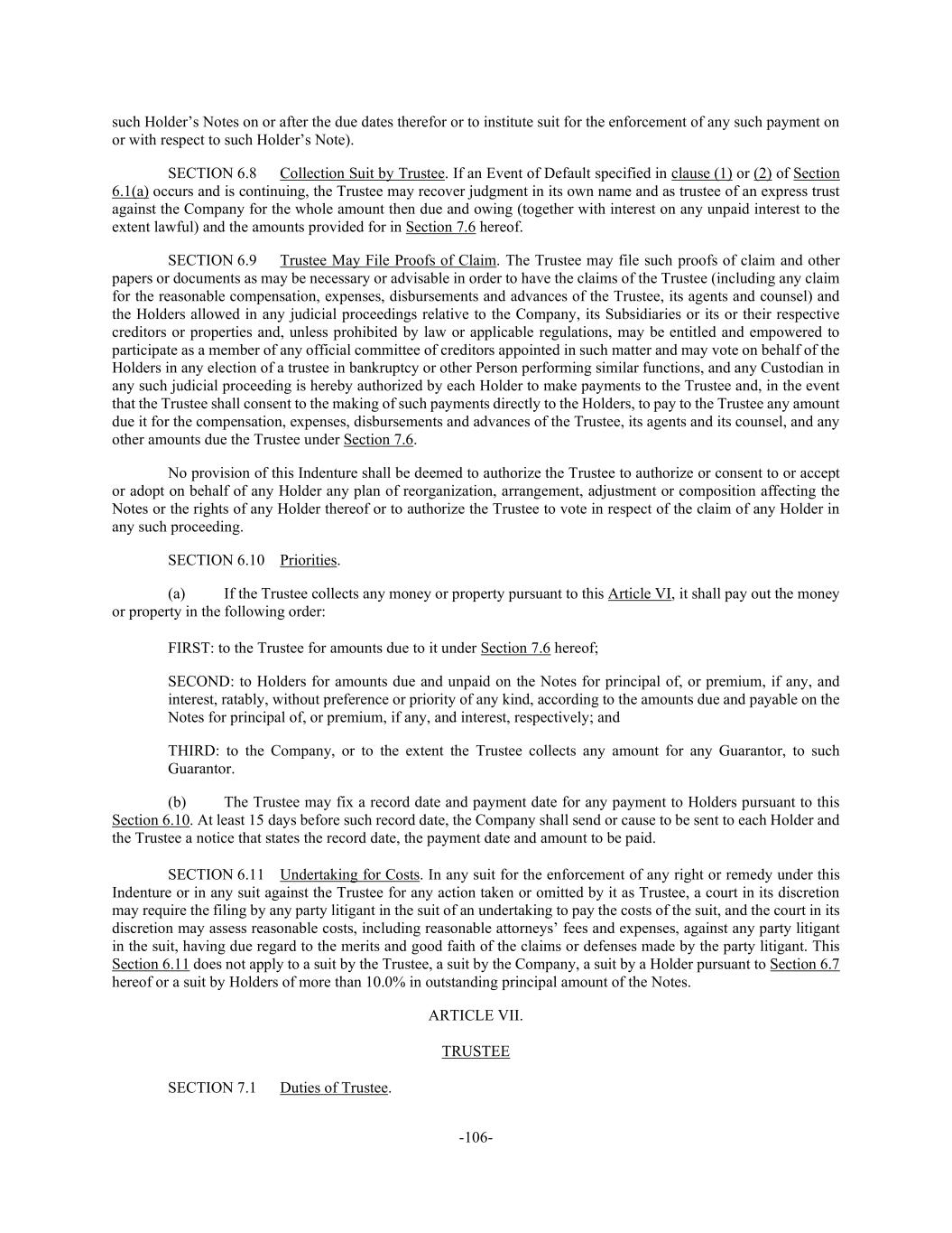 -106- such Holder’s Notes on or after the due dates therefor or to institute suit for the enforcement of any such payment on or with respect to such Holder’s Note). SECTION 6.8 Collection Suit by Trustee. If an Event of Default specified in clause (1) or (2) of Section 6.1(a) occurs and is continuing, the Trustee may recover judgment in its own name and as trustee of an express trust against the Company for the whole amount then due and owing (together with interest on any unpaid interest to the extent lawful) and the amounts provided for in Section 7.6 hereof. SECTION 6.9 Trustee May File Proofs of Claim. The Trustee may file such proofs of claim and other papers or documents as may be necessary or advisable in order to have the claims of the Trustee (including any claim for the reasonable compensation, expenses, disbursements and advances of the Trustee, its agents and counsel) and the Holders allowed in any judicial proceedings relative to the Company, its Subsidiaries or its or their respective creditors or properties and, unless prohibited by law or applicable regulations, may be entitled and empowered to participate as a member of any official committee of creditors appointed in such matter and may vote on behalf of the Holders in any election of a trustee in bankruptcy or other Person performing similar functions, and any Custodian in any such judicial proceeding is hereby authorized by each Holder to make payments to the Trustee and, in the event that the Trustee shall consent to the making of such payments directly to the Holders, to pay to the Trustee any amount due it for the compensation, expenses, disbursements and advances of the Trustee, its agents and its counsel, and any other amounts due the Trustee under Section 7.6. No provision of this Indenture shall be deemed to authorize the Trustee to authorize or consent to or accept or adopt on behalf of any Holder any plan of reorganization, arrangement, adjustment or composition affecting the Notes or the rights of any Holder thereof or to authorize the Trustee to vote in respect of the claim of any Holder in any such proceeding. SECTION 6.10 Priorities. (a) If the Trustee collects any money or property pursuant to this Article VI, it shall pay out the money or property in the following order: FIRST: to the Trustee for amounts due to it under Section 7.6 hereof; SECOND: to Holders for amounts due and unpaid on the Notes for principal of, or premium, if any, and interest, ratably, without preference or priority of any kind, according to the amounts due and payable on the Notes for principal of, or premium, if any, and interest, respectively; and THIRD: to the Company, or to the extent the Trustee collects any amount for any Guarantor, to such Guarantor. (b) The Trustee may fix a record date and payment date for any payment to Holders pursuant to this Section 6.10. At least 15 days before such record date, the Company shall send or cause to be sent to each Holder and the Trustee a notice that states the record date, the payment date and amount to be paid. SECTION 6.11 Undertaking for Costs. In any suit for the enforcement of any right or remedy under this Indenture or in any suit against the Trustee for any action taken or omitted by it as Trustee, a court in its discretion may require the filing by any party litigant in the suit of an undertaking to pay the costs of the suit, and the court in its discretion may assess reasonable costs, including reasonable attorneys’ fees and expenses, against any party litigant in the suit, having due regard to the merits and good faith of the claims or defenses made by the party litigant. This Section 6.11 does not apply to a suit by the Trustee, a suit by the Company, a suit by a Holder pursuant to Section 6.7 hereof or a suit by Holders of more than 10.0% in outstanding principal amount of the Notes. ARTICLE VII. TRUSTEE SECTION 7.1 Duties of Trustee.