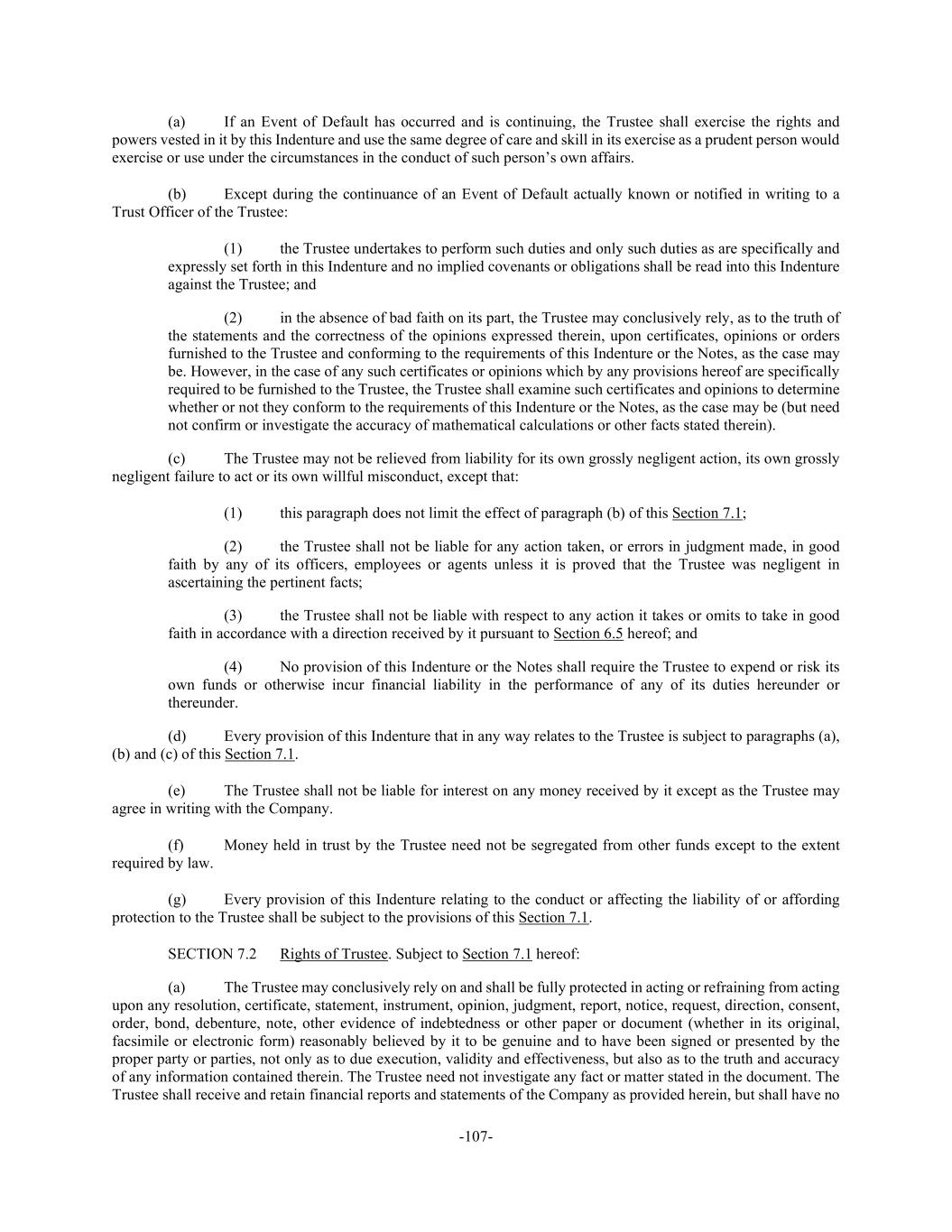 -107- (a) If an Event of Default has occurred and is continuing, the Trustee shall exercise the rights and powers vested in it by this Indenture and use the same degree of care and skill in its exercise as a prudent person would exercise or use under the circumstances in the conduct of such person’s own affairs. (b) Except during the continuance of an Event of Default actually known or notified in writing to a Trust Officer of the Trustee: (1) the Trustee undertakes to perform such duties and only such duties as are specifically and expressly set forth in this Indenture and no implied covenants or obligations shall be read into this Indenture against the Trustee; and (2) in the absence of bad faith on its part, the Trustee may conclusively rely, as to the truth of the statements and the correctness of the opinions expressed therein, upon certificates, opinions or orders furnished to the Trustee and conforming to the requirements of this Indenture or the Notes, as the case may be. However, in the case of any such certificates or opinions which by any provisions hereof are specifically required to be furnished to the Trustee, the Trustee shall examine such certificates and opinions to determine whether or not they conform to the requirements of this Indenture or the Notes, as the case may be (but need not confirm or investigate the accuracy of mathematical calculations or other facts stated therein). (c) The Trustee may not be relieved from liability for its own grossly negligent action, its own grossly negligent failure to act or its own willful misconduct, except that: (1) this paragraph does not limit the effect of paragraph (b) of this Section 7.1; (2) the Trustee shall not be liable for any action taken, or errors in judgment made, in good faith by any of its officers, employees or agents unless it is proved that the Trustee was negligent in ascertaining the pertinent facts; (3) the Trustee shall not be liable with respect to any action it takes or omits to take in good faith in accordance with a direction received by it pursuant to Section 6.5 hereof; and (4) No provision of this Indenture or the Notes shall require the Trustee to expend or risk its own funds or otherwise incur financial liability in the performance of any of its duties hereunder or thereunder. (d) Every provision of this Indenture that in any way relates to the Trustee is subject to paragraphs (a), (b) and (c) of this Section 7.1. (e) The Trustee shall not be liable for interest on any money received by it except as the Trustee may agree in writing with the Company. (f) Money held in trust by the Trustee need not be segregated from other funds except to the extent required by law. (g) Every provision of this Indenture relating to the conduct or affecting the liability of or affording protection to the Trustee shall be subject to the provisions of this Section 7.1. SECTION 7.2 Rights of Trustee. Subject to Section 7.1 hereof: (a) The Trustee may conclusively rely on and shall be fully protected in acting or refraining from acting upon any resolution, certificate, statement, instrument, opinion, judgment, report, notice, request, direction, consent, order, bond, debenture, note, other evidence of indebtedness or other paper or document (whether in its original, facsimile or electronic form) reasonably believed by it to be genuine and to have been signed or presented by the proper party or parties, not only as to due execution, validity and effectiveness, but also as to the truth and accuracy of any information contained therein. The Trustee need not investigate any fact or matter stated in the document. The Trustee shall receive and retain financial reports and statements of the Company as provided herein, but shall have no